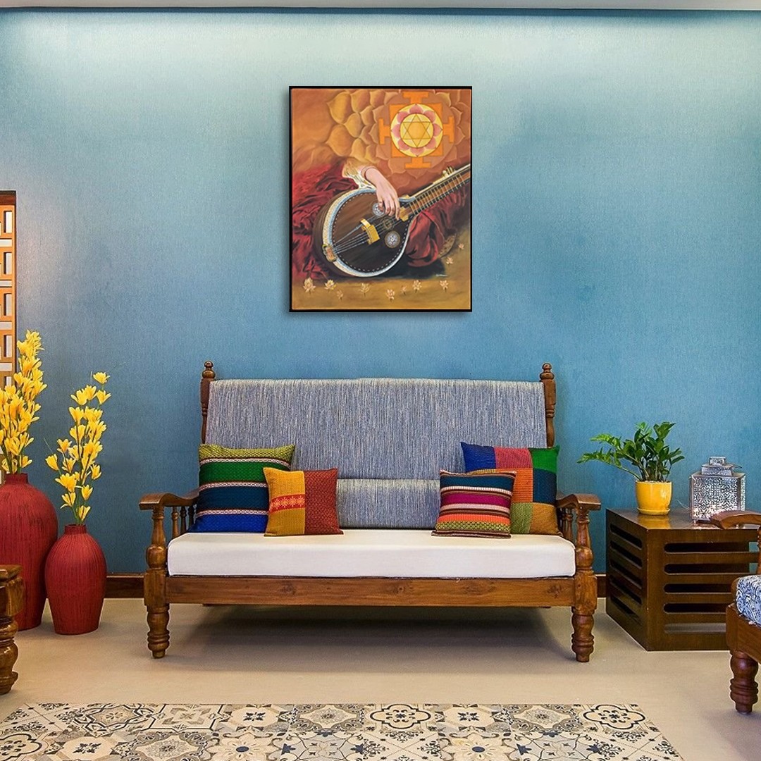 "Aarna" is a tale, blending the divine resonance of Veena, the sacred geometry of Lakshmi Yantra, and the purity of Padmas. Executed with meticulous detail and acrylic finesse on canvas, this painting transcends the visual to invoke a spiritual journey. Each stroke narrates a tale of cosmic harmony, where the Veena's strings resonate with Yantra's precision, and Padmas bloom in celestial synchrony. Dive into the ethereal realm of "Aarna," where art becomes a gateway to spiritual elevation.