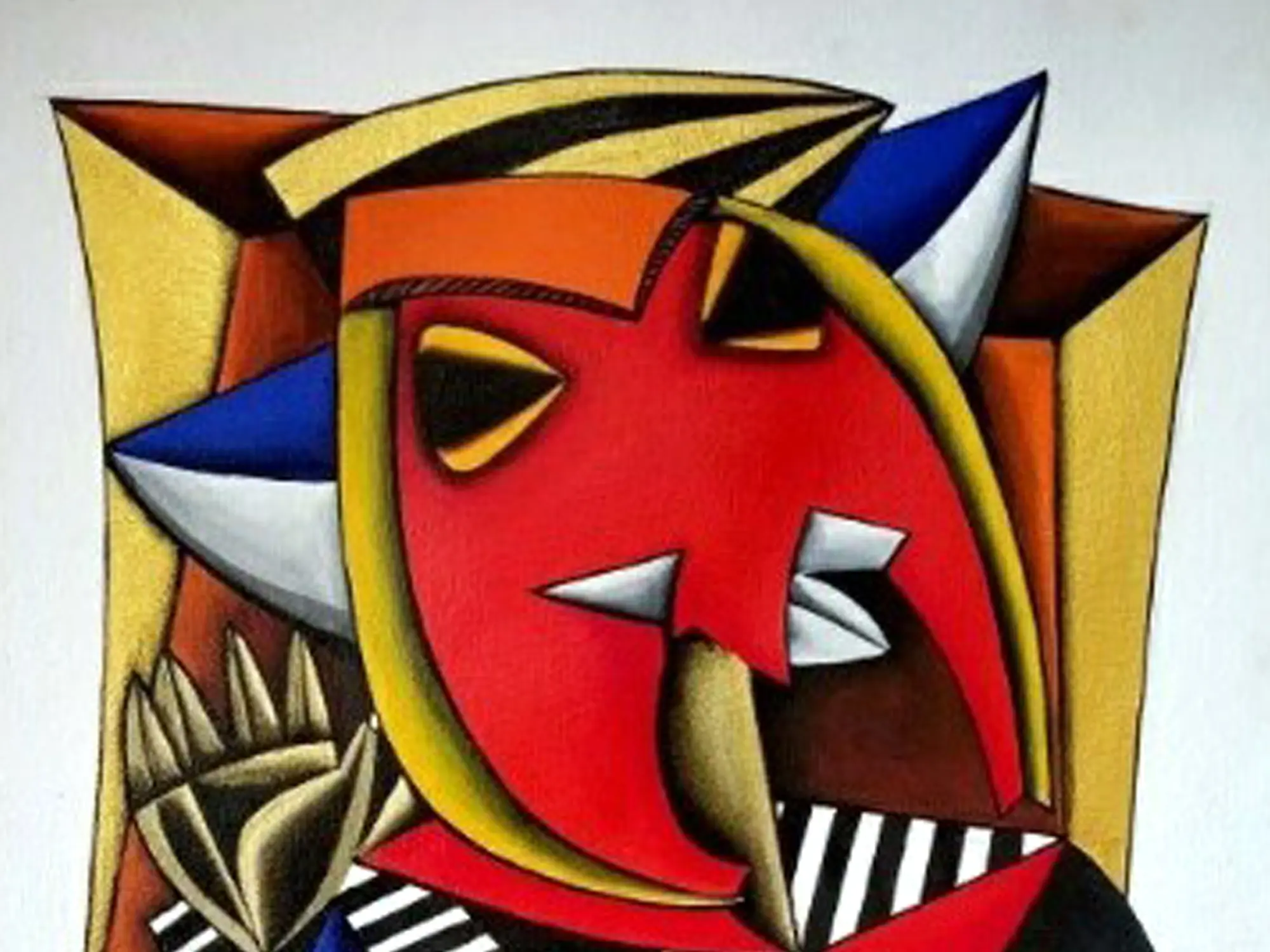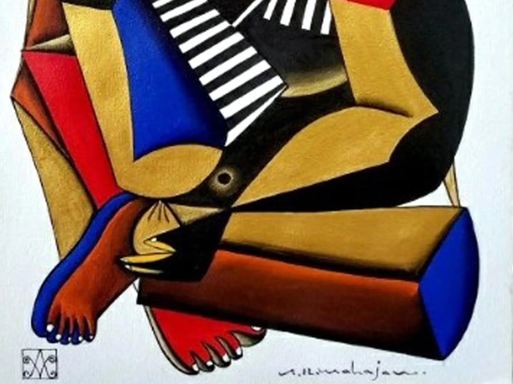 The dynamic interplay of geometric shapes and flowing lines creates a unique visual language that is both modern and timeless. Bold swathes of crimson, deep blues, and rich golds are juxtaposed with striking black and white patterns, generating a captivating energy. The overall composition, measuring 22 inches in height and 15 inches in width, is thoughtfully balanced, offering a sense of movement and profound depth that engages the eye.