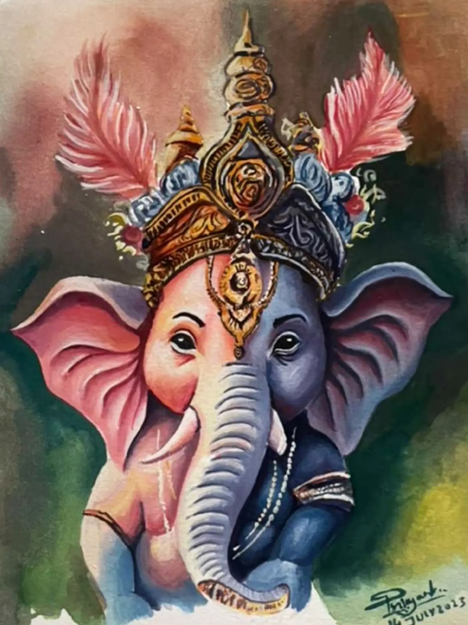 This endearing painting by Priyanka captures Lord Ganesha in an irresistibly cute form, radiating joy and warmth. The artist adeptly portrays Ganesha's charming demeanor, with chubby cheeks and a playful expression that invokes a sense of innocence and divine grace. In Indian art, Lord Ganesha is revered as the remover of obstacles and the harbinger of good fortune. His image is widely used to symbolize auspicious beginnings and prosperity.