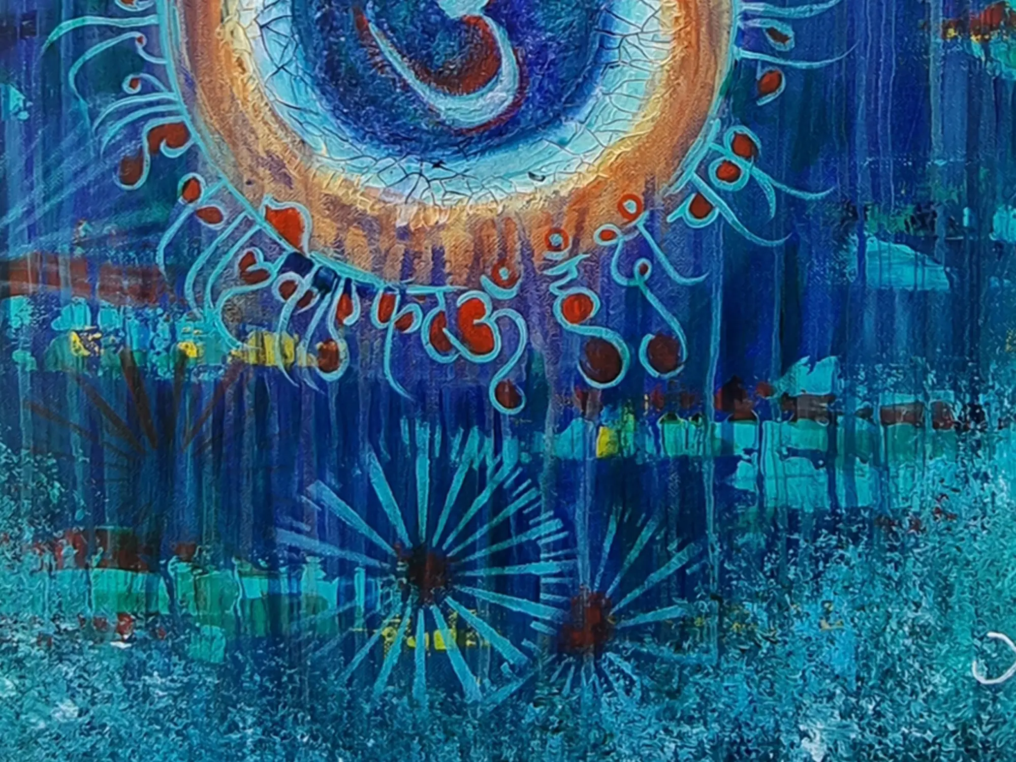 Presented within a clean, minimalist wood frame, the artwork measures a substantial 24 by 24 inches, commanding attention without overpowering your environment. The vibrant palette, dominated by deep blues and invigorating teals, creates an atmosphere of calm yet dynamic energy. Delicate calligraphic elements and radiant sunburst motifs dance across the canvas, drawing the eye into the central, symbolic depiction.