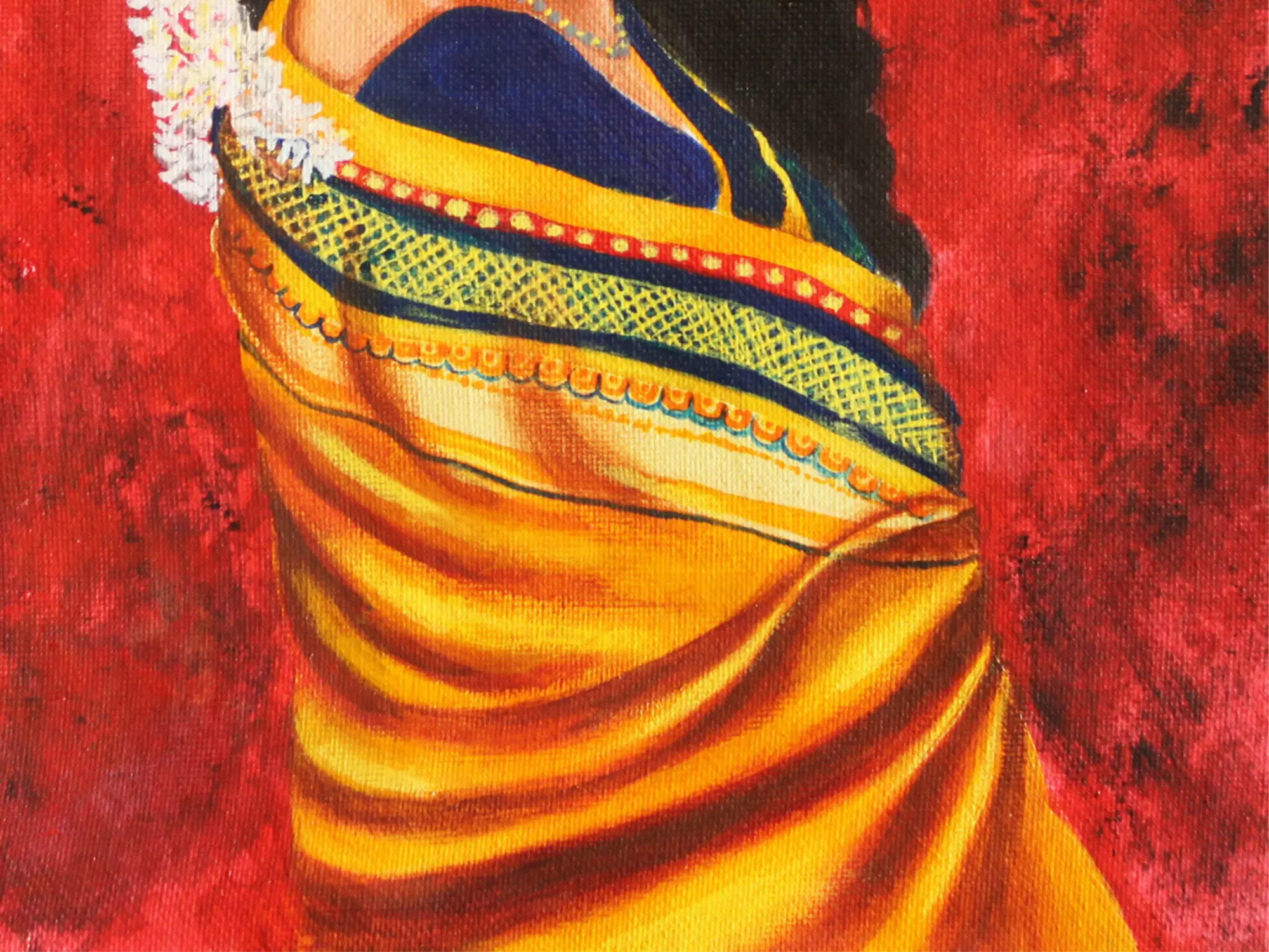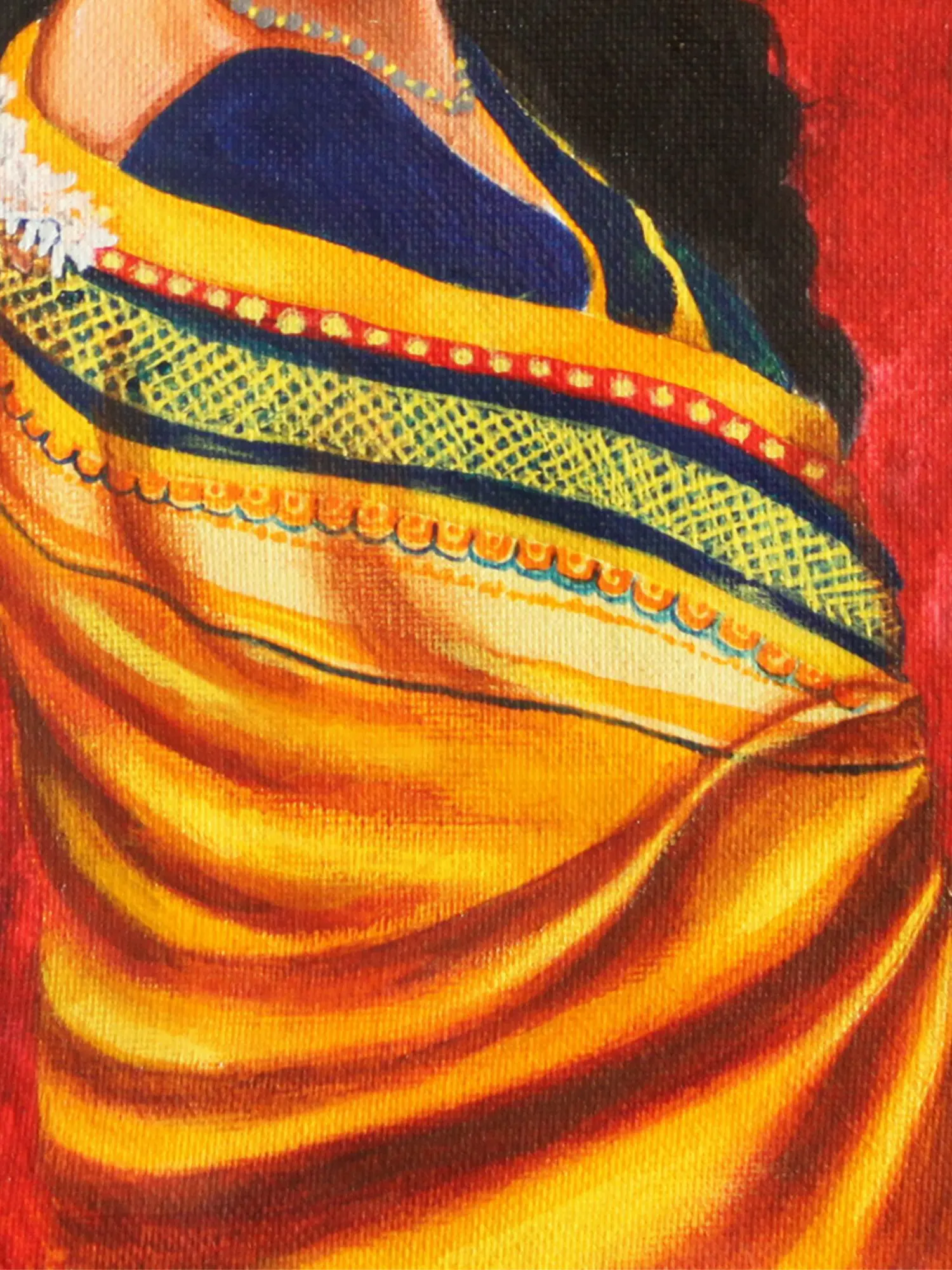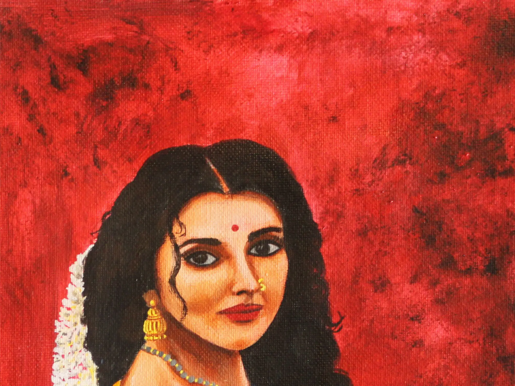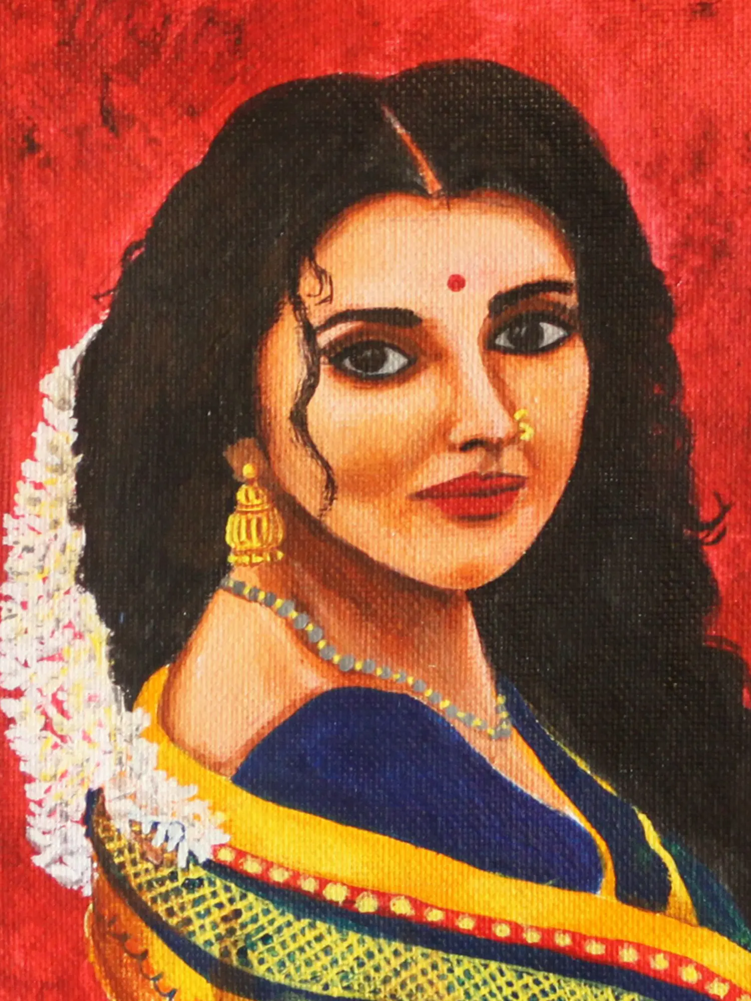 Indulge in the timeless allure of traditional adornment Suhag Shringar, a stunning acrylic painting on mounted canvas that celebrates the artistry of Indian aesthetic finery. From the sparkling jewels to her full gajra, every detail is rendered with exquisite precision and finesse, capturing the opulence and elegance of the bridal trousseau. The artist's masterful use of colour and composition evokes a sense of celebration and joy.