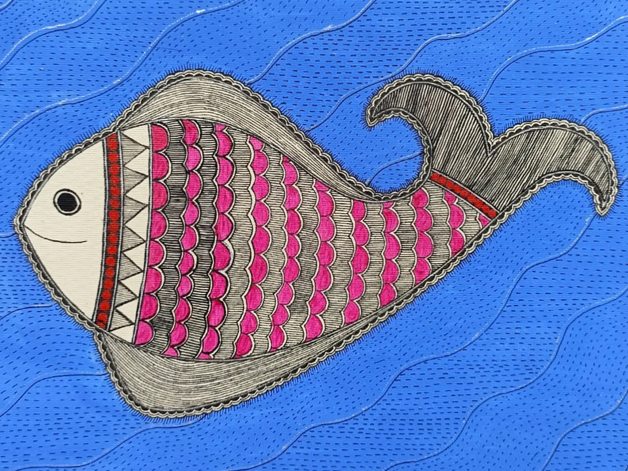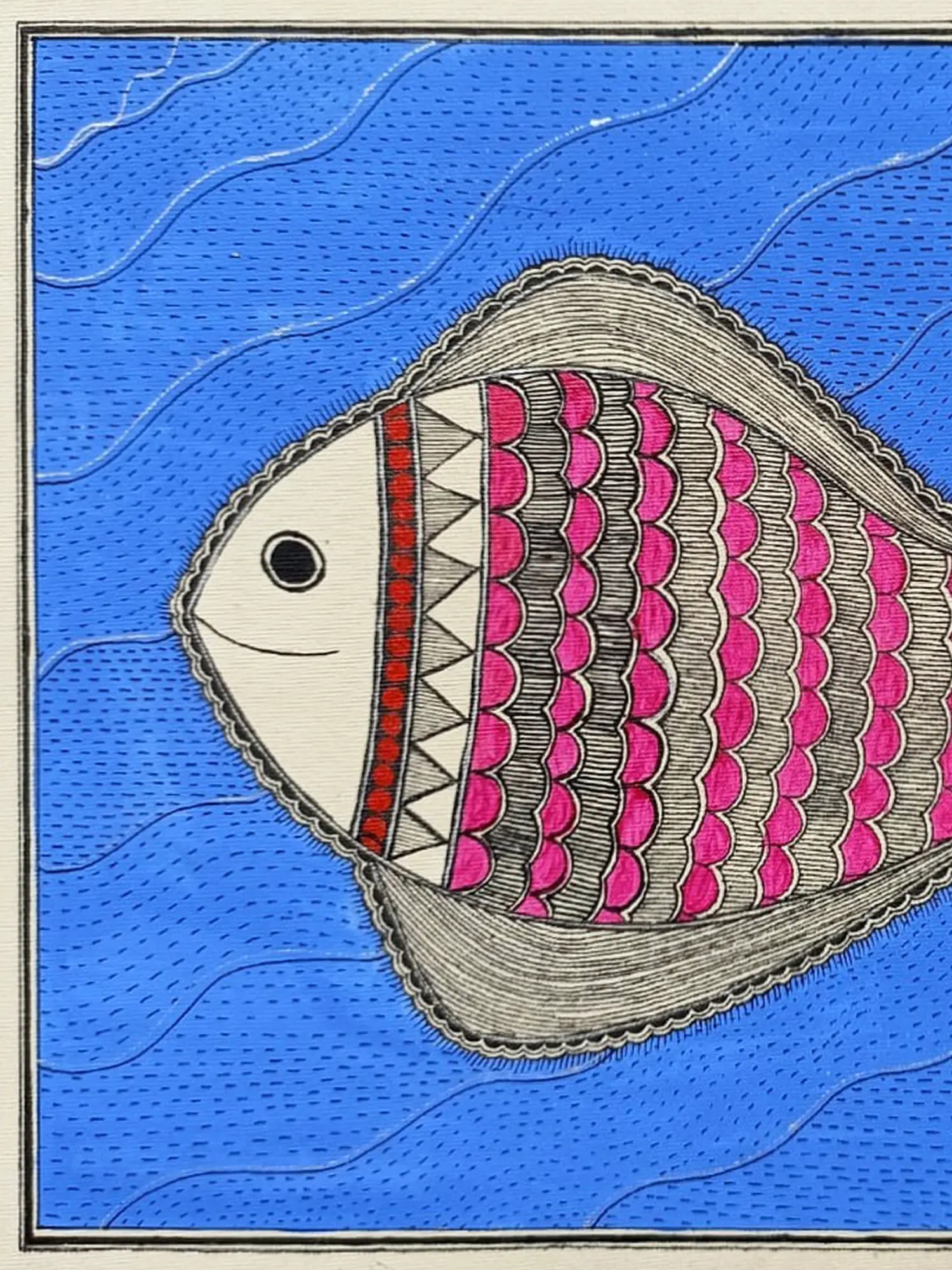 The Madhubani technique, with its intricate detailing, transforms the lone fish into a symbol of beauty, prosperity, and spiritual depth, resonating with the rich cultural and symbolic traditions of Indian folk art.