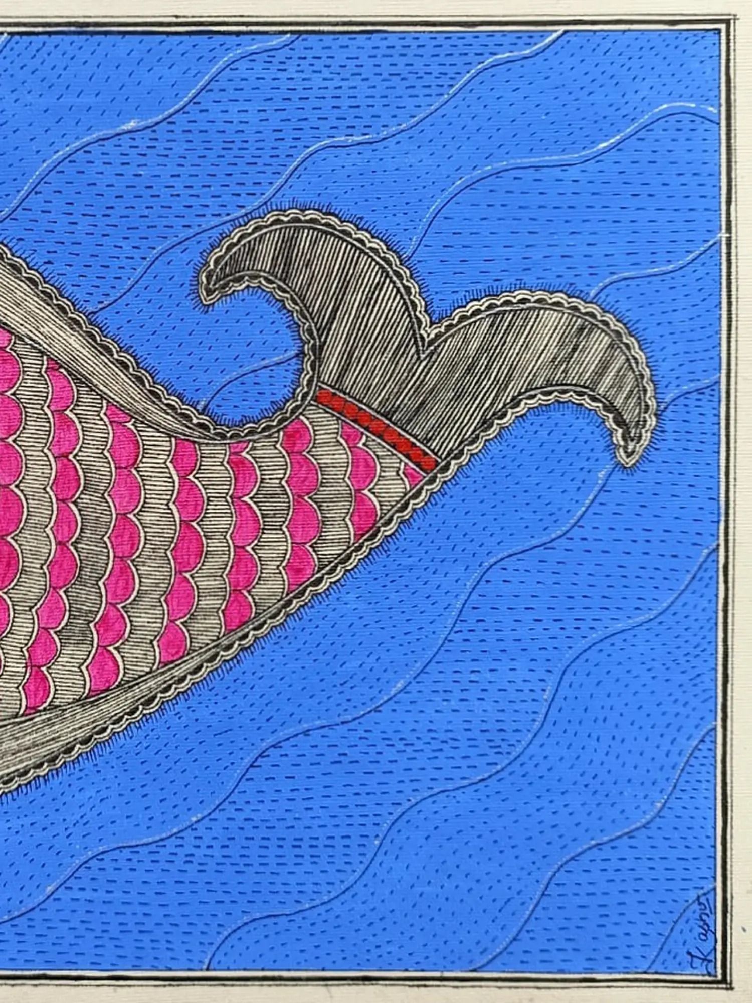 In Indian folk art, fish often symbolize fertility, abundance, and good fortune. In Madhubani painting, known for its vibrant storytelling, the "Lone Fish" holds profound significance. The fish, depicted with delicate black, pink, and red lines in a curved manner, signifies grace and fluidity. Against a blue background with black ripple-like lines, the painting evokes the sacredness of water and conveys the spiritual idea of the cosmic ocean.