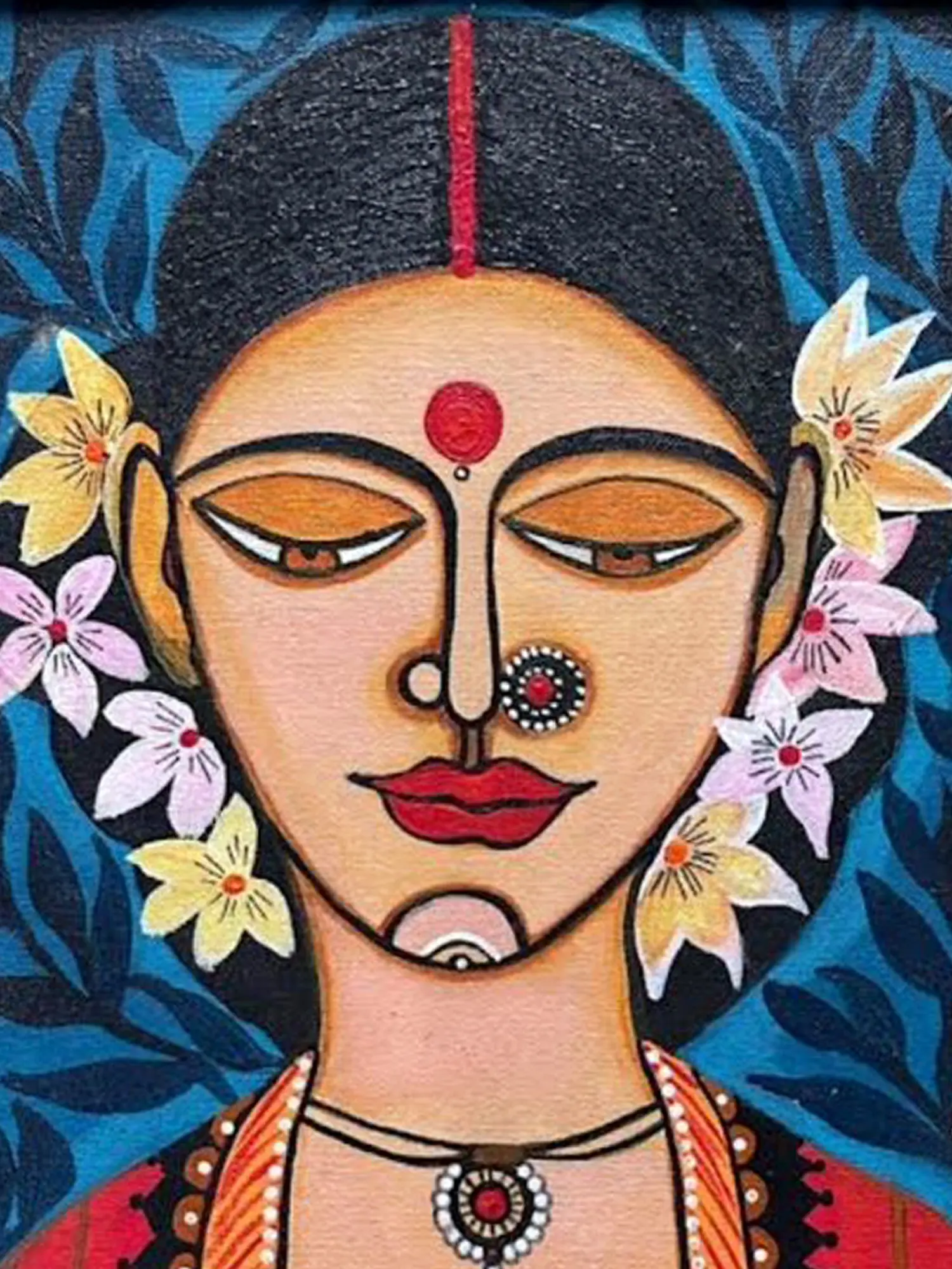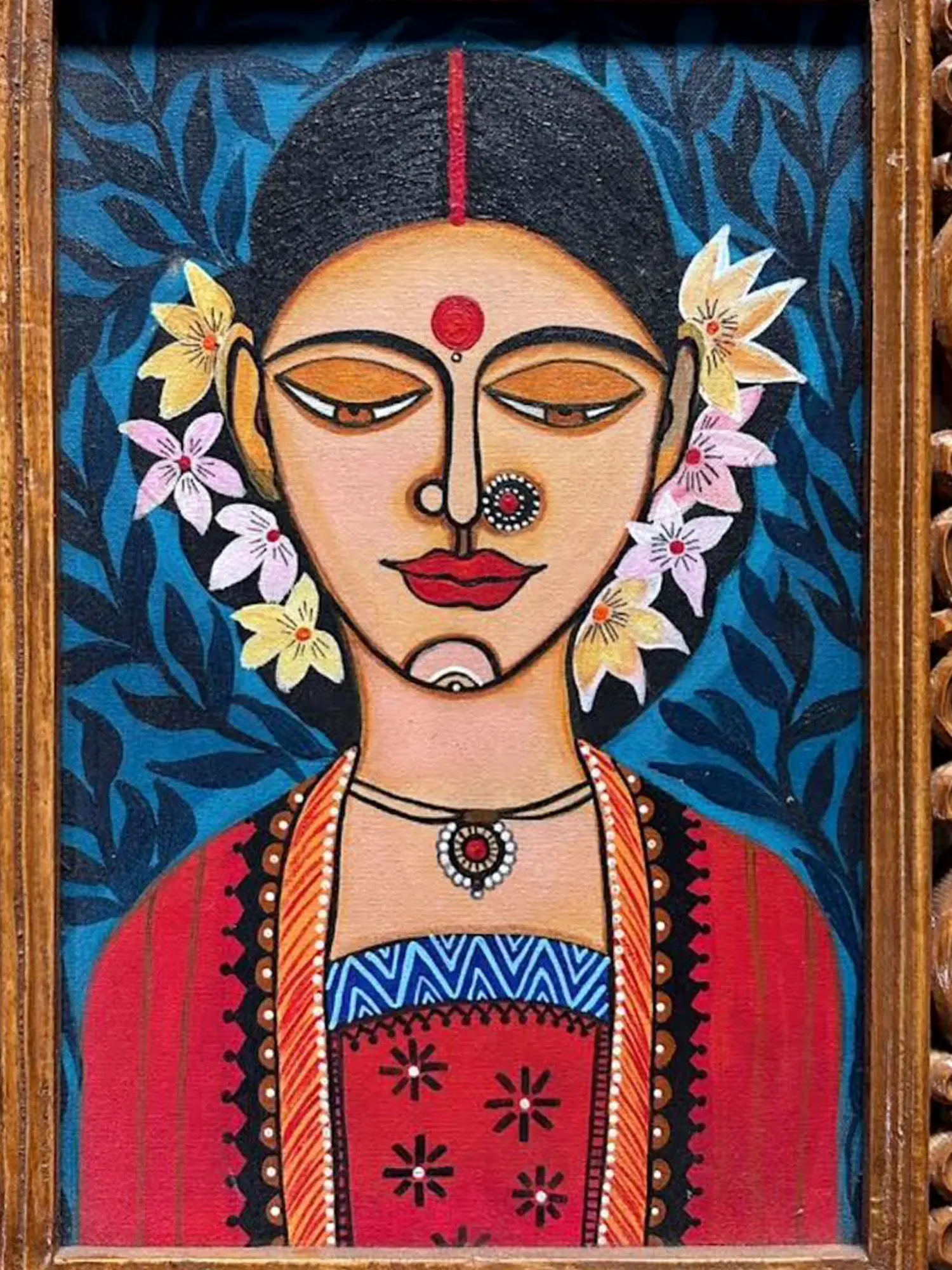 This captivating artwork, "Anamika," transports you to a realm of rich cultural heritage and enchanting storytelling. The painting, executed in vibrant acrylics and presented in an intricately carved wooden frame, features a striking portrayal of a woman whose serene expression and exquisite attire whisper tales of ancient traditions. The artist's skillful use of color and texture brings the subject to life, imbuing her with a quiet dignity that resonates deeply. The deep blue background, adorned with delicate foliage, serves as a breathtaking backdrop for Anamika’s radiant beauty. Her adornments, from the delicate floral accents in her hair to the intricate jewelry she wears, all tell a story of cultural significance and artistic precision.