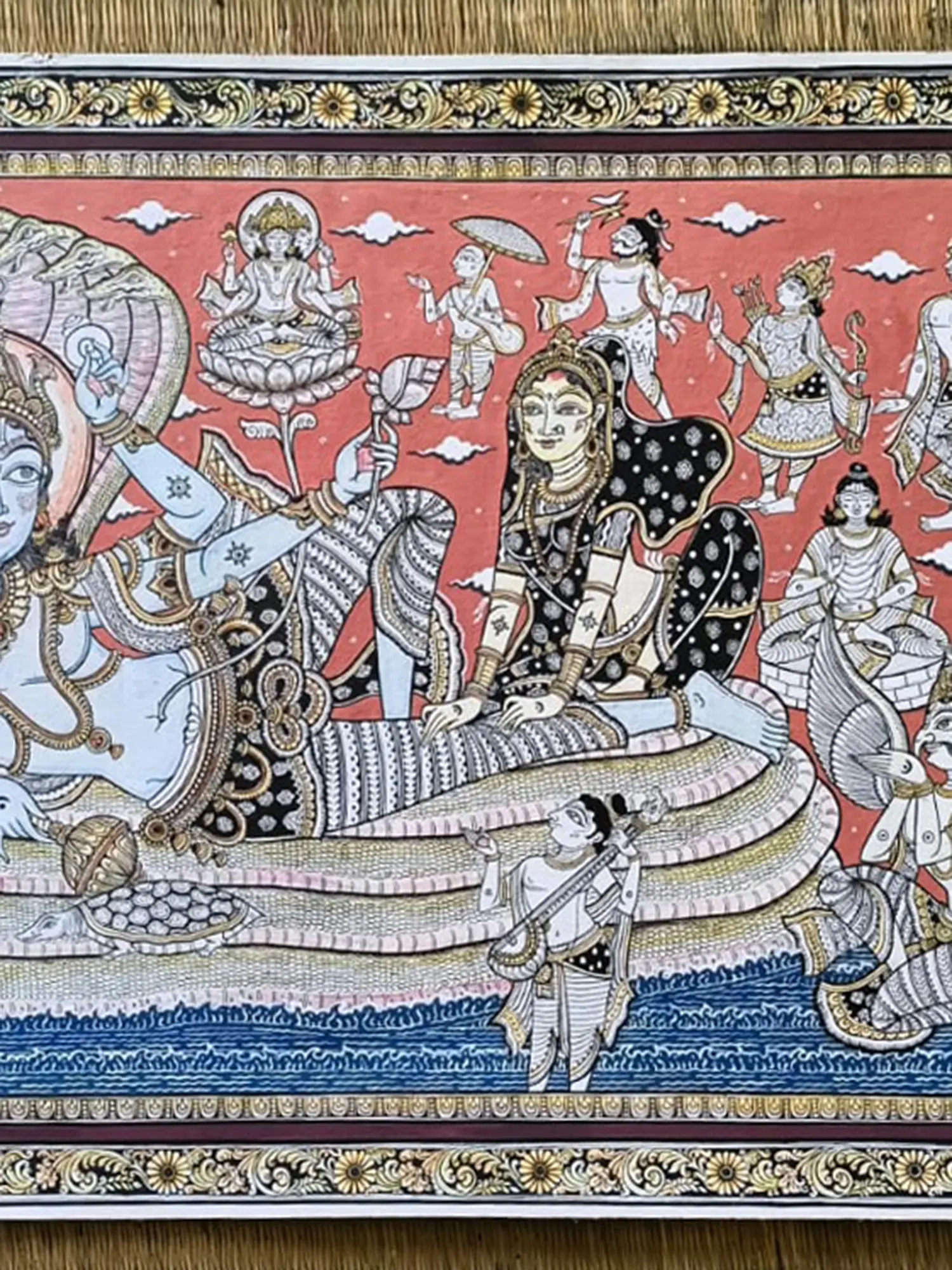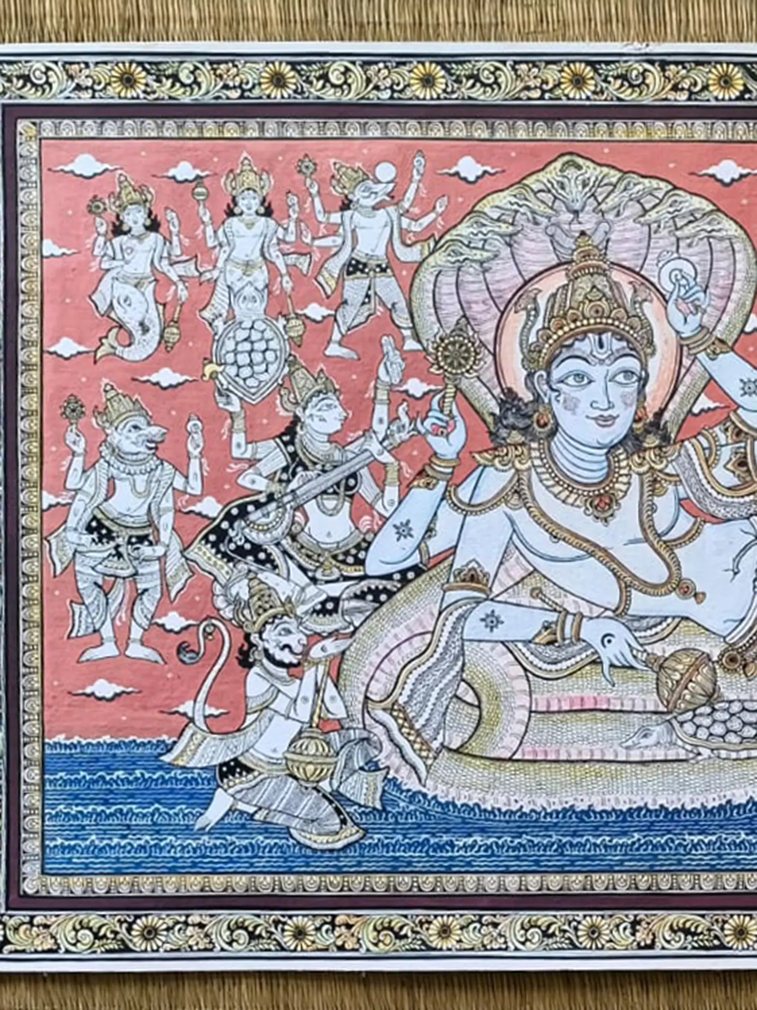 The composition centers on the serene visage of Vishnu, reclining on the coils of the celestial serpent, Shesha Naga, amidst a cosmic ocean. Surrounding him, a multitude of deities and divine beings, rendered with delicate precision, signify the vast cosmic drama. The striking coral backdrop accentuates the luminosity of the figures, while the intricate border, a hallmark of Pattachitra, frames the scene with opulent detail.