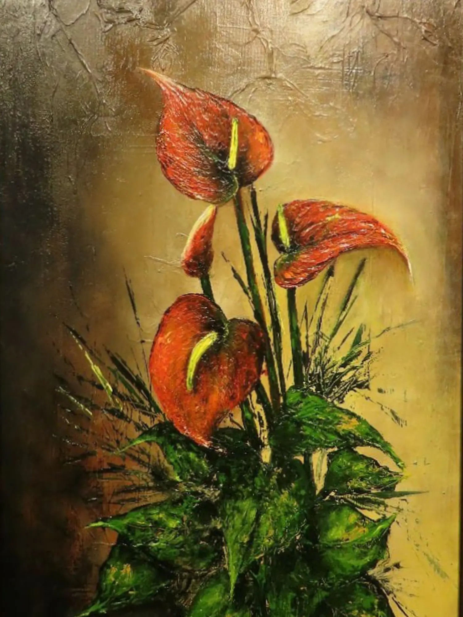 Immerse yourself in the captivating allure of nature's artistry, captured with breathtaking intensity. This arresting depiction of anthuriums offers a vibrant focal point that breathes life and sophisticated color into any discerning space. You'll appreciate the way these iconic blooms command attention, their forms rendered with a palpable energy.