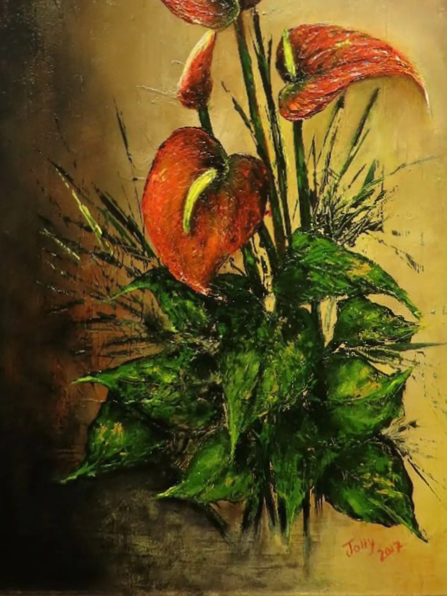 Anthuriums, often referred to as the "flamingo flower," are known for their striking, heart-shaped spathes and vibrant colors. Historically, they have been associated with hospitality, abundance, and love, making them a cherished subject in art and nature. This rendition celebrates their inherent grace and the enduring symbolism they carry, offering a piece that resonates with deeper meaning.
