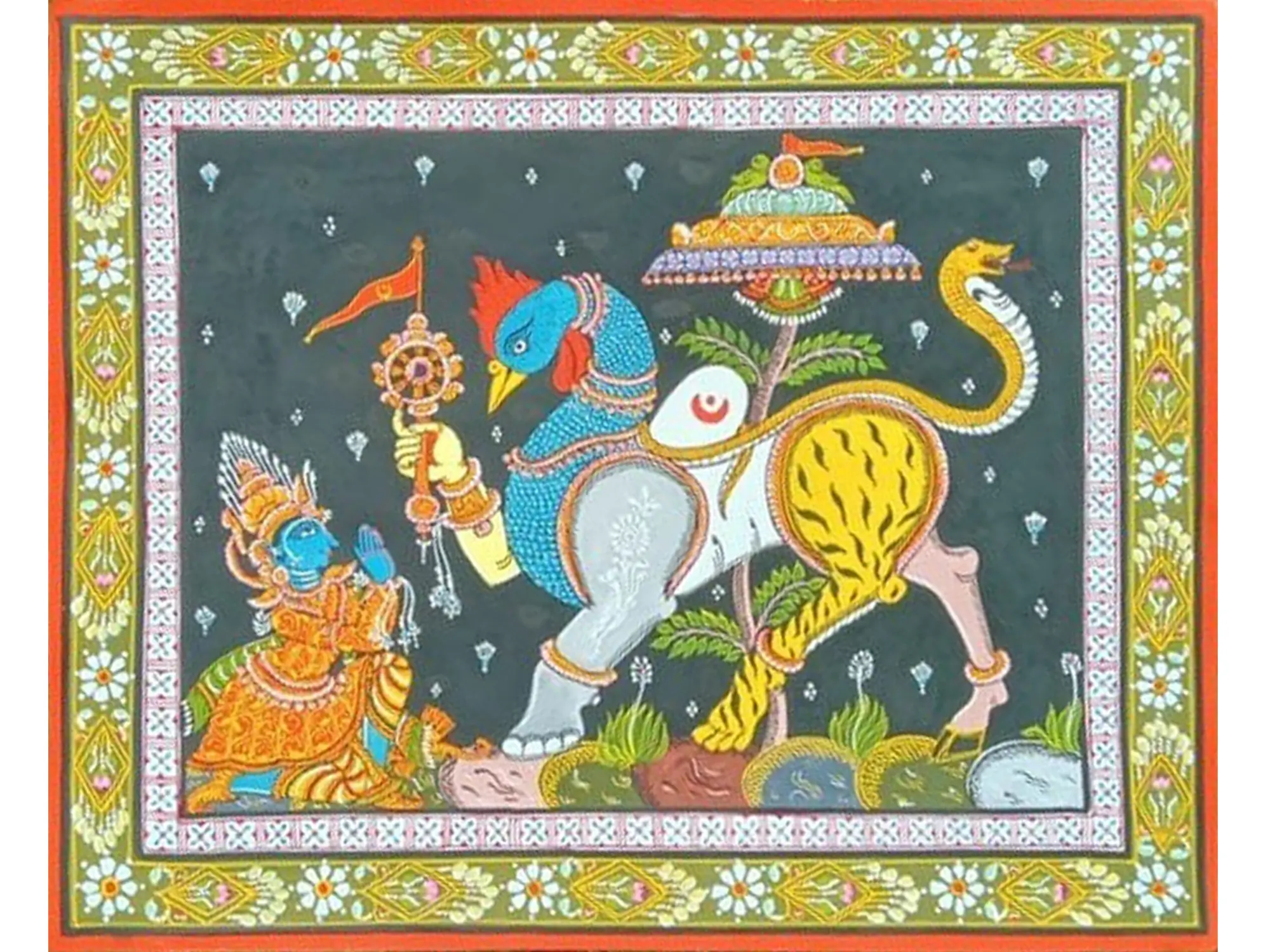 Measuring 12 by 18 inches, this composition is a testament to visual storytelling. The central figures are rendered with remarkable detail, from the ornate garments of the devotee to the majestic, multi-formed creature. The deep, dark background makes the vibrant colors of the figures and their surrounding decorative borders pop, drawing your eye into the narrative. The intricate floral patterns and geometric motifs framing the scene add a layer of visual complexity and artisanal charm.