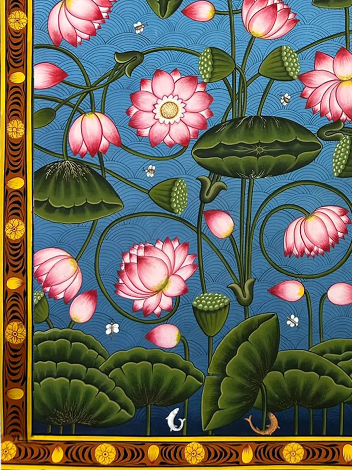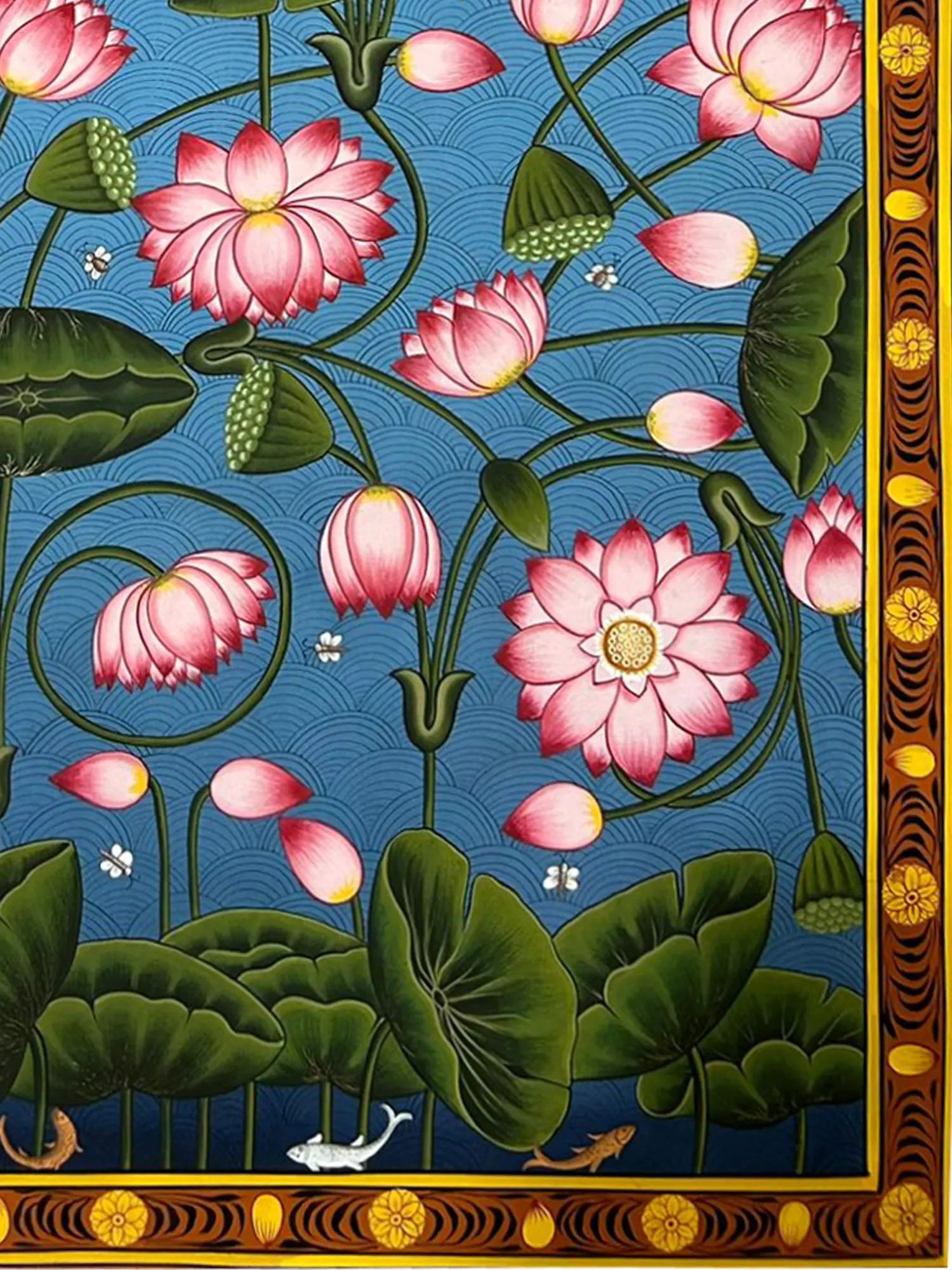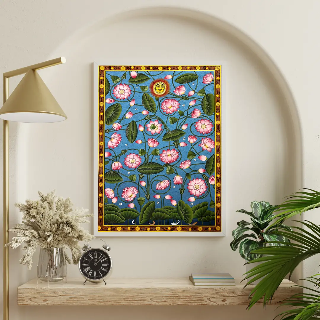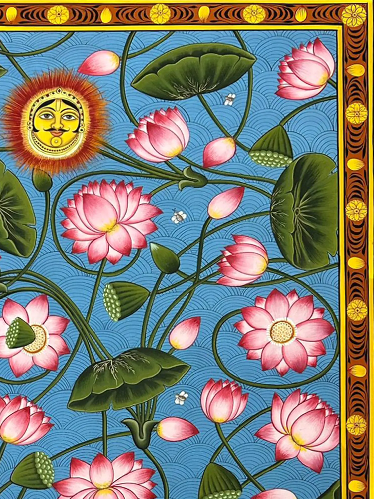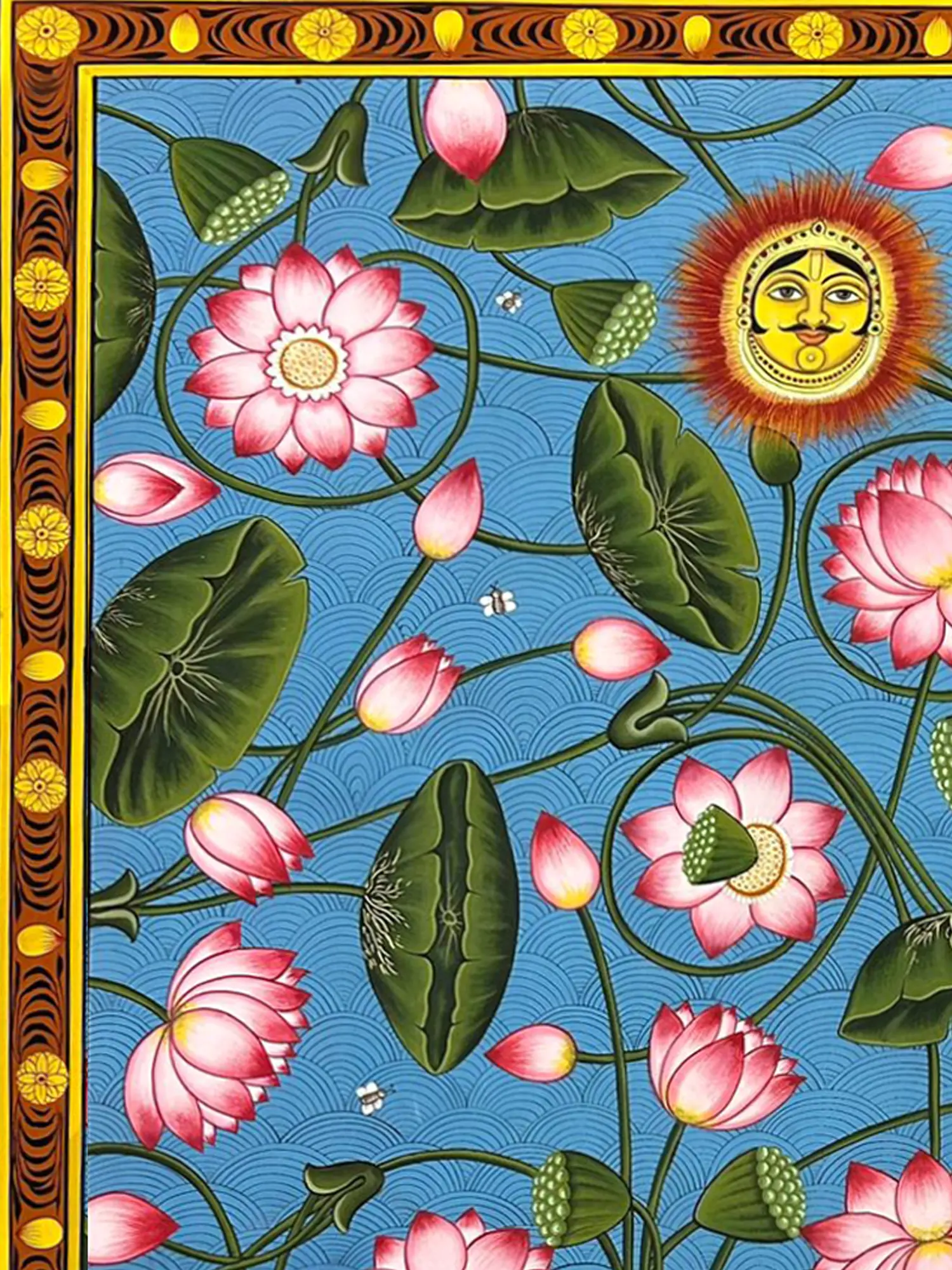 The lotus flower holds profound significance across many Eastern cultures, symbolizing purity, enlightenment, rebirth, and spiritual awakening. Its ability to emerge unstained from muddy waters is seen as a metaphor for rising above worldly attachments and achieving inner peace. The presence of the sun deity further reinforces themes of vitality, creation, and divine presence, infusing the artwork with rich spiritual and cultural meaning.