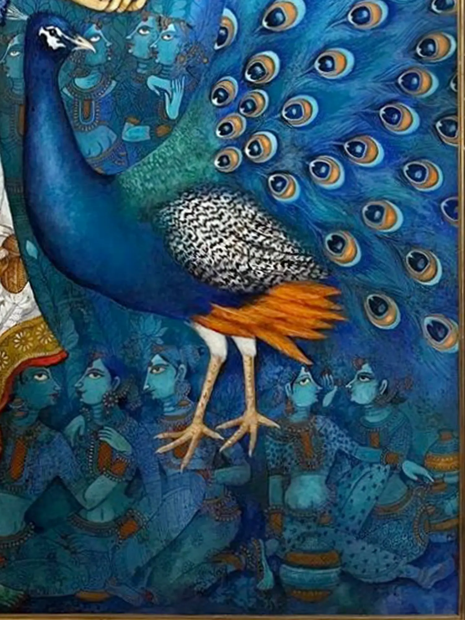 The magnificent peacock positioned beside Meera Bai is not merely a decorative element; it holds deep symbolic meaning within both Hindu and broader Indian culture. The peacock, often associated with the goddess Lakshmi and the divine, represents beauty, grace, and immortality. Its iridescent plumage evokes a sense of celestial splendor, mirroring the spiritual radiance that emanates from Meera Bai. The peacock's tail feathers, each meticulously rendered in the painting, are said to represent the many eyes of God, ever-watchful and ever-present. The bird's presence alongside the saint suggests a divine connection, an embodiment of Meera Bai’s deep connection with the cosmic consciousness.