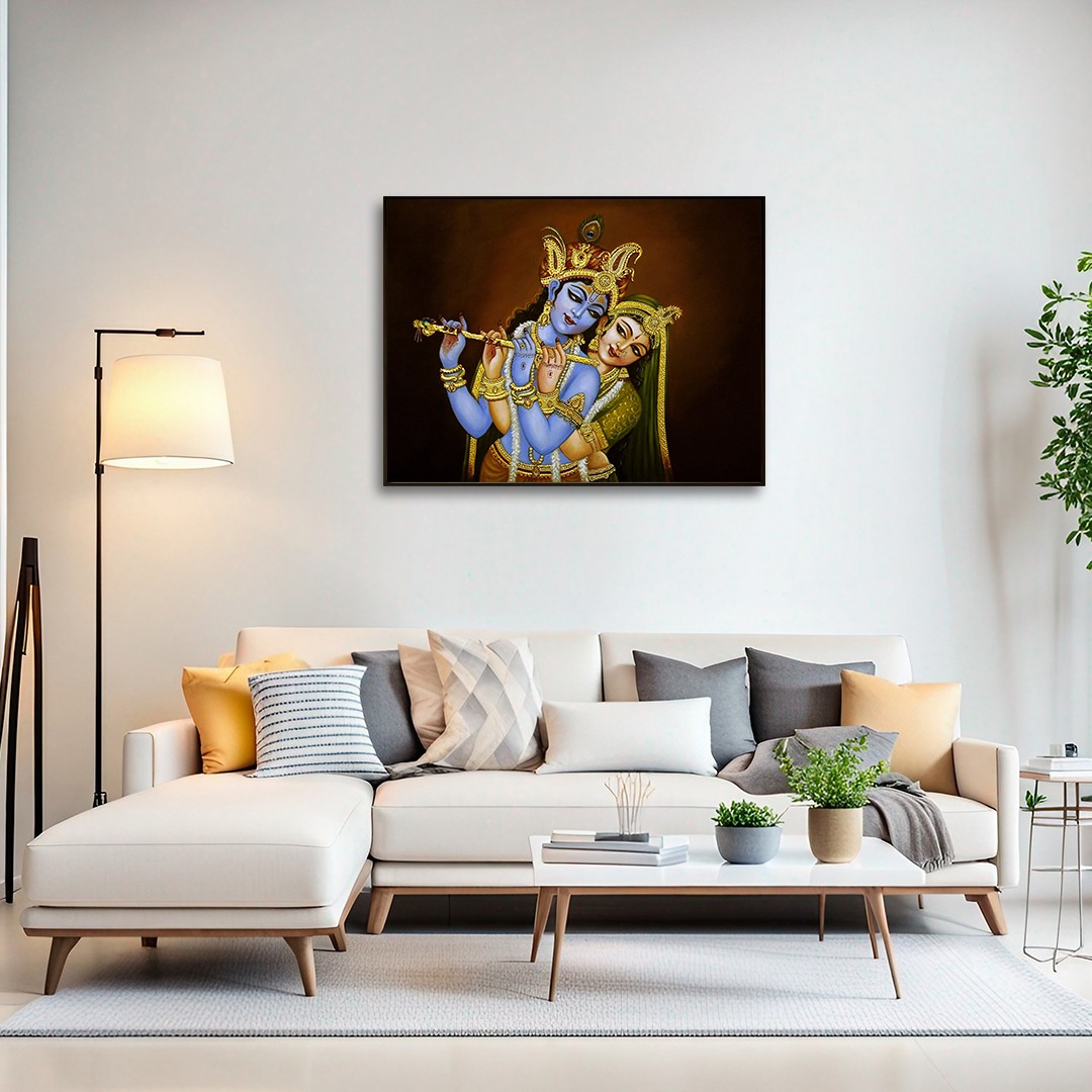 This painting is more than just a decorative item; it is a piece of art that brings the divine energy of Radha and Krishna into your home. The image evokes feelings of peace, love, and spiritual harmony, creating a positive and uplifting atmosphere. It can serve as a daily reminder of the power of devotion, the beauty of divine love, and the journey towards spiritual enlightenment. It's perfect for meditation rooms, prayer spaces, or simply any area where you wish to bring a touch of serenity and spiritual grace. Place it in a prominent location to enjoy its beauty and the uplifting energy it radiates. It will become a cherished object, adding beauty and spiritual significance to your living space.