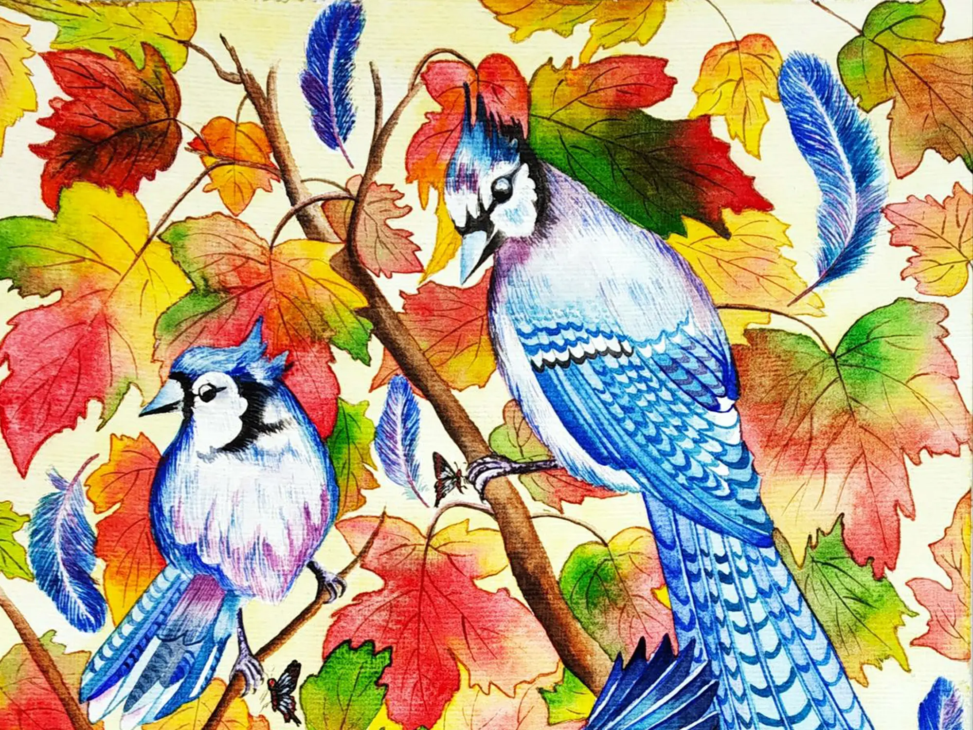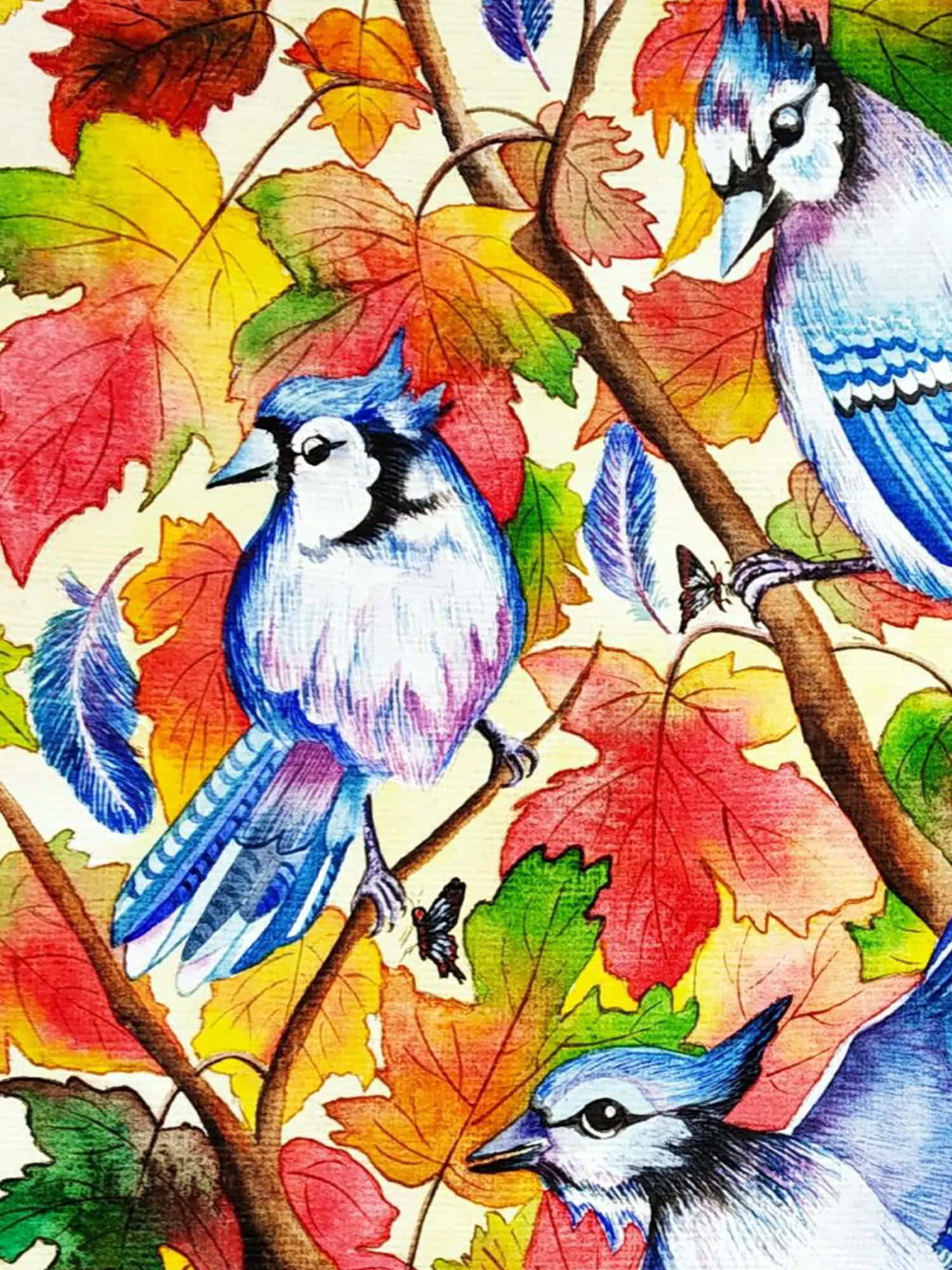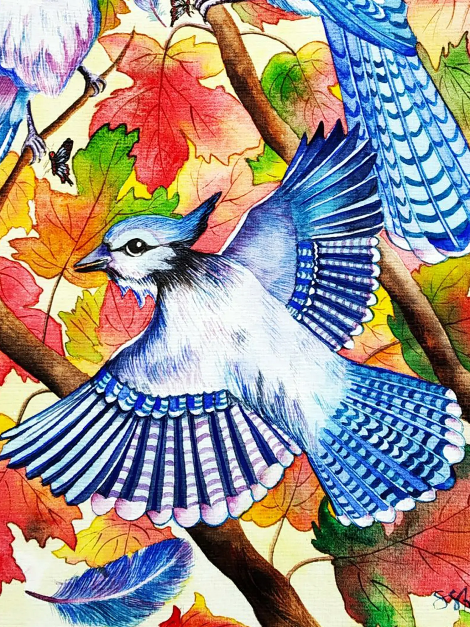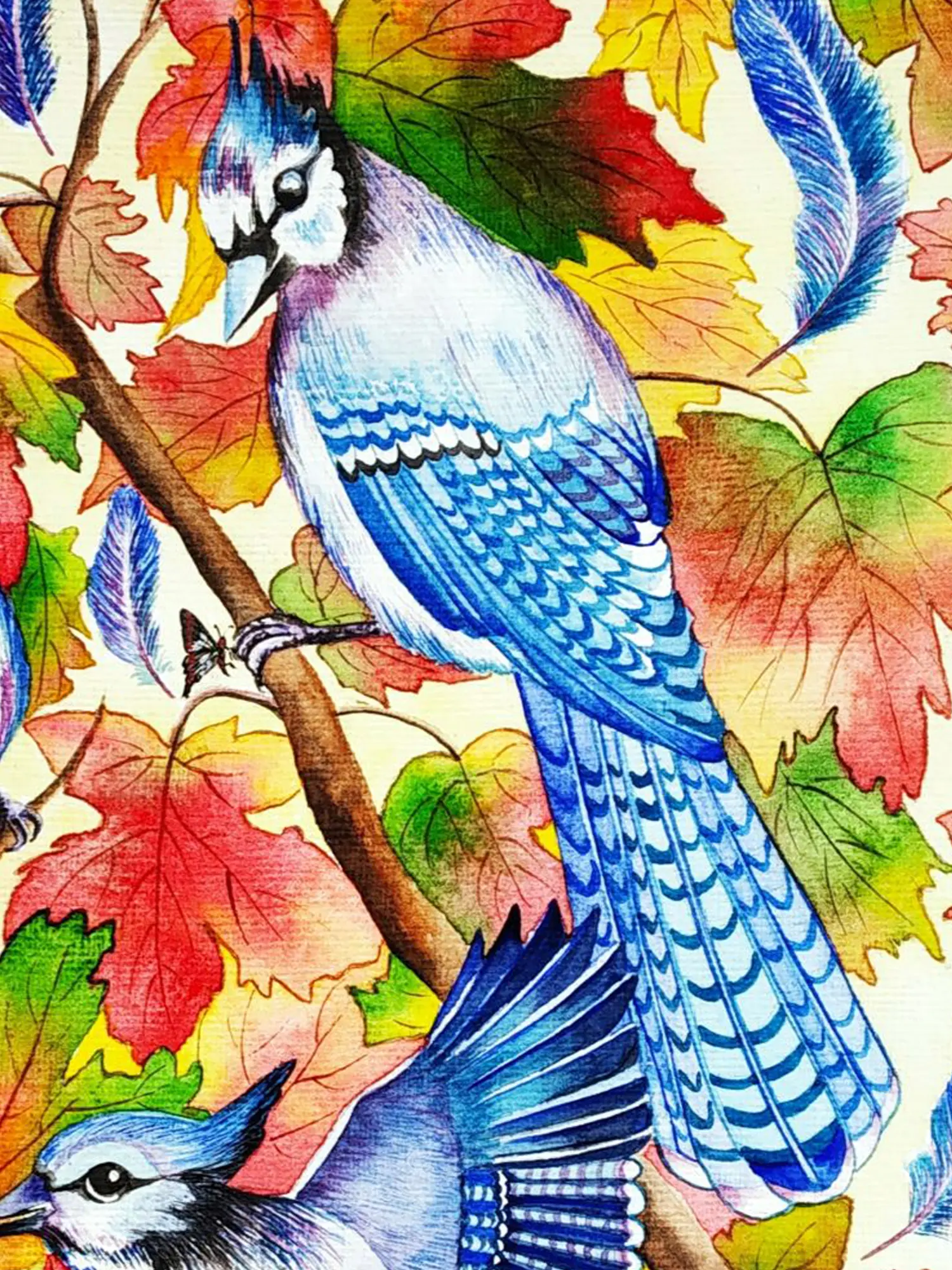 The captivating blues of the jays stand in striking contrast against the warm, fiery tones of the maple leaves, creating a visually dynamic composition. The delicate rendering of each feather, with its subtle variations in shade and pattern, speaks to an exceptional level of artistic precision. The overall effect is one of both energy and serene elegance, a testament to the careful orchestration of color and form on its 11-inch width and 15-inch height.