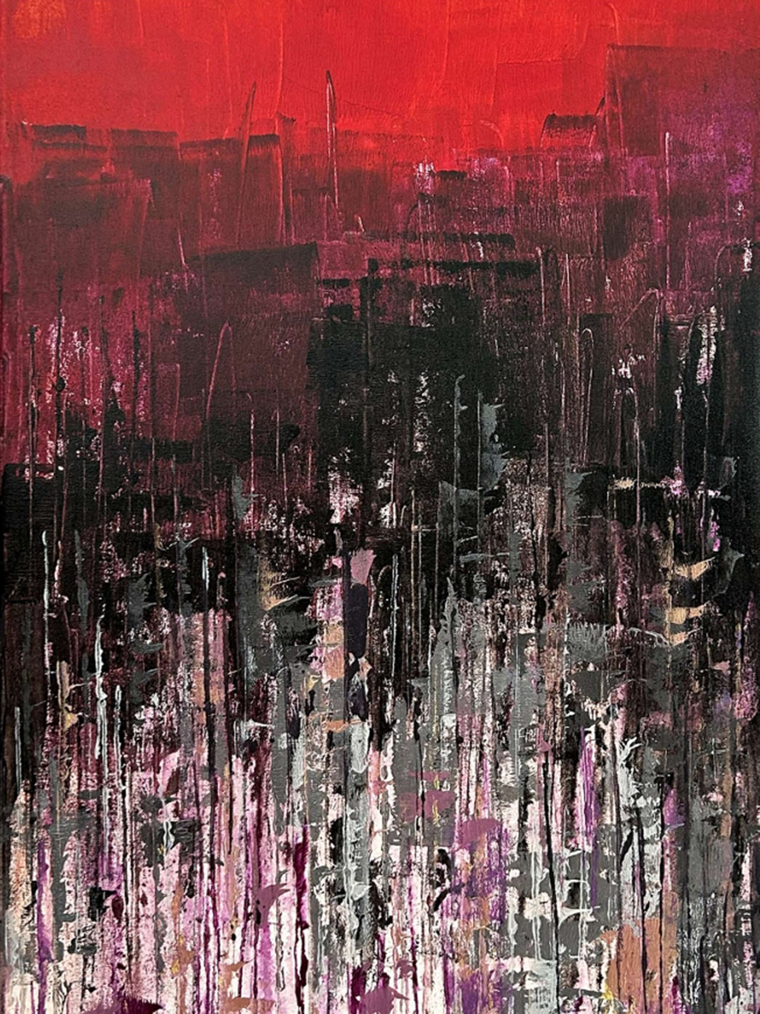 The interplay of vibrant reds fading into deep, smoldering blacks and culminating in a spectrum of grays and purples is a visual delight. Notice the expressive vertical strokes that lend a dynamic energy, creating an abstract landscape that hints at both urban structures and natural formations. You'll be drawn into its complexities, discovering new nuances with every glance.