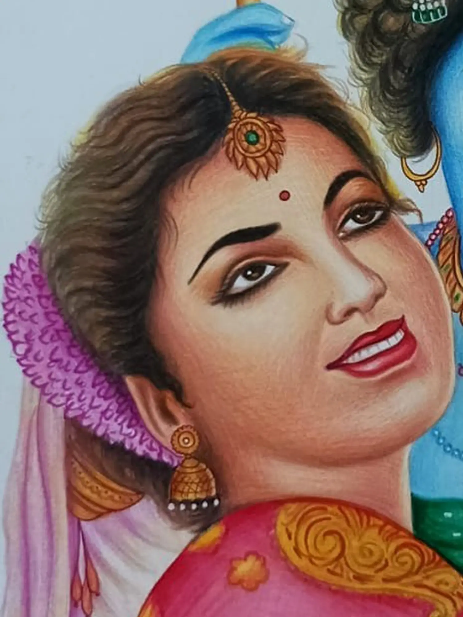In this lovely representation by the skilled artist Sunil Kuar, “Yashoda Maiya” cradles her precious child, “Bal Krishna,” capturing the essence of maternal love and devotion. Each stroke of colour pencil gives life into this magnificent painting, reflecting the eternal bond between mother and son.