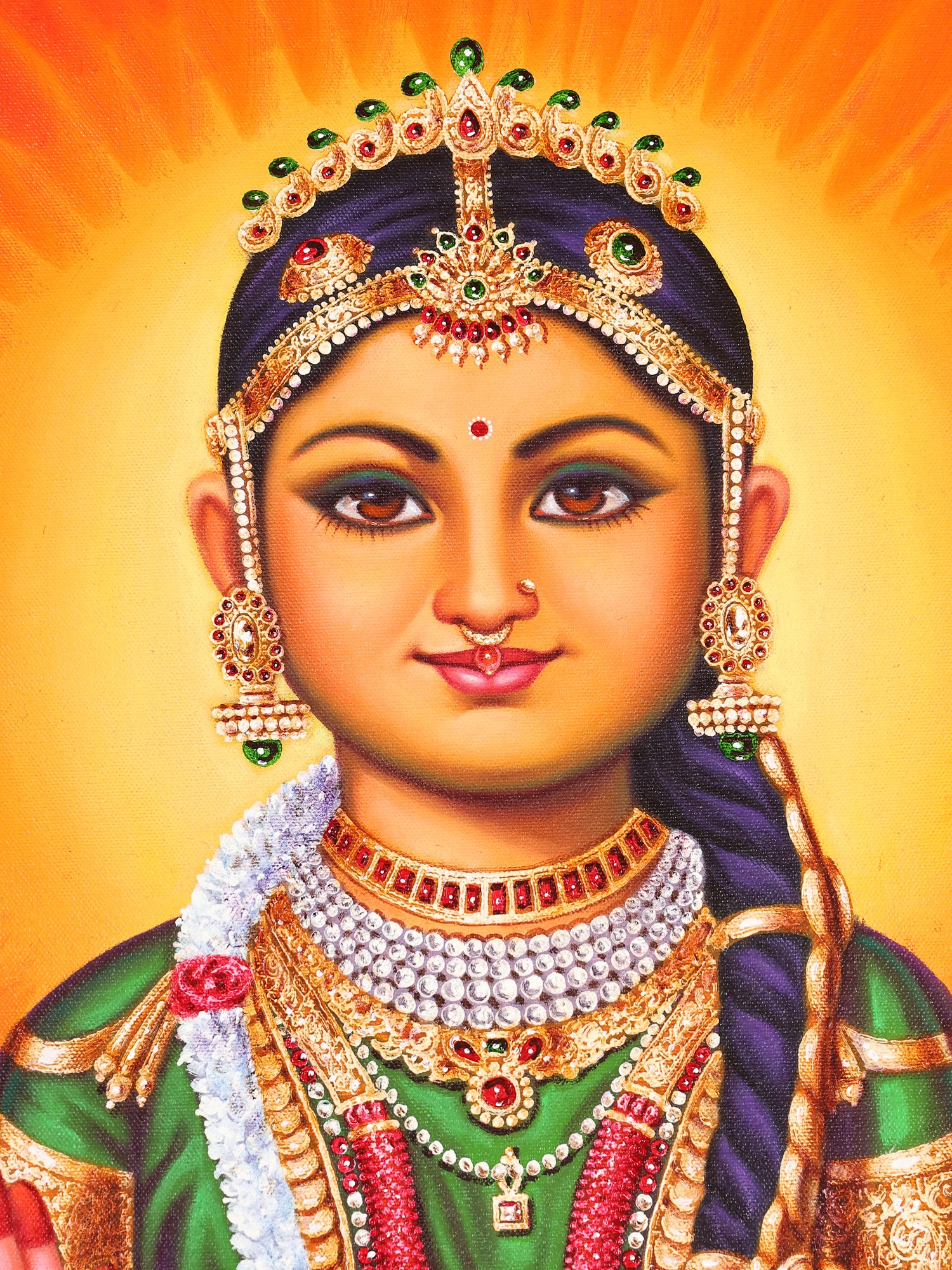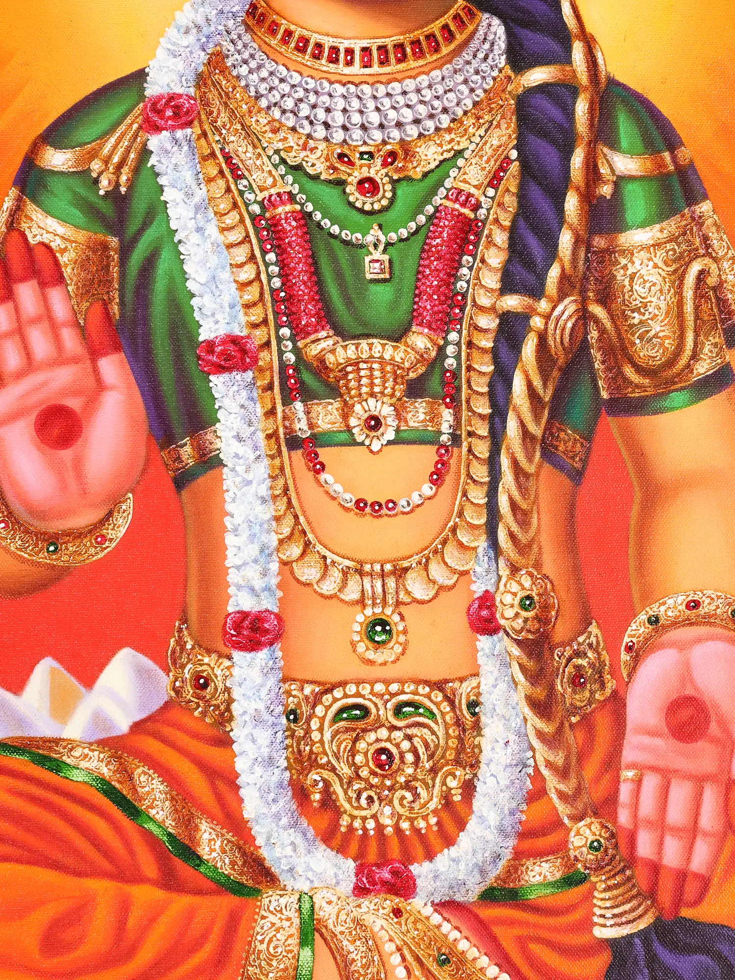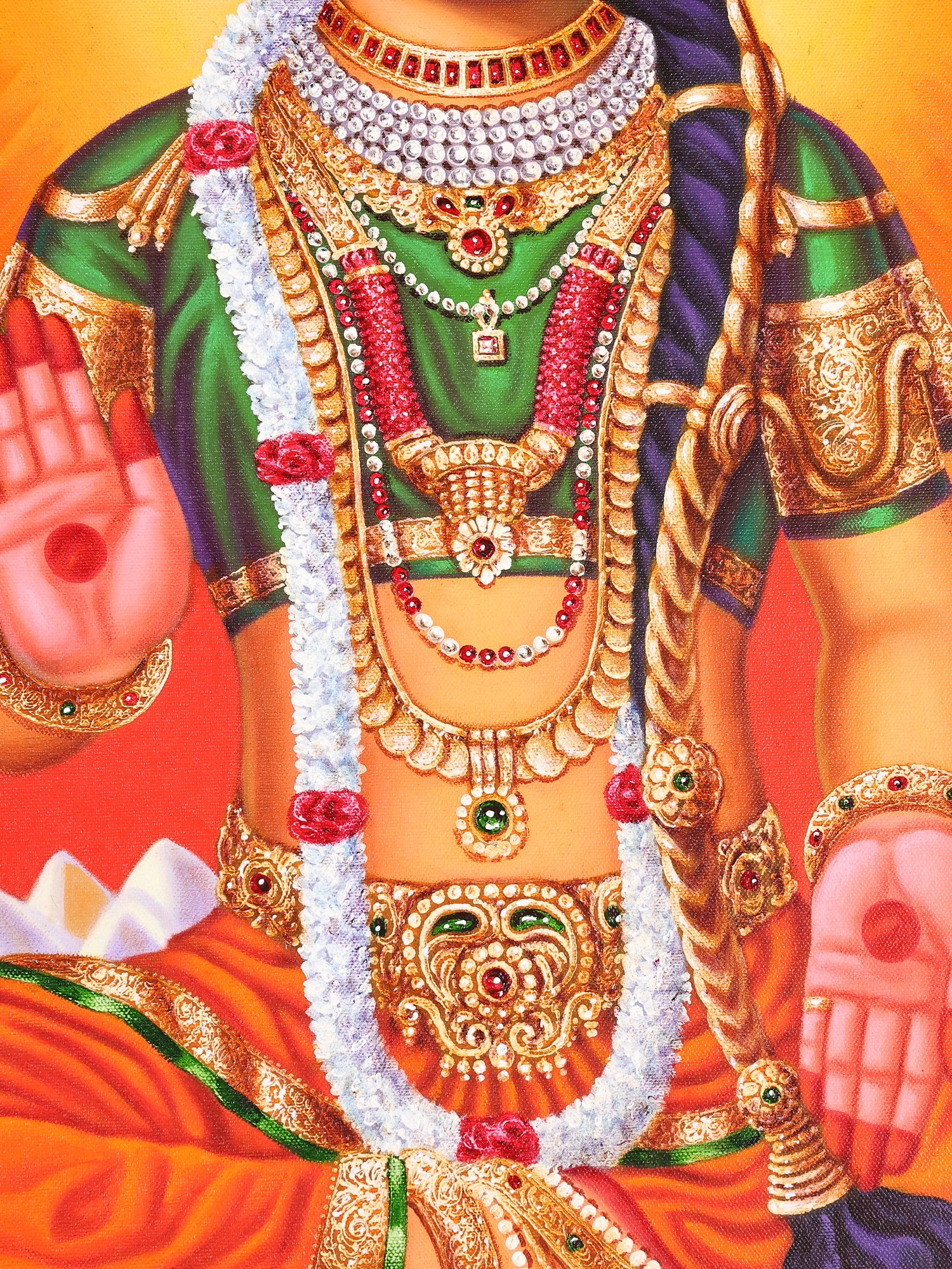 This exquisite oil painting captures the divine essence of Bala Tripura Sundari, affectionately known as Balambika, the youthful aspect of the Great Goddess. Seated serenely upon a blossoming lotus, she emanates an aura of pure innocence and formidable cosmic power, a duality that defines her significant presence in Hindu philosophy. The artist has masterfully rendered her in vibrant hues, bringing to life a deity revered for bestowing wisdom, grace, and protection. The depiction portrays Balambika with four arms, symbolizing her omnipotence and her ability to engage with the cosmos on multiple planes. In one hand, she holds a rosary, a reminder of her meditative and spiritual nature, often associated with chanting mantras that lead to liberation. In another, she grasps a sugarcane bow, the weapon of Kama, the god of love and desire, suggesting her dominion over worldly passions and the power of attraction. The subtle gestures of her other hands, one in a blessing pose (Abhaya Mudra) and the other resting, convey her protective embrace and her calm, unwavering presence. ––––––––––