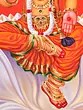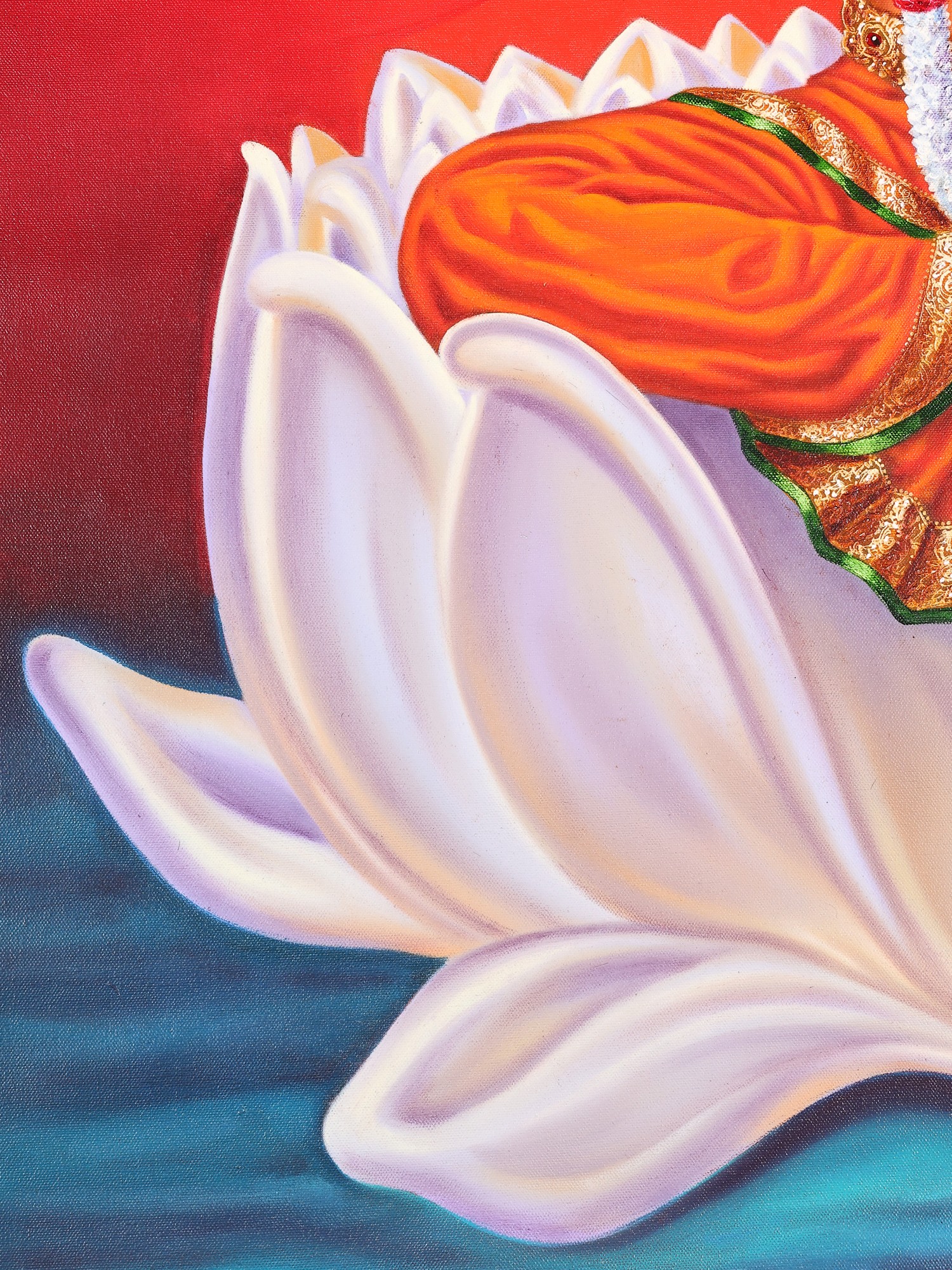 The energetic background, transitioning from a fiery red to a soft, warm yellow, evokes the rising sun, symbolizing new beginnings, vital energy, and the dispelling of darkness. The tranquil, blue waters below her lotus seat represent the cosmic ocean of consciousness from which all creation arises. This painting is more than just a visual representation; it is an invitation to connect with the divine feminine in its purest, most potent form. Balambika's gentle yet firm gaze draws the viewer into a contemplative space, offering solace, guidance, and the promise of spiritual growth. This artwork is a powerful testament to the enduring reverence for the Goddess and a beautiful piece for any sacred space or collection seeking divine inspiration.