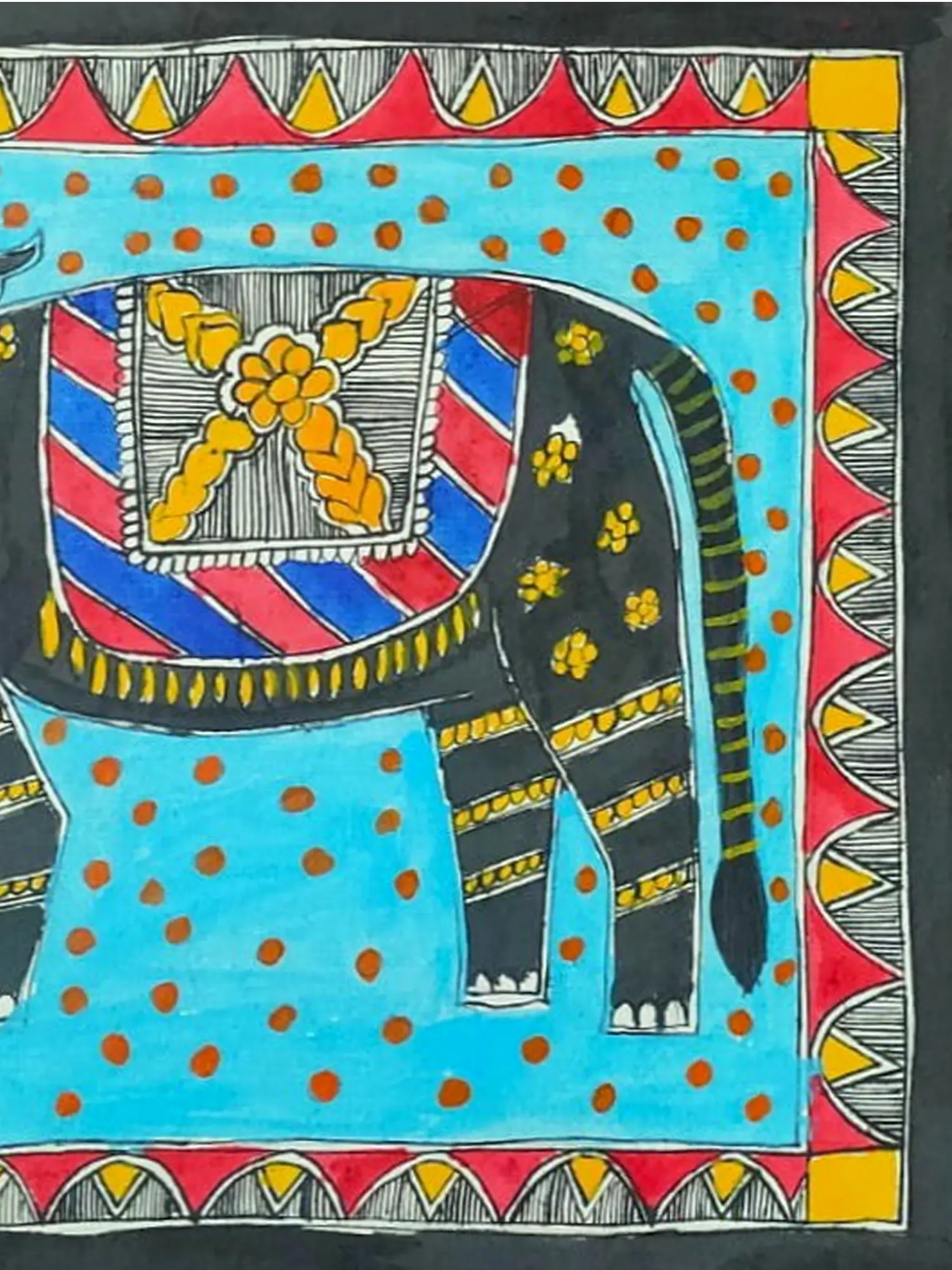 This artwork draws its inspiration from the renowned Madhubani art form, originating from the Mithila region of India. Traditionally created by women, Madhubani paintings often depict mythological themes, nature, and daily life, imbued with symbolic meaning. The elephant, a creature revered for its strength and gentleness, is a recurring motif, symbolizing auspiciousness and good fortune.