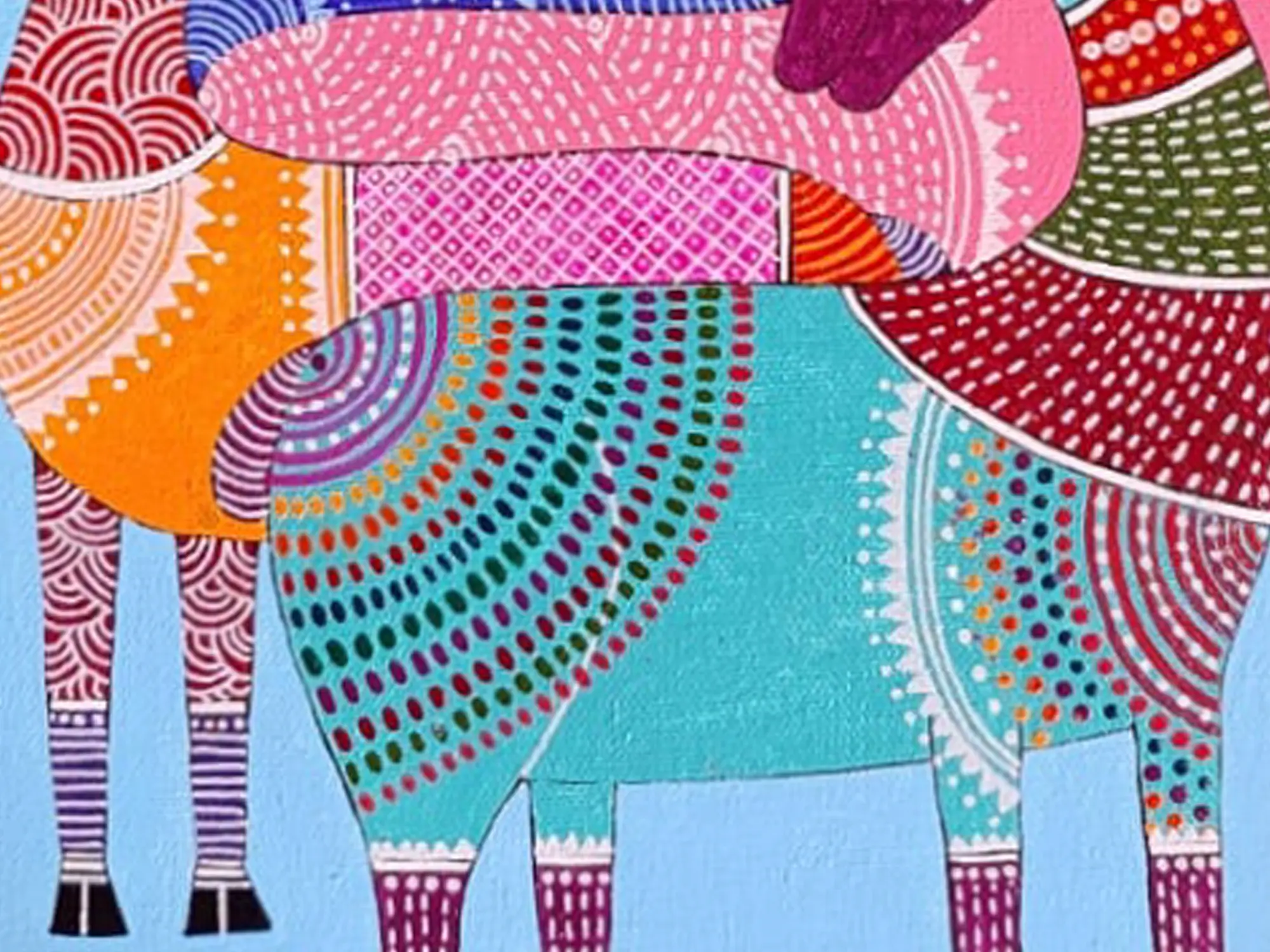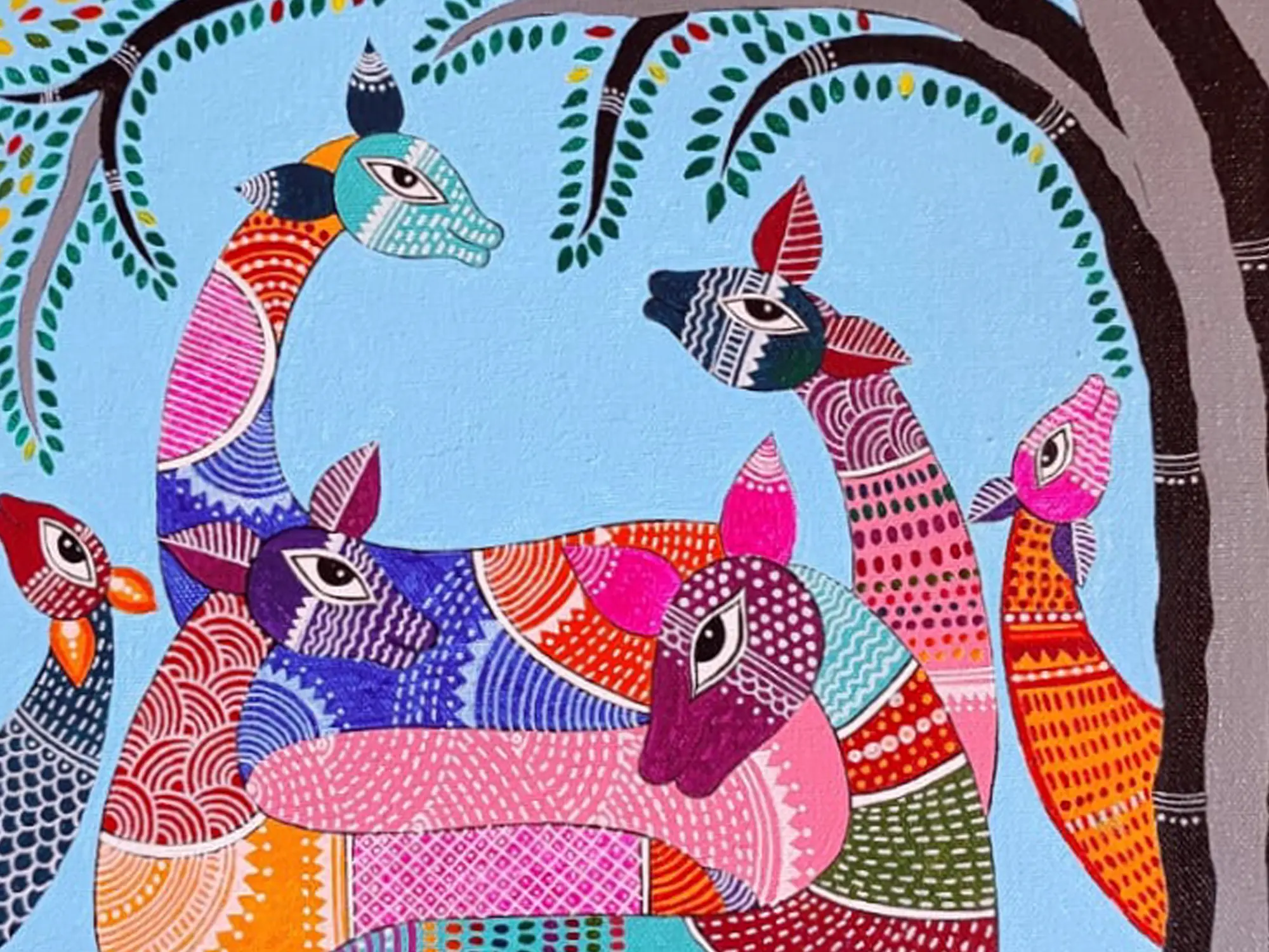 The depiction of a beautiful deer in Gond art style, rendered in acrylic on canvas, celebrates the rich cultural heritage and ages old storytelling of indigenous Indian art. With dotted prominence of vibrant colours, the artwork captures the graceful elegance and spiritual symbolism of the deer in tribal folklore - the deer emerges as a symbol of grace, agility, and natural beauty. The technique resonates with the ancient rhythms and sacred traditions of Gond art, calling one to immerse themselves in the enchanting world of indigenous creativity and cultural expression.