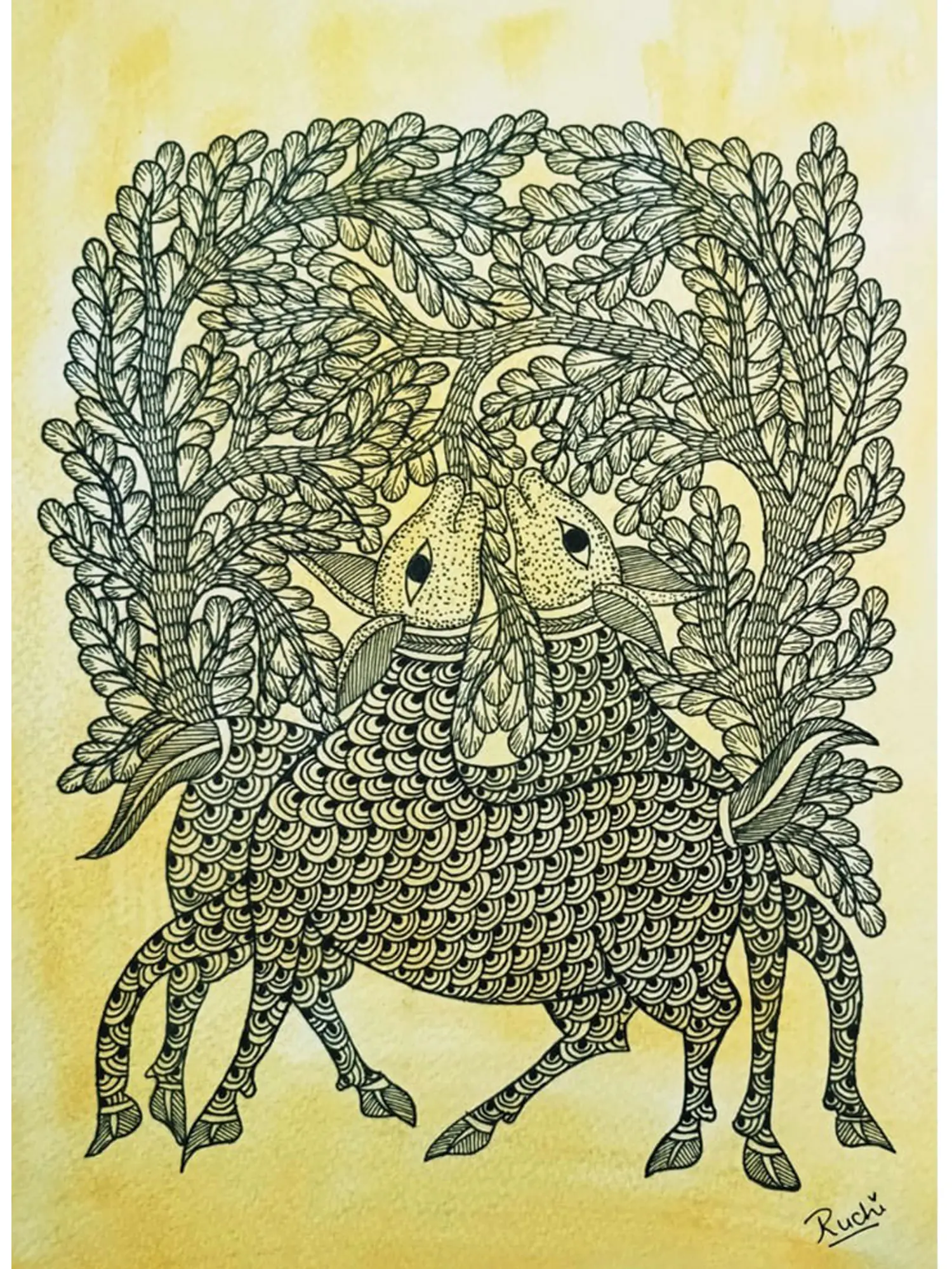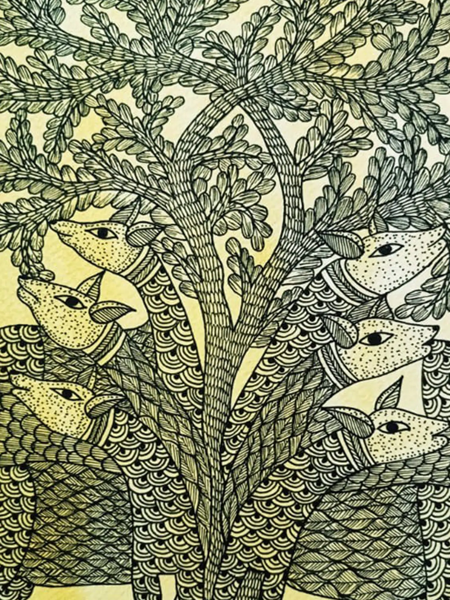 Forest-River Kalamkari Dupatta from Telangana with Zari Border and Printed Paisleys