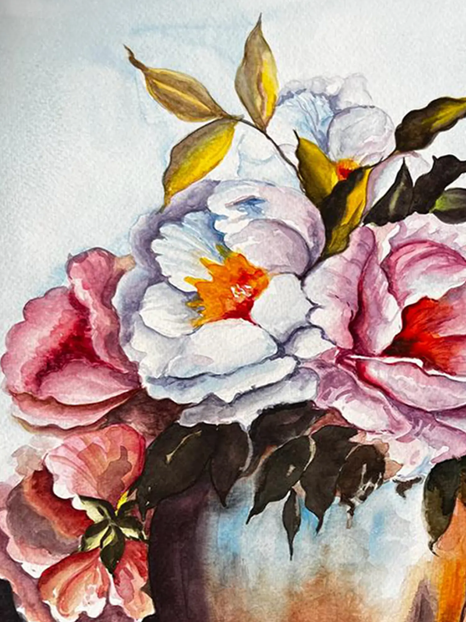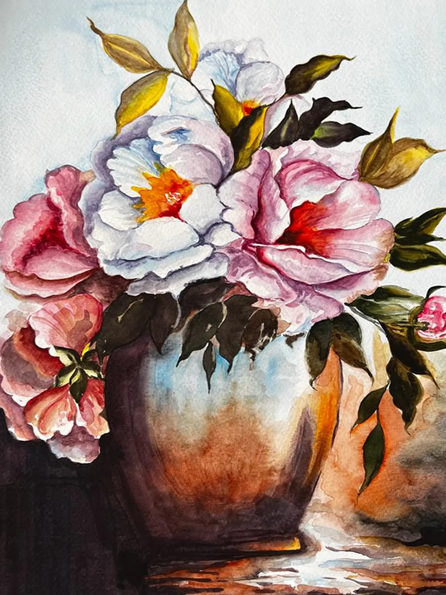 Mamta Saxena's expertise in watercolor is evident in the fluid grace of her brushstrokes. The translucent quality of the medium allows for a captivating blend of colors, showcasing the artist's precise control and understanding of light. Each layer of paint, meticulously applied on high-quality Canson paper, contributes to the painting's depth and luminosity. The choice of Canson paper, renowned for its texture and absorbency, highlights the artist's commitment to quality and longevity of the work. The painting is more than just a depiction of flowers; it is a conversation between the artist and her medium, a testament to her dedication and artistic vision. It offers an inviting glimpse into the artist's creative process, revealing her intuitive approach to form, color, and light. The interplay between the rich, deep tones of the vase and the bright, airy blossoms creates a dynamic balance, a hallmark of Saxena's artistic sensibility. The painting's size – 16 inches in height and 11 inches in width – makes it a perfect addition to various settings, from a home office to a living room, always adding a touch of elegance and artistic refinement.
