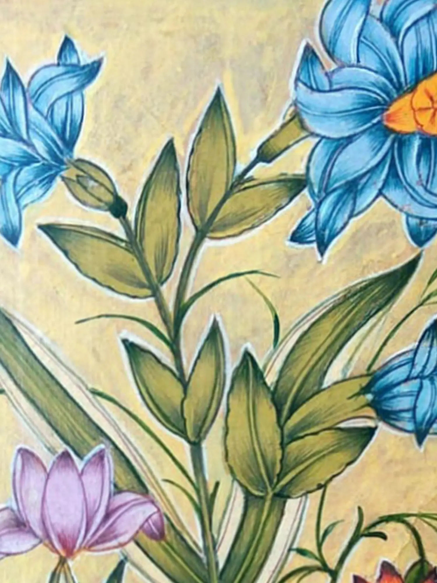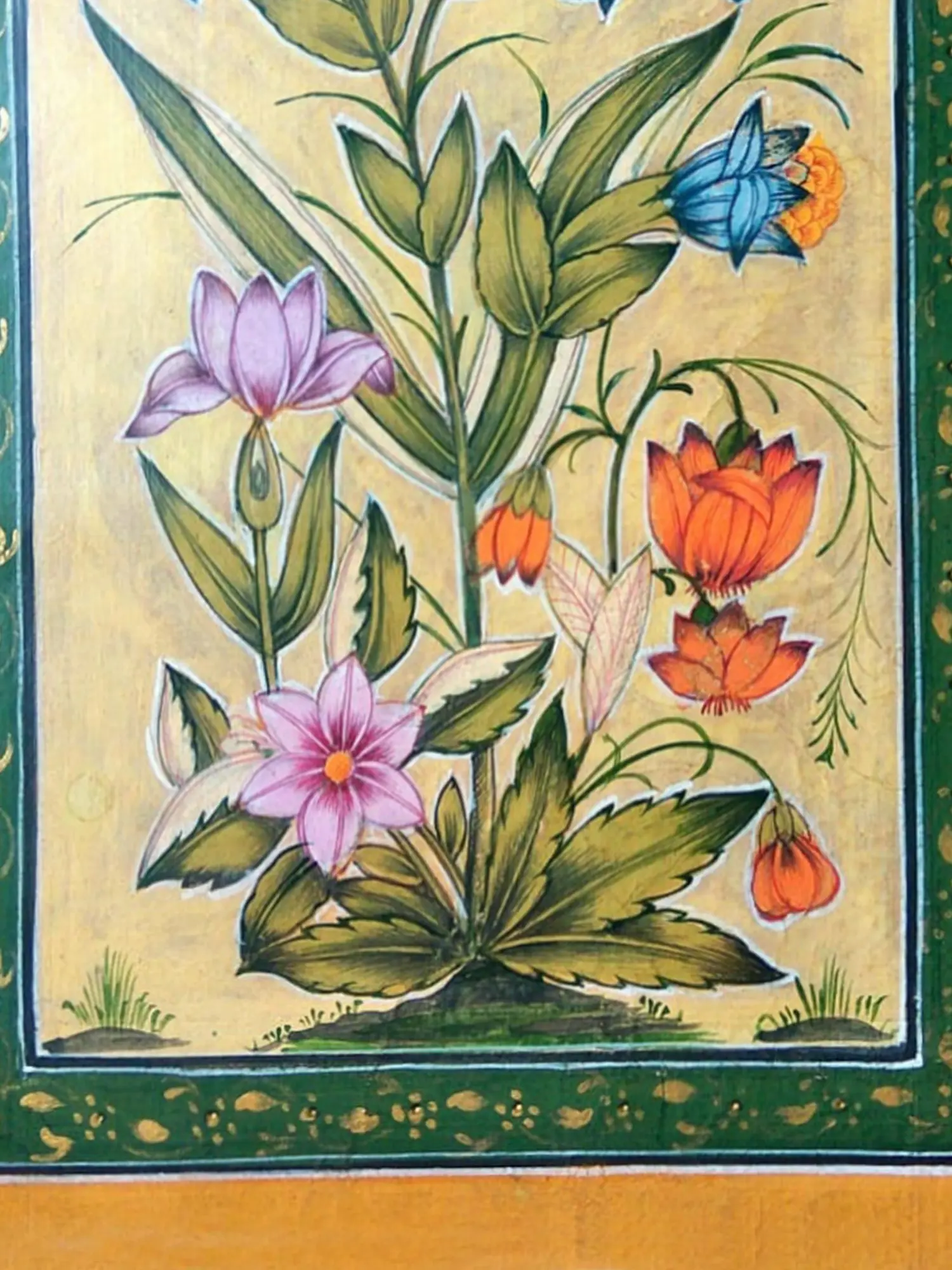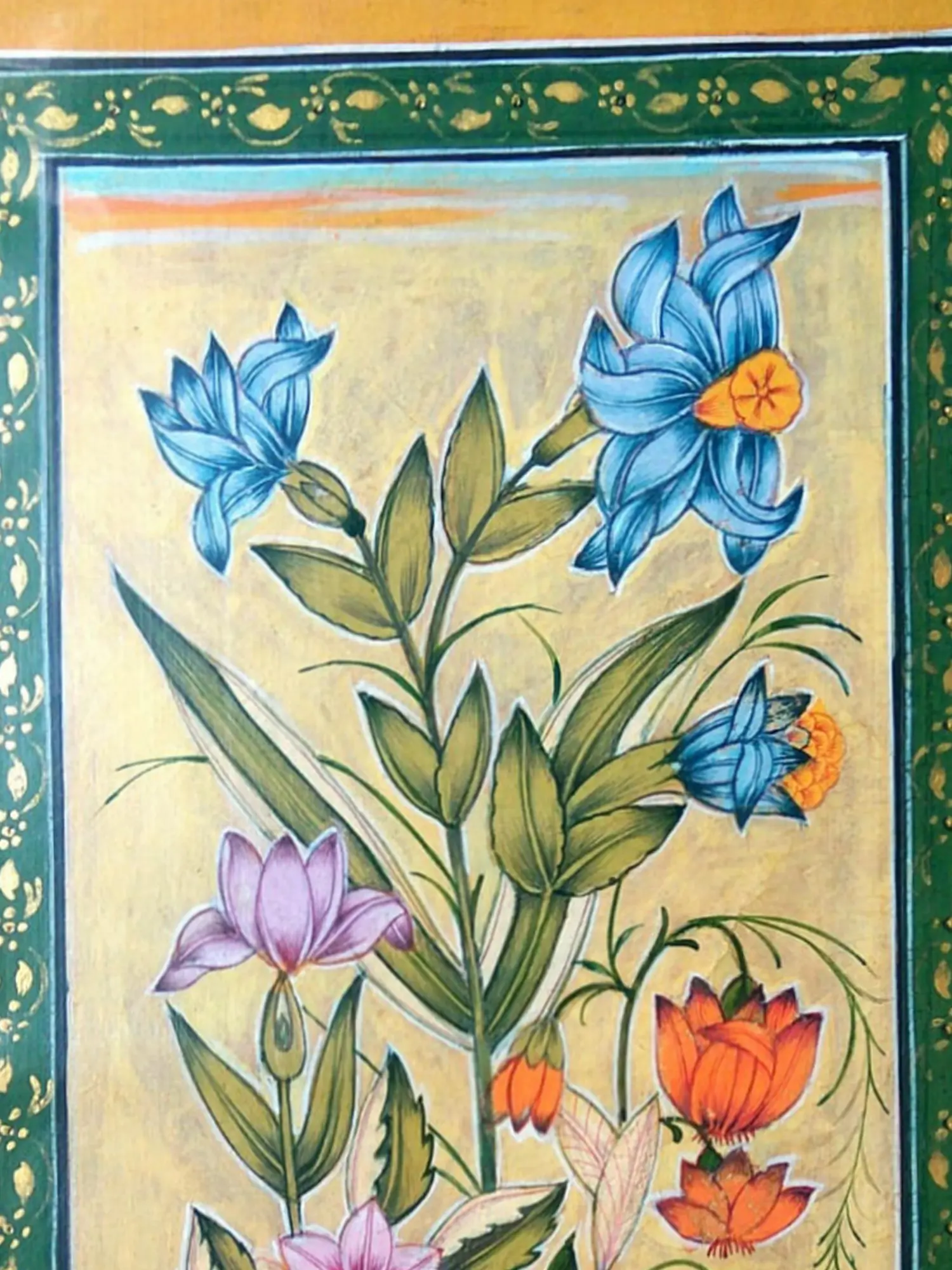 The composition showcases a graceful arrangement of blossoms in striking blues and warm oranges, complemented by a spectrum of verdant leaves. The gentle yellow background provides a soft stage, allowing the vibrant flowers to command attention. A meticulously detailed border, rendered in deep green and accented with delicate gold motifs, frames the artwork, adding a touch of regal sophistication. This captivating piece measures 8.00 inches in height and 5.60 inches in width, making it a perfectly proportioned addition to any curated space.