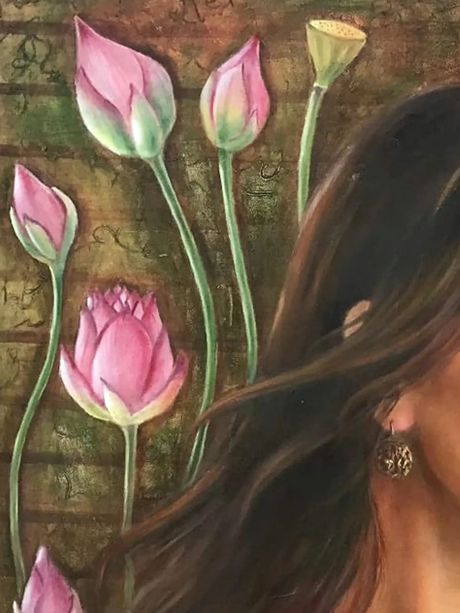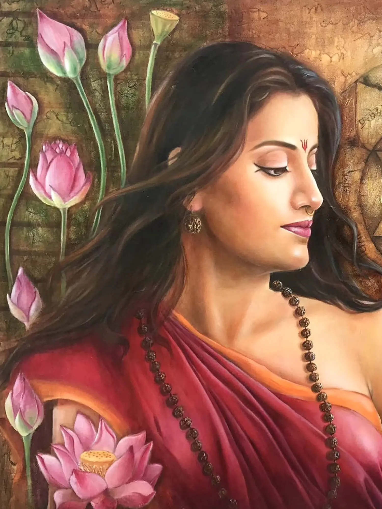 This breathtaking oil on canvas painting, measuring 36 inches in height and 48 inches in width, transports the viewer to a realm of ethereal beauty and profound symbolism. Ranjeeta Kumar's masterful brushstrokes bring to life a captivating scene: a serene woman, adorned in rich crimson and gold, her gaze directed inward, exuding an aura of tranquility and wisdom. The artist’s skill in depicting the subtle nuances of her expression, from the delicate curve of her lips to the gentle cast of her eyes, evokes a sense of inner peace and profound contemplation. The warm hues of her attire complement the soft, pinkish tones of the lotus blossoms cradled in her hand, further emphasizing the overall feeling of serenity. The lotus, a sacred symbol across many cultures, particularly in Hinduism and Buddhism, represents purity, enlightenment, and rebirth, mirroring the spiritual essence of the central figure. The artist’s choice of this flower underscores the depth of meaning embedded in the piece.