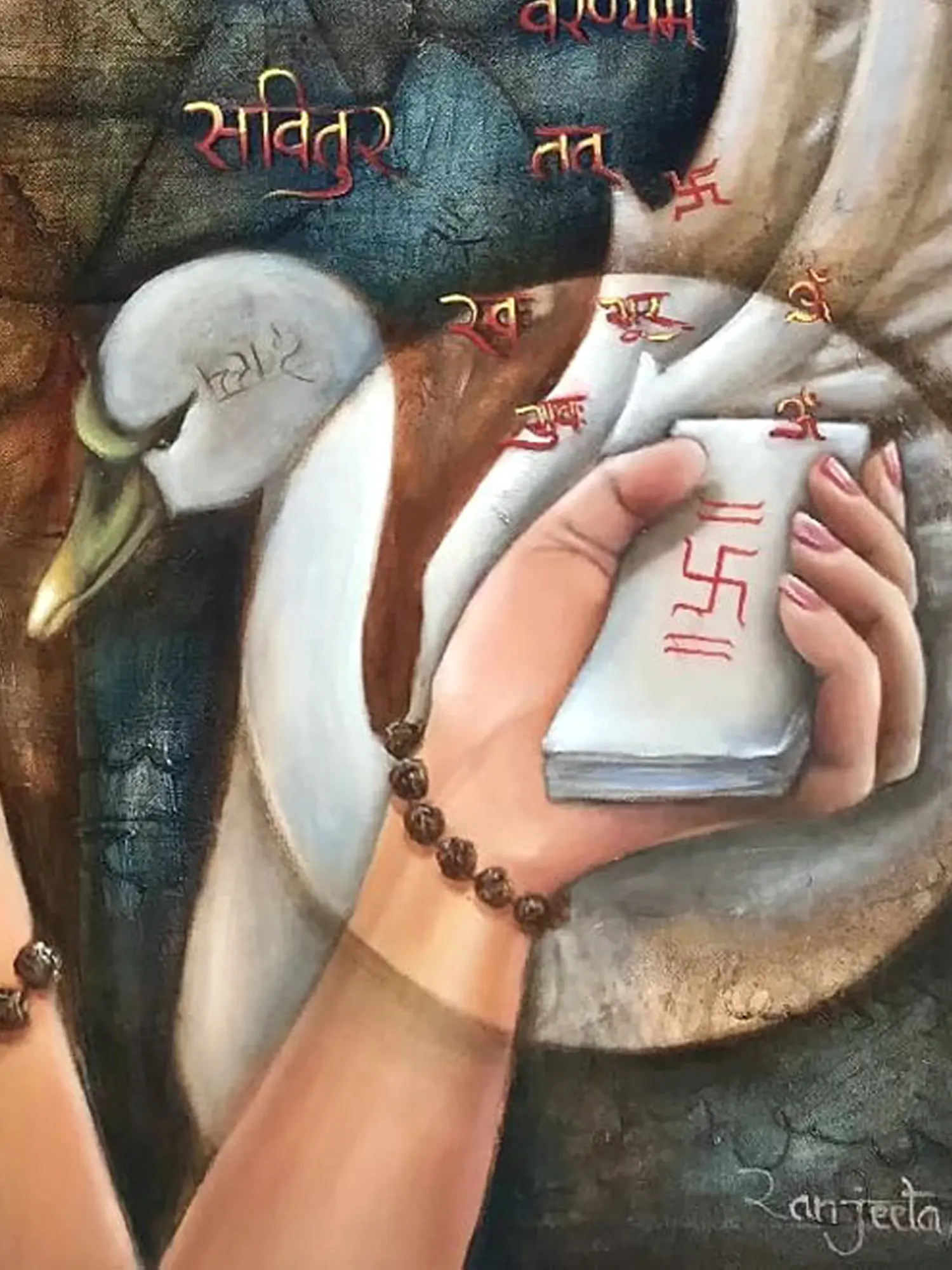 This painting is more than just a beautiful image; it's a window into the soul of the artist and a vibrant testament to the power of art to convey profound spiritual and cultural narratives. Ranjeeta Kumar’s artistic skill in combining realistic portraiture with symbolic imagery creates a work that appeals to both the eye and the mind. The careful attention to detail, the rich colors, and the profound symbolism combine to create a timeless piece that transcends mere decoration. It is a statement piece, a work destined to grace any home or collection, stimulating contemplation and enriching the viewer's understanding of art, mythology and spirituality. It is a masterpiece for the discerning collector who appreciates both aesthetic beauty and intellectual depth.