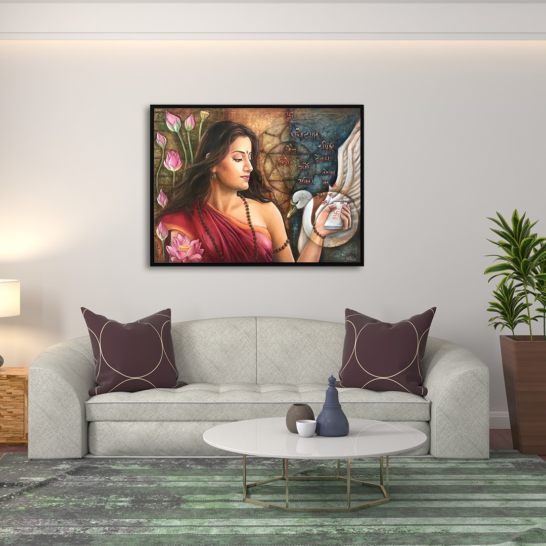 The majestic swan, a creature often associated with grace, beauty, and purity in various mythologies, shares the canvas with the central figure. In Hindu mythology, the swan, or *hamsa*, is a divine bird, often identified with Brahma, the creator god. It is believed to possess the ability to separate milk from water, symbolizing the power of discrimination and the ability to discern truth from illusion. In this painting, the swan appears alongside the woman, enhancing the spiritual undertones of the artwork. The swan's elegant form and serene demeanor complement the woman’s quiet contemplation, creating a visual harmony that speaks to the interconnectedness of nature and spirituality. Its presence subtly suggests a journey of spiritual transformation and the pursuit of inner enlightenment, a theme resonating deeply with Eastern philosophies. The careful placement of the swan, almost as a companion to the central figure, enhances the overall narrative and elevates the artistic impact.