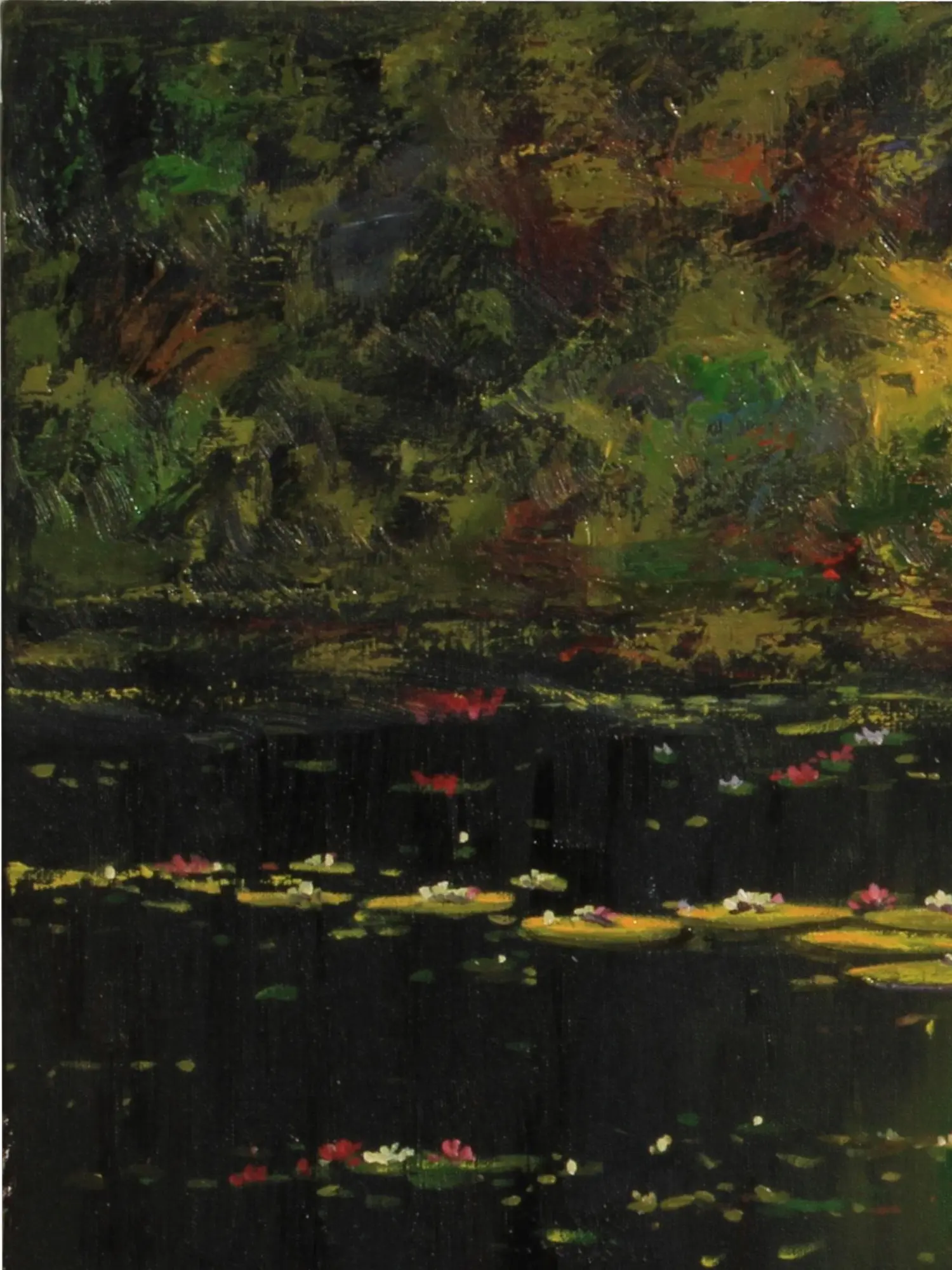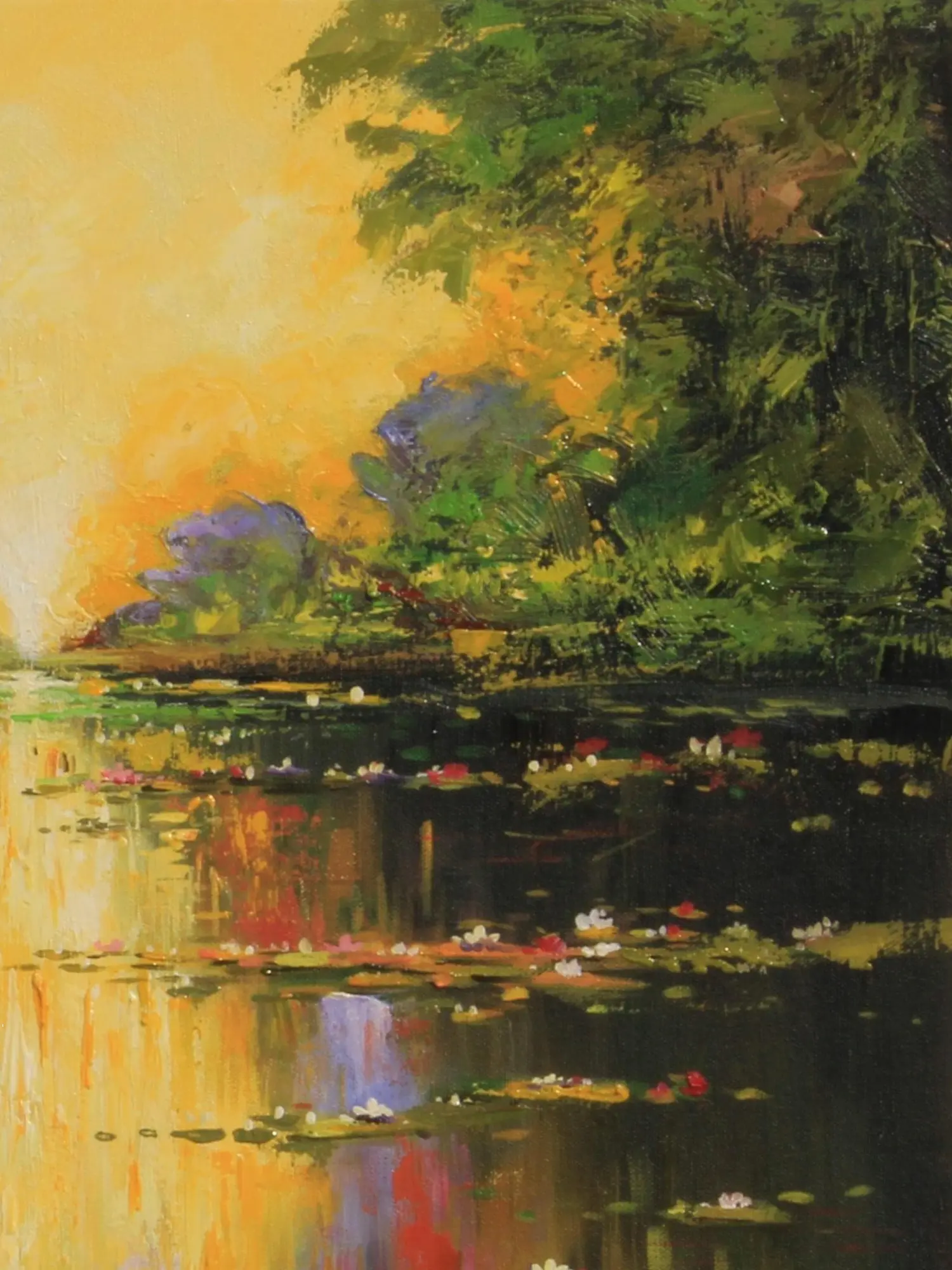 Immerse yourself in a moment of tranquil beauty, where the gentle glow of dawn or dusk dances upon a still pond. This captivating oil on canvas invites you to pause and contemplate the ephemeral perfection of nature, bringing a sense of profound peace into your living space. Prepare to be transported to a realm of quiet contemplation, a sanctuary captured by the artist's skilled hand.
