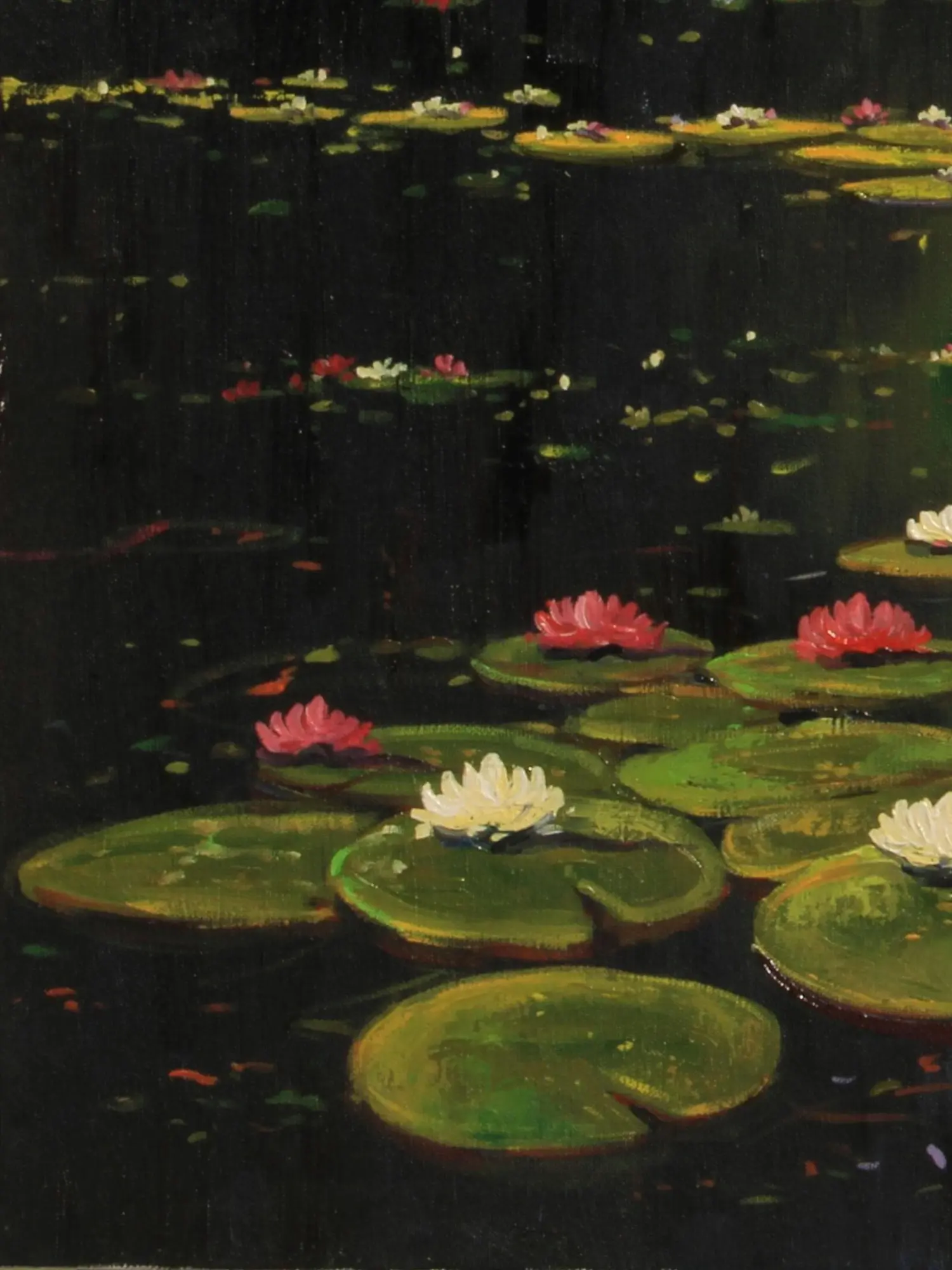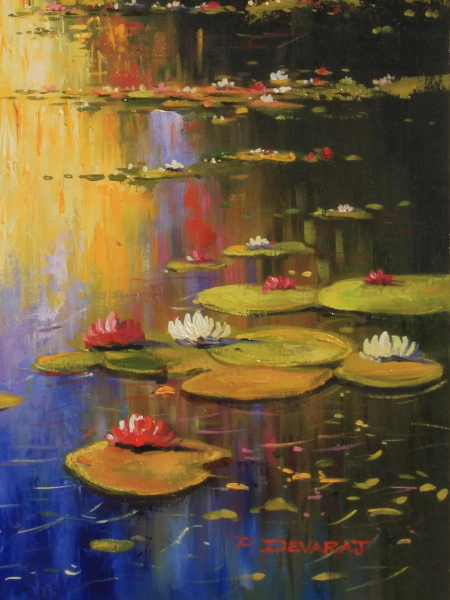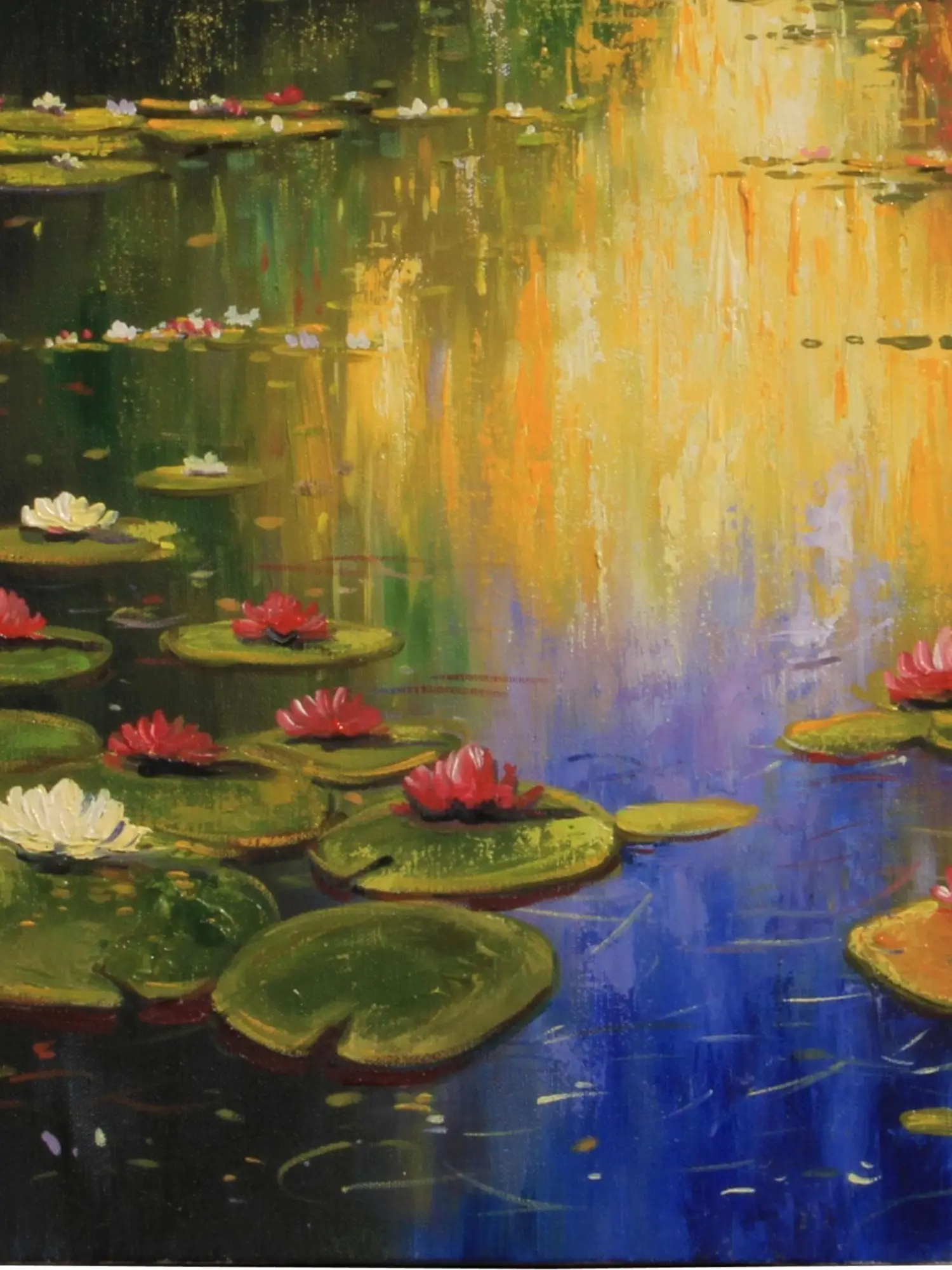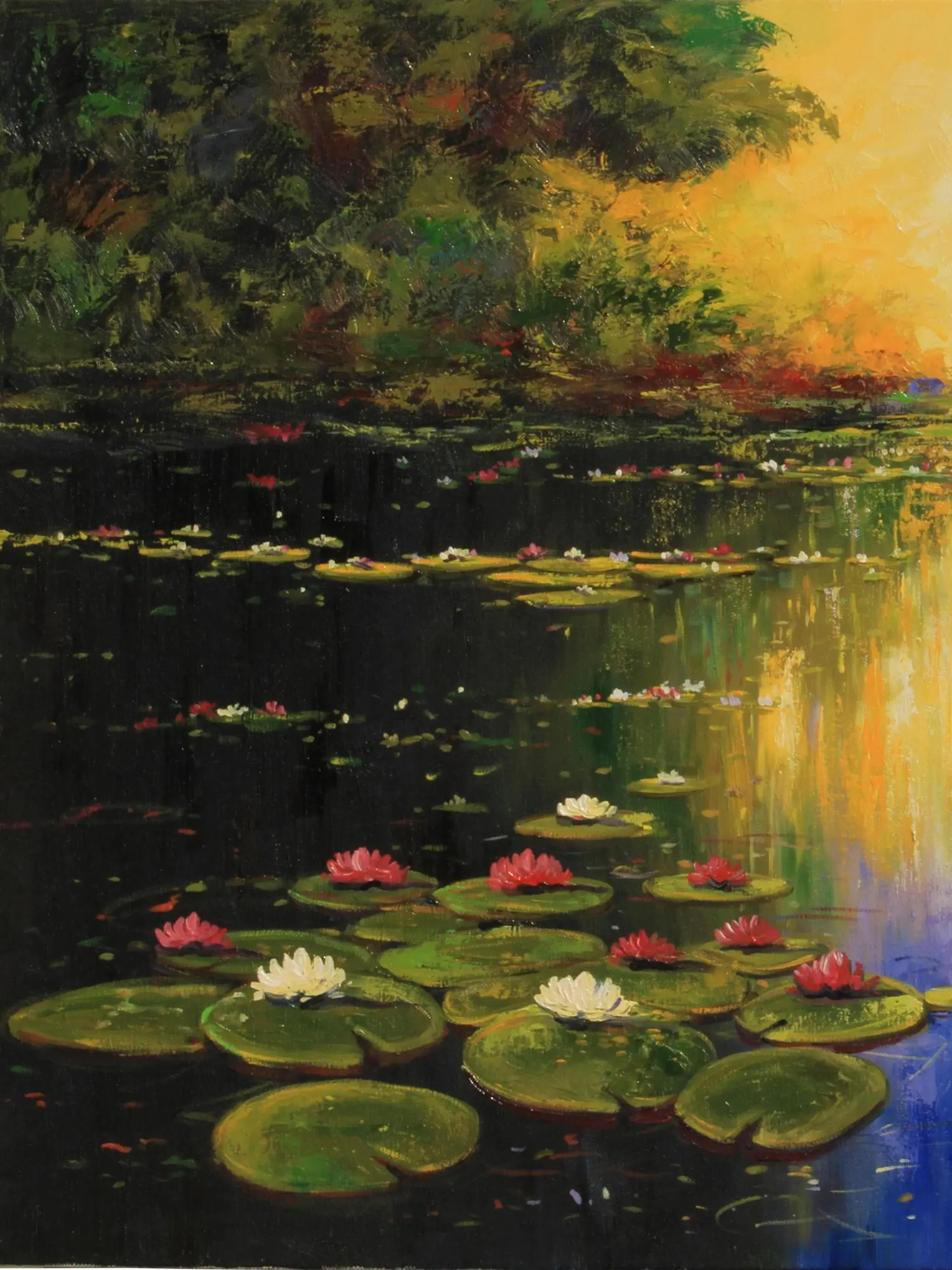 Observe the luminous quality of light as it reflects on the water's surface, a symphony of warm yellows and oranges that contrast beautifully with the deep, serene blues and greens of the pond. The delicate forms of the water lilies, rendered with both precision and fluidity, float gracefully, their petals a soft blush against their verdant pads. You'll be drawn into the carefully composed scene, where the interplay of light and shadow creates a palpable sense of atmosphere and tranquility, showcasing the artist's keen eye for balance and form.
