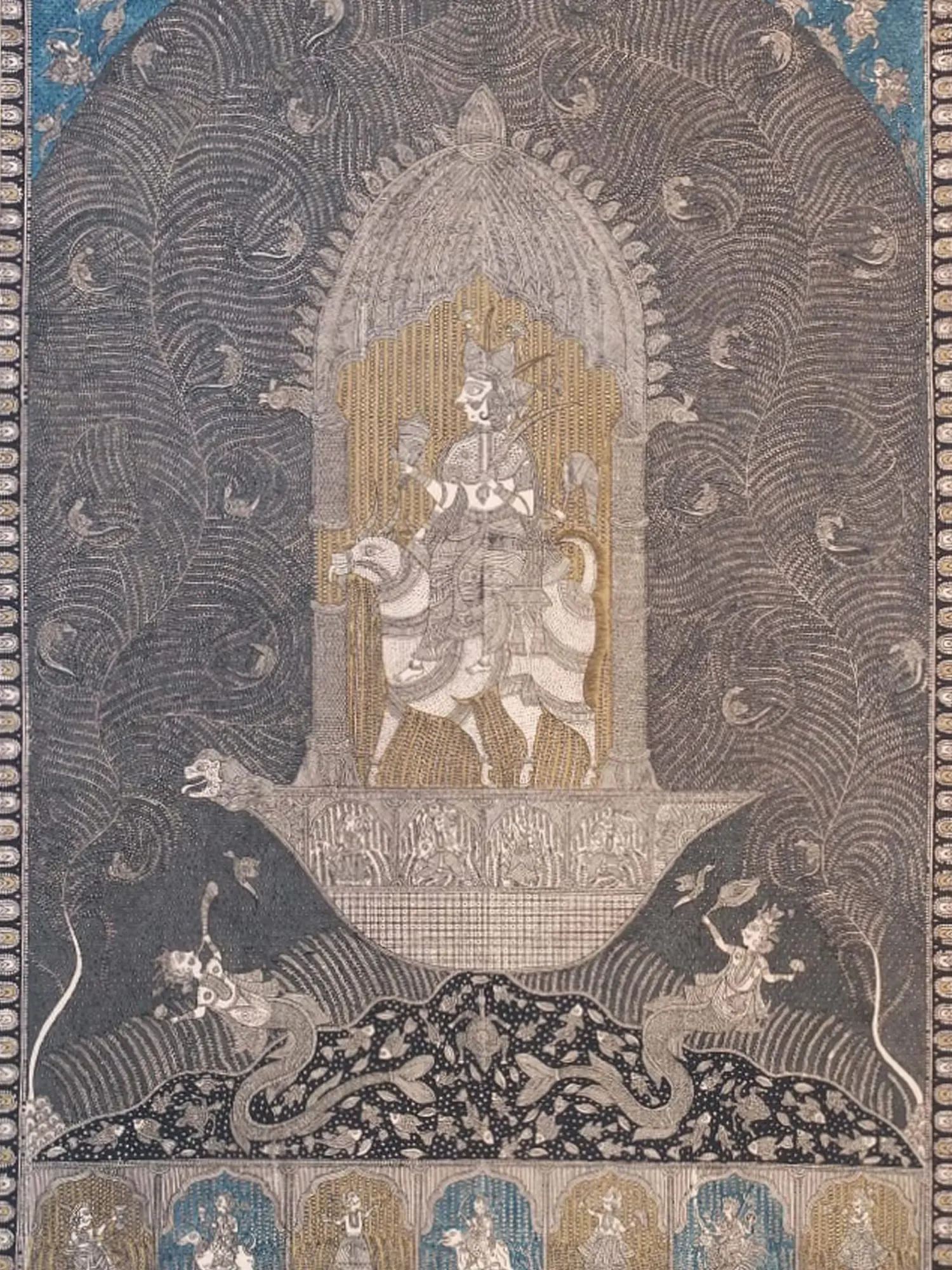 Immerse yourself in the sacred stories of Hindu tradition with this magnificent artwork, a testament to devotional artistry and ancestral techniques. You'll find yourself drawn into a world where deities come alive, rendered with breathtaking detail and profound reverence. This piece offers a unique window into the spiritual heart of India, inviting contemplation and awe.