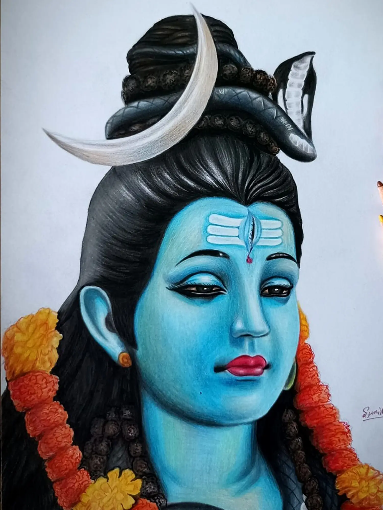 The rosaries gracing his neck signify spiritual wisdom and inner strength. This artwork by the skilled artist Sunil Kumar is not just a visual delight; it is a conduit to spiritual enlightenment, invoking peace and harmony in any space it adorns.