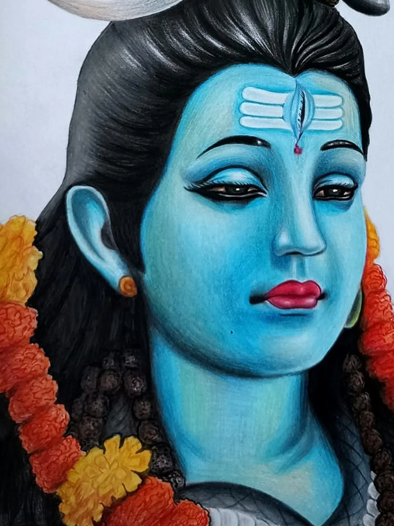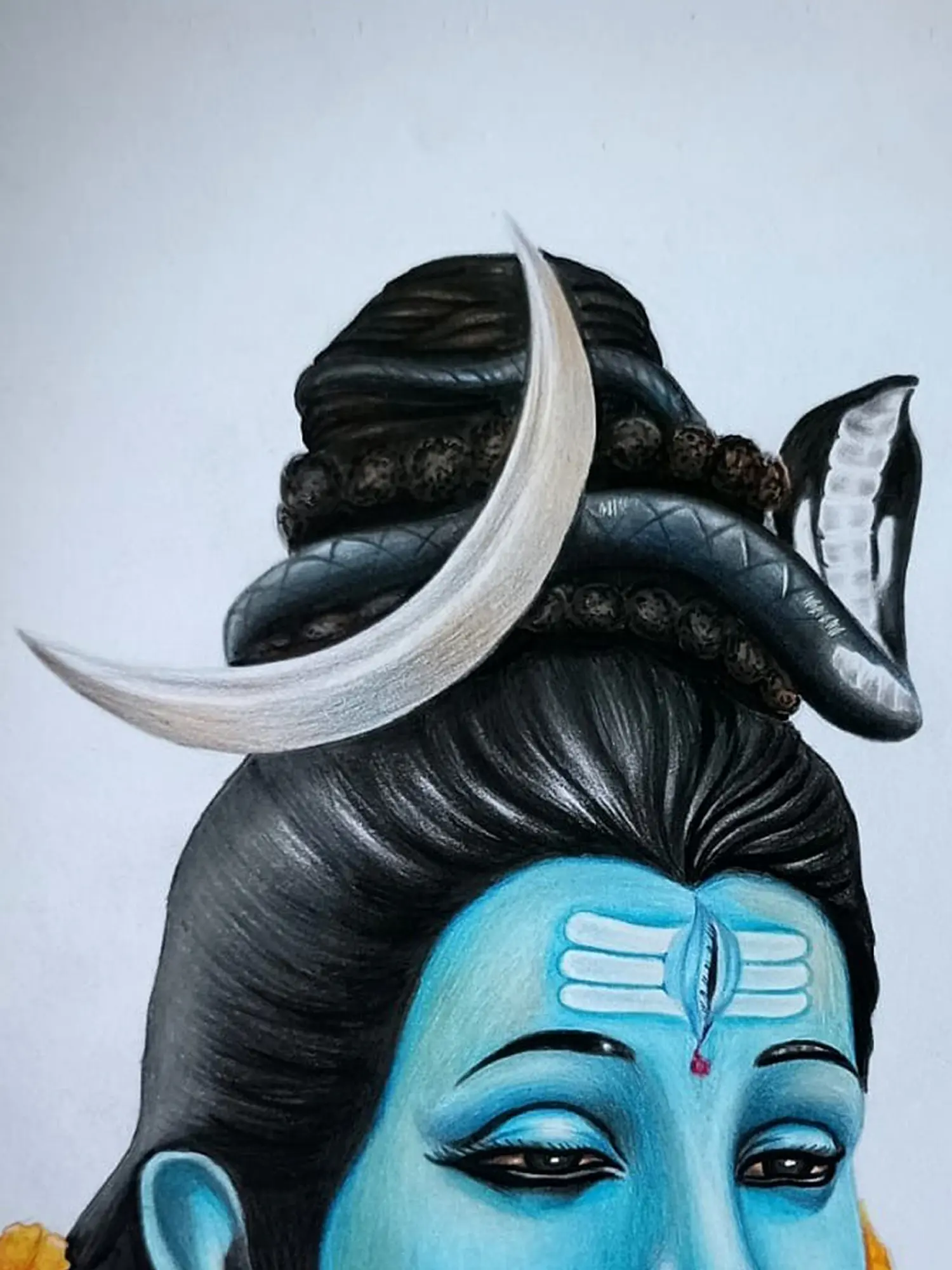 The pure essence of “Lord Shiva” is beautifully and reverently captured in this masterpiece. Gaze upon Mahadev’s serene countenance, his half-closed eyes exuding tranquillity, adorned with the sacred “Tripundra Tilaka,” symbolising his omnipotence. Vasuki, the divine cobra, gracefully coils around his matted locks, while the crescent moon rests atop his head, radiating ethereal light.
