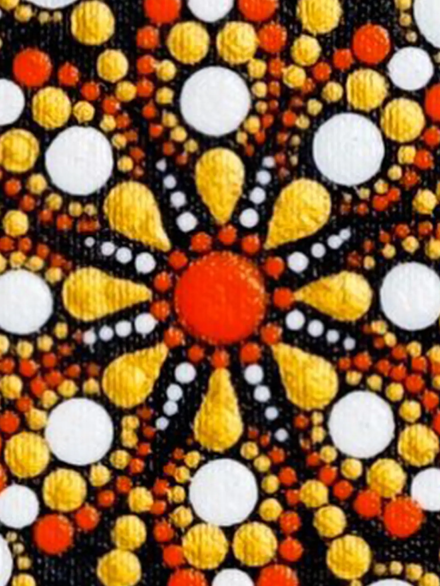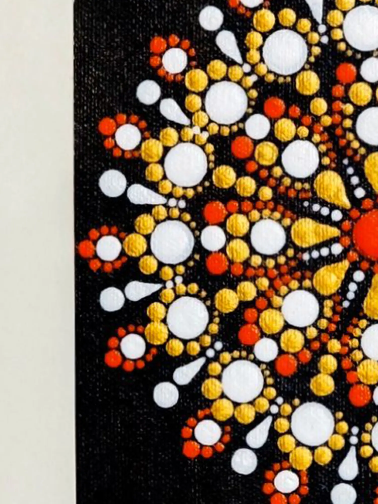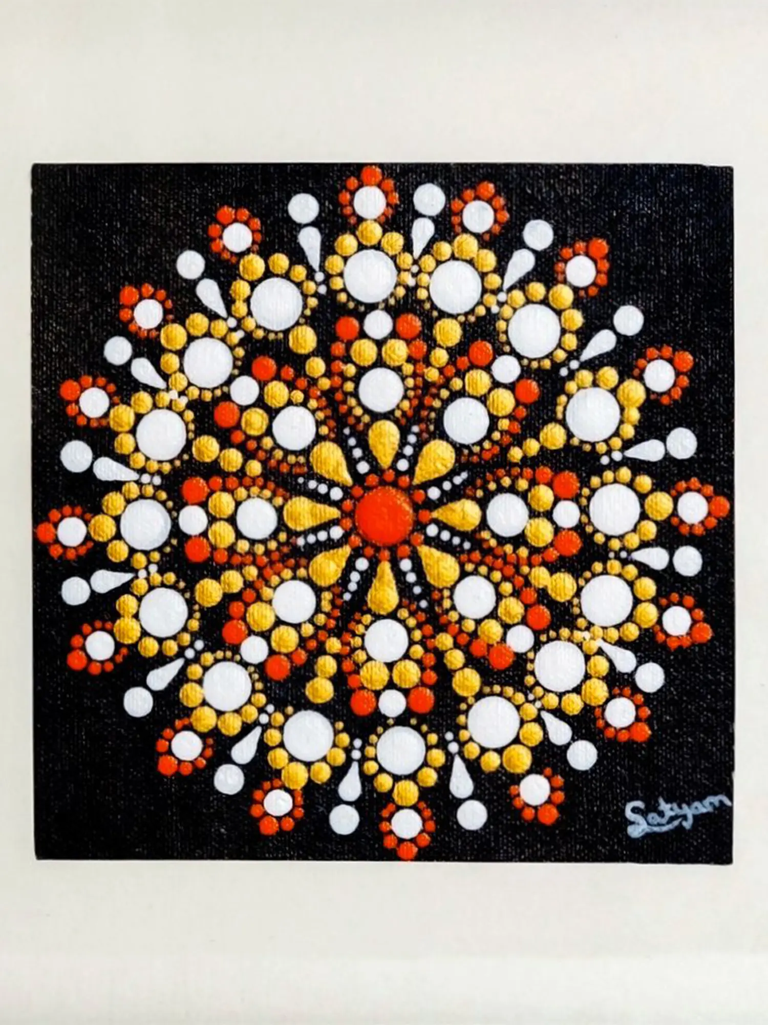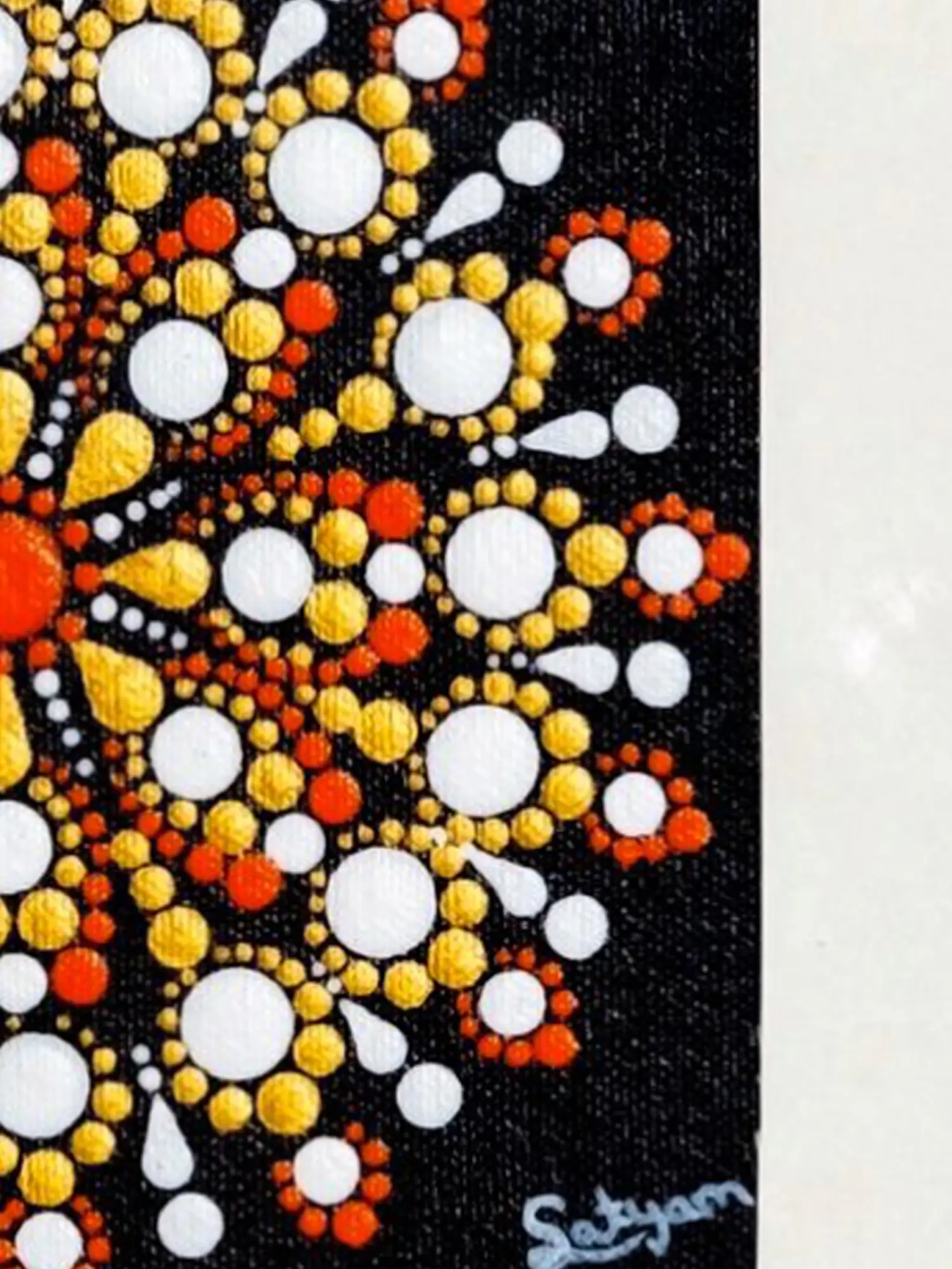 Using orange, white, and yellow colors, Singh's artwork captures the essence of traditional rangoli designs, translating the cultural practice onto canvas through the precision of dot art. The piece not only showcases the evolution of artistic techniques but also pays homage to cultural aesthetics, merging tradition with the innovative approach of dot artistry.