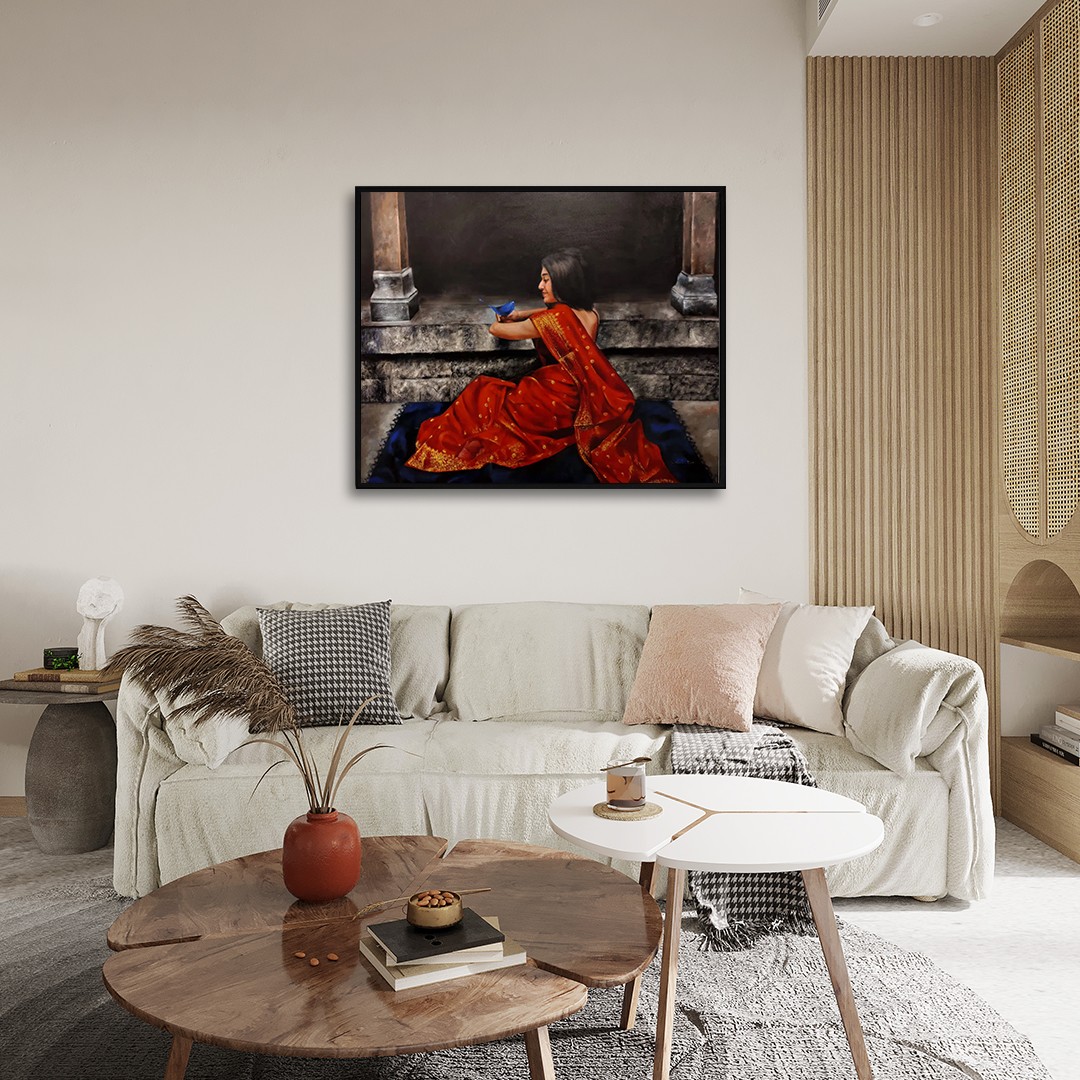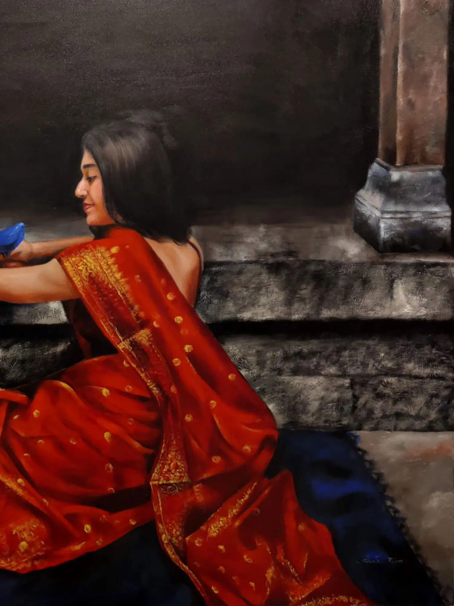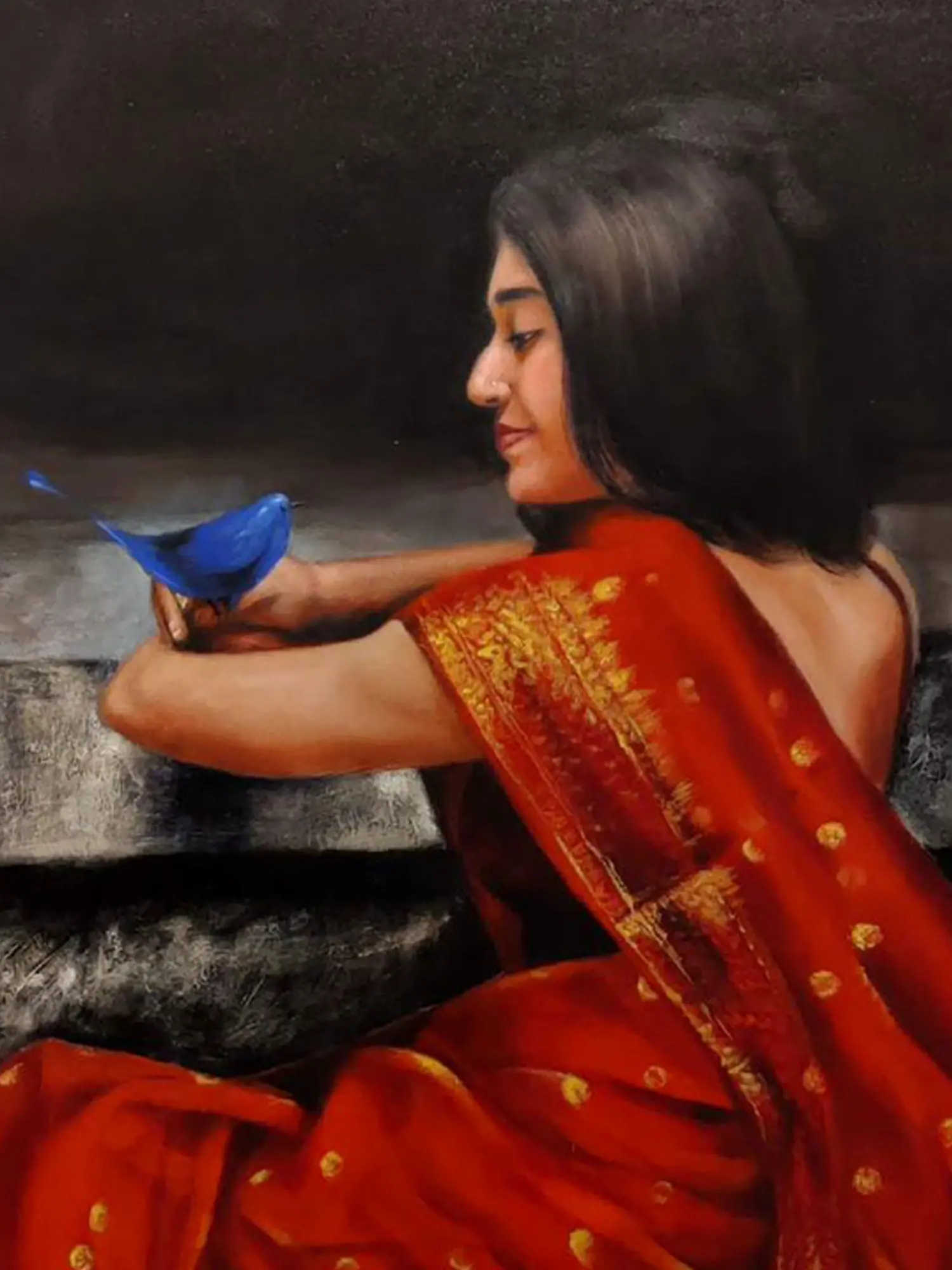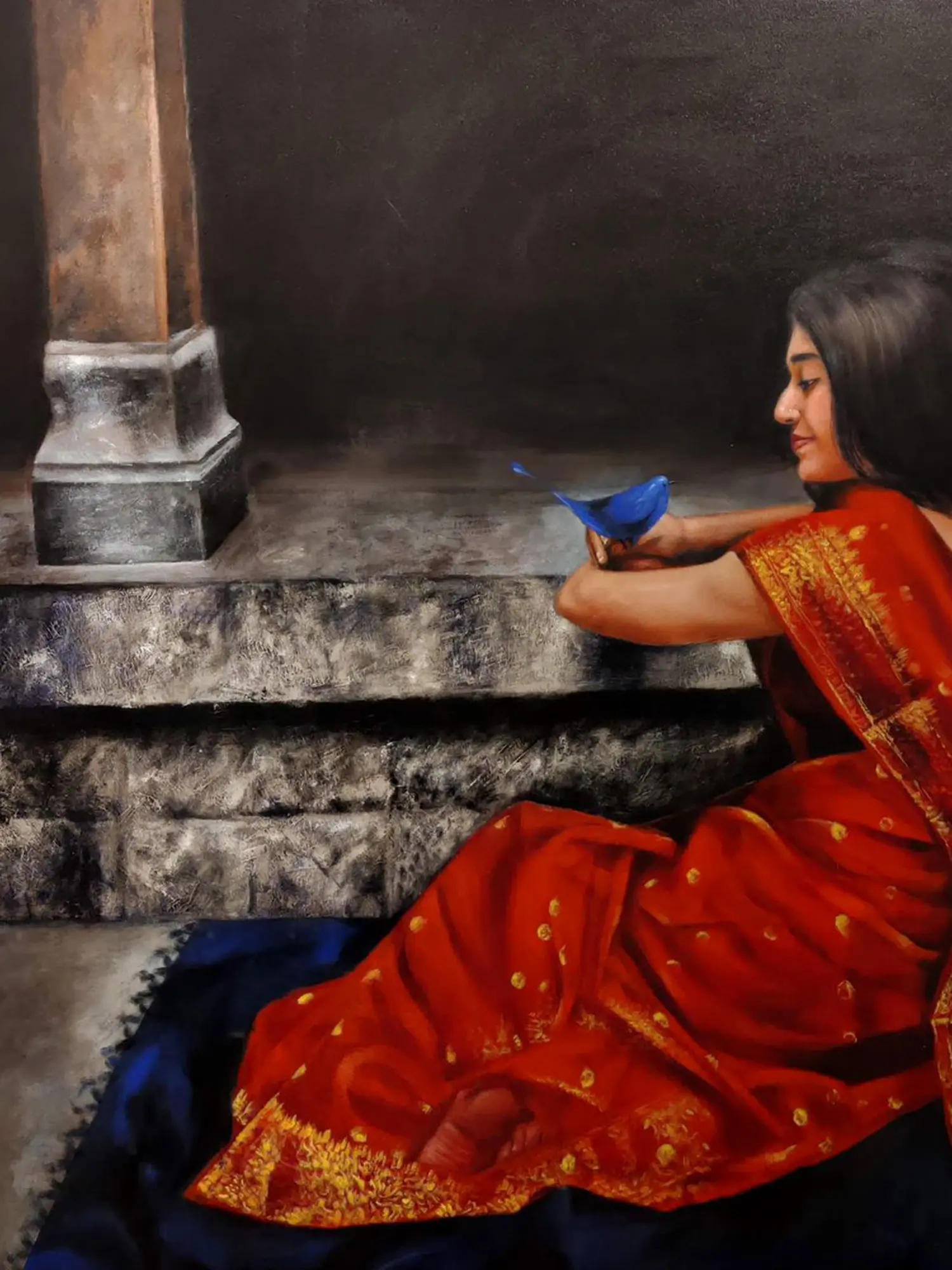 Shweta Rukme’s skill lies not just in her technical mastery of acrylics on canvas, but in her ability to evoke emotion through her art. The artist's attention to detail is evident in the meticulous rendering of the saree's texture, the subtle nuances in the woman's facial expression, and the realistic portrayal of the stone platform. The background, rendered in dark, somber tones, further emphasizes the figure of the woman and the bird, drawing the viewer's focus to the heart of the narrative. This piece invites contemplation, inviting viewers to ponder the woman's thoughts and feelings, and to connect with the universal themes of waiting and anticipation. The painting is a testament to the power of art to capture a fleeting moment and transform it into a timeless piece of beauty and introspection.