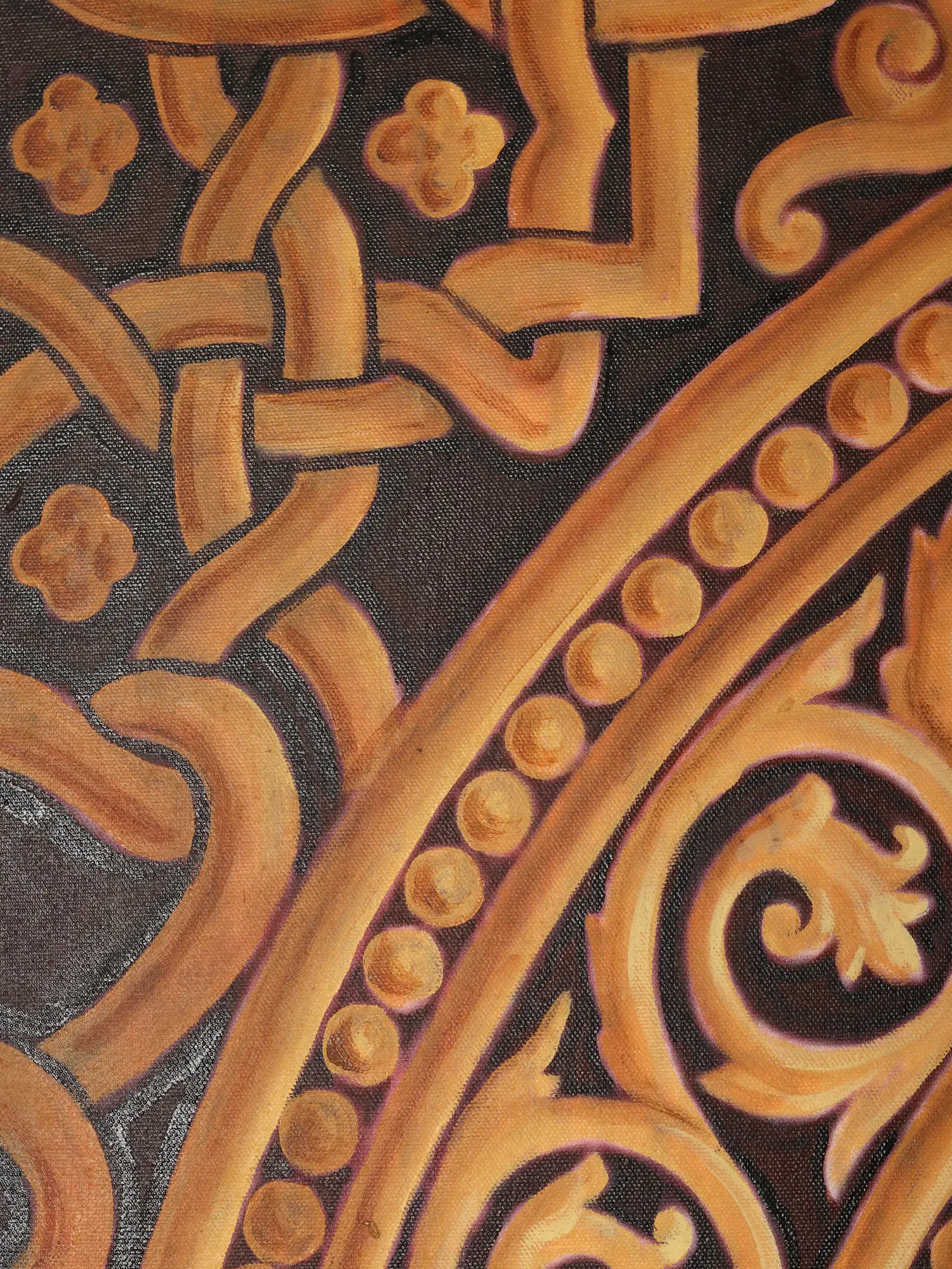 The artists use either a wood panel or canvas made from linen or cotton. Sometimes the canvas is stretched onto the wooden frame to form a solid base, or cardboard may be used. The canvas is coated with a layer of white paint or chalk mixed with animal glue. This mixture is then smoothed and dried to form a uniform, textured surface. The wooden panel is more expensive and heavier but its solidity is an advantage in making detailed paintings with ease.