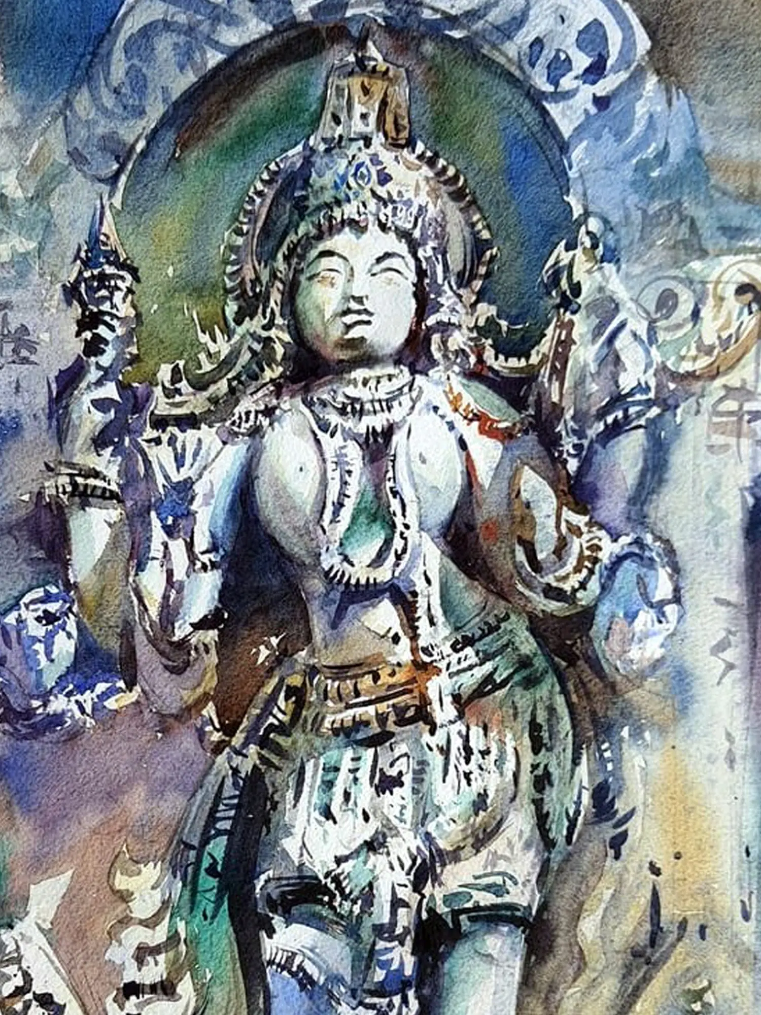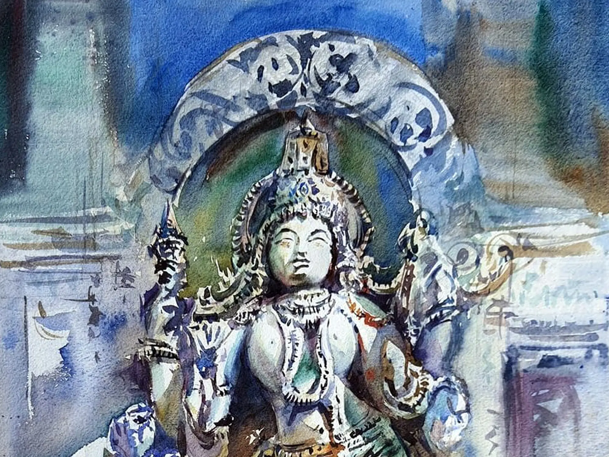 Immerse yourself in the enduring spirit of Indian temple art, captured with breathtaking fluidity. This exquisite watercolor rendering invites you to contemplate the sacred, bringing a sense of timeless reverence into your space. You’ll feel transported to the hallowed halls where faith and artistry converge.