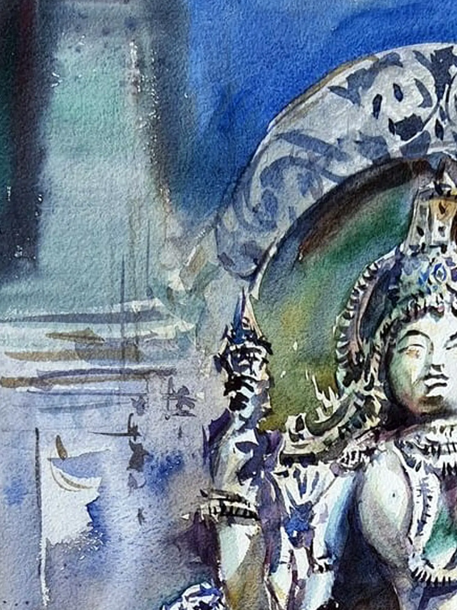 The composition unfolds across a generous 15.90 inches in height and 11.80 inches in width, allowing the intricate details of the sculpted figure to command your gaze. Notice how the vibrant blues of the background create a striking contrast with the muted tones of the sculpture, enhancing its three-dimensional presence. The artist masterfully uses washes to suggest depth and form, drawing you deeper into the scene.