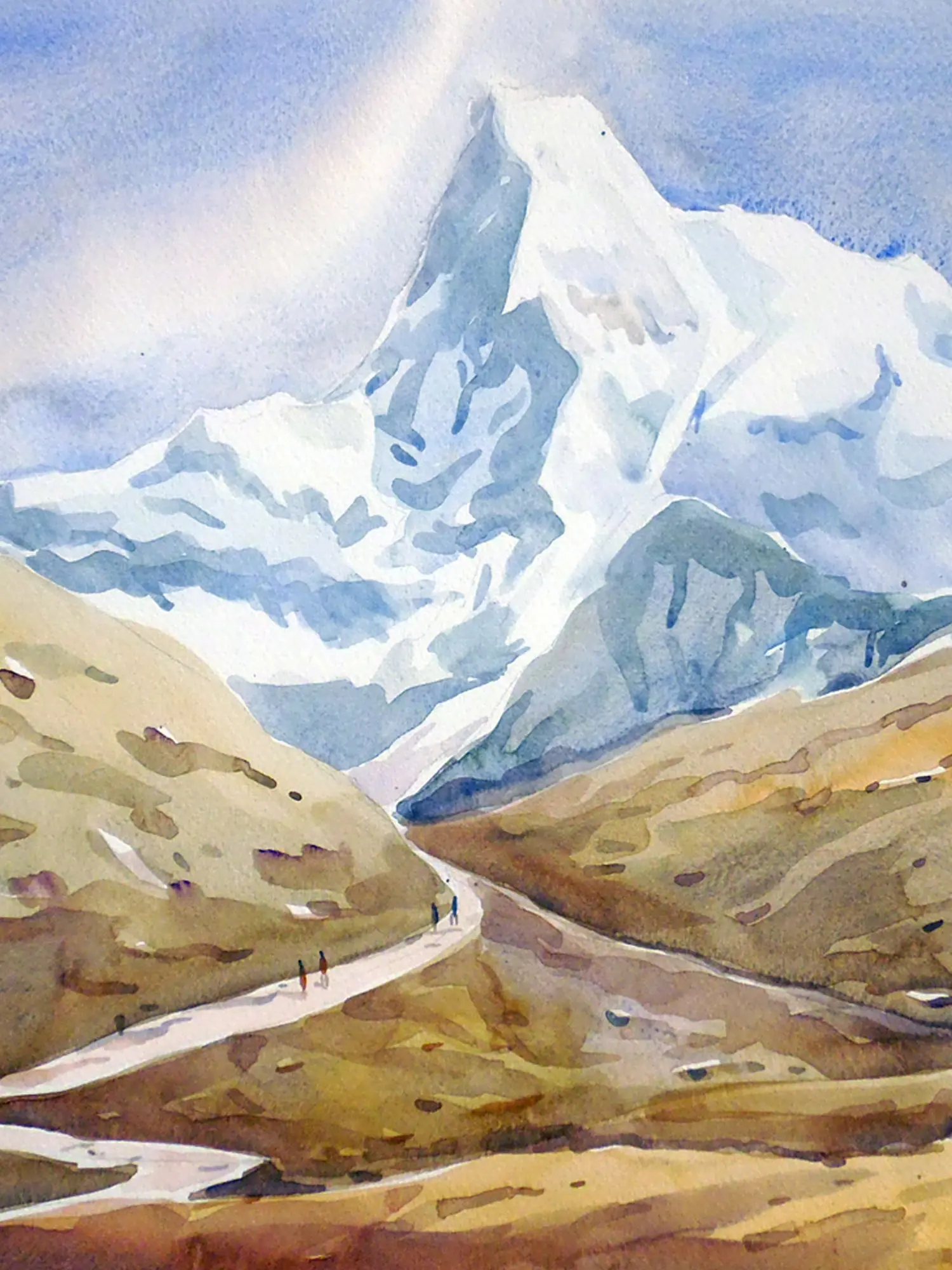 Step into a world of breathtaking natural grandeur, where towering peaks kiss the sky and ancient paths beckon. You'll be transported to a place of profound serenity, experiencing the awe-inspiring beauty of the world's highest mountain range through an artist's masterful vision. This evocative landscape captures the very essence of Himalayan splendor, offering a daily reminder of nature's unparalleled power and delicate artistry.