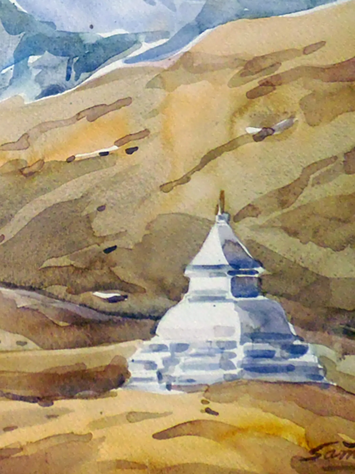 This portrayal evokes the timeless spirit of the Himalayas, a region steeped in rich cultural and spiritual history. The iconic snow-capped peaks have long been revered as sacred abodes, drawing pilgrims and adventurers alike. The presence of the stupa, a symbol of peace and enlightenment in Buddhist tradition, further connects this artwork to the profound spiritual tapestry of the region. It speaks to journeys undertaken, both physical and spiritual, and the enduring allure of these majestic landscapes.