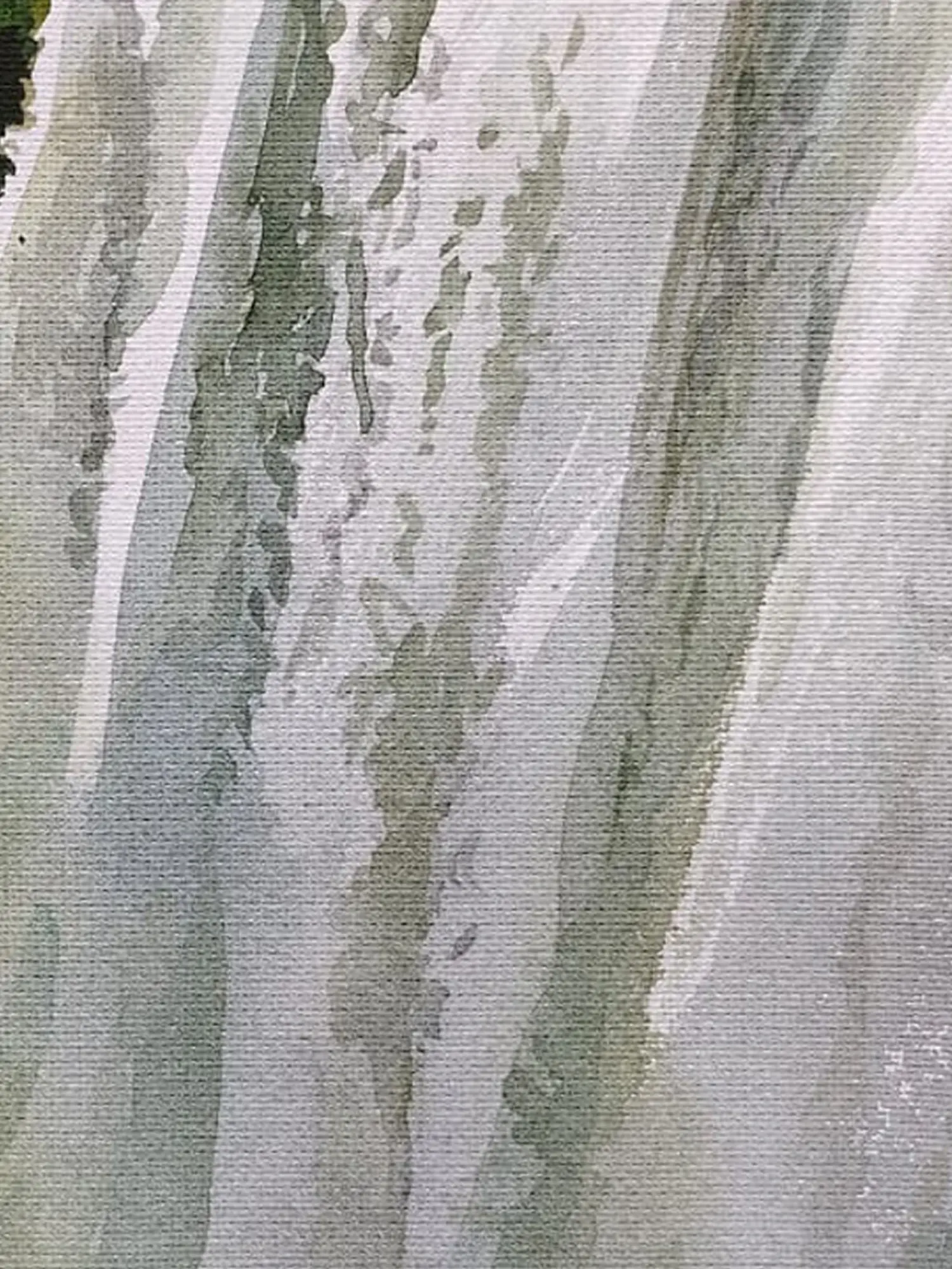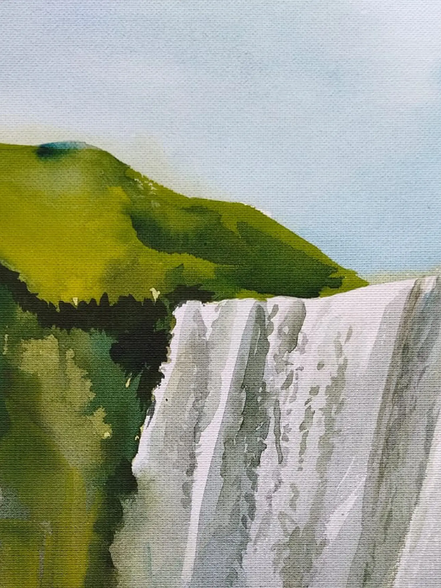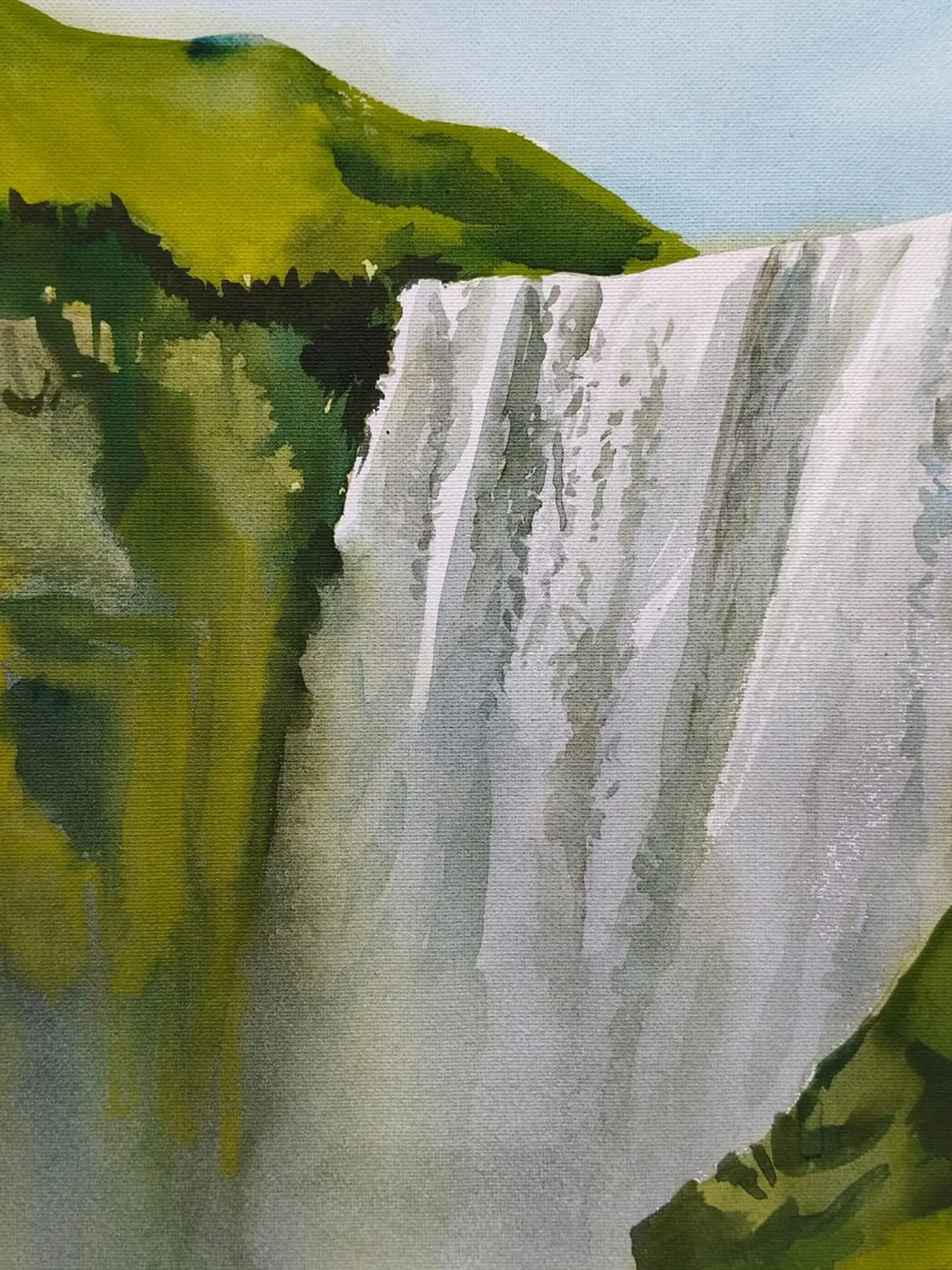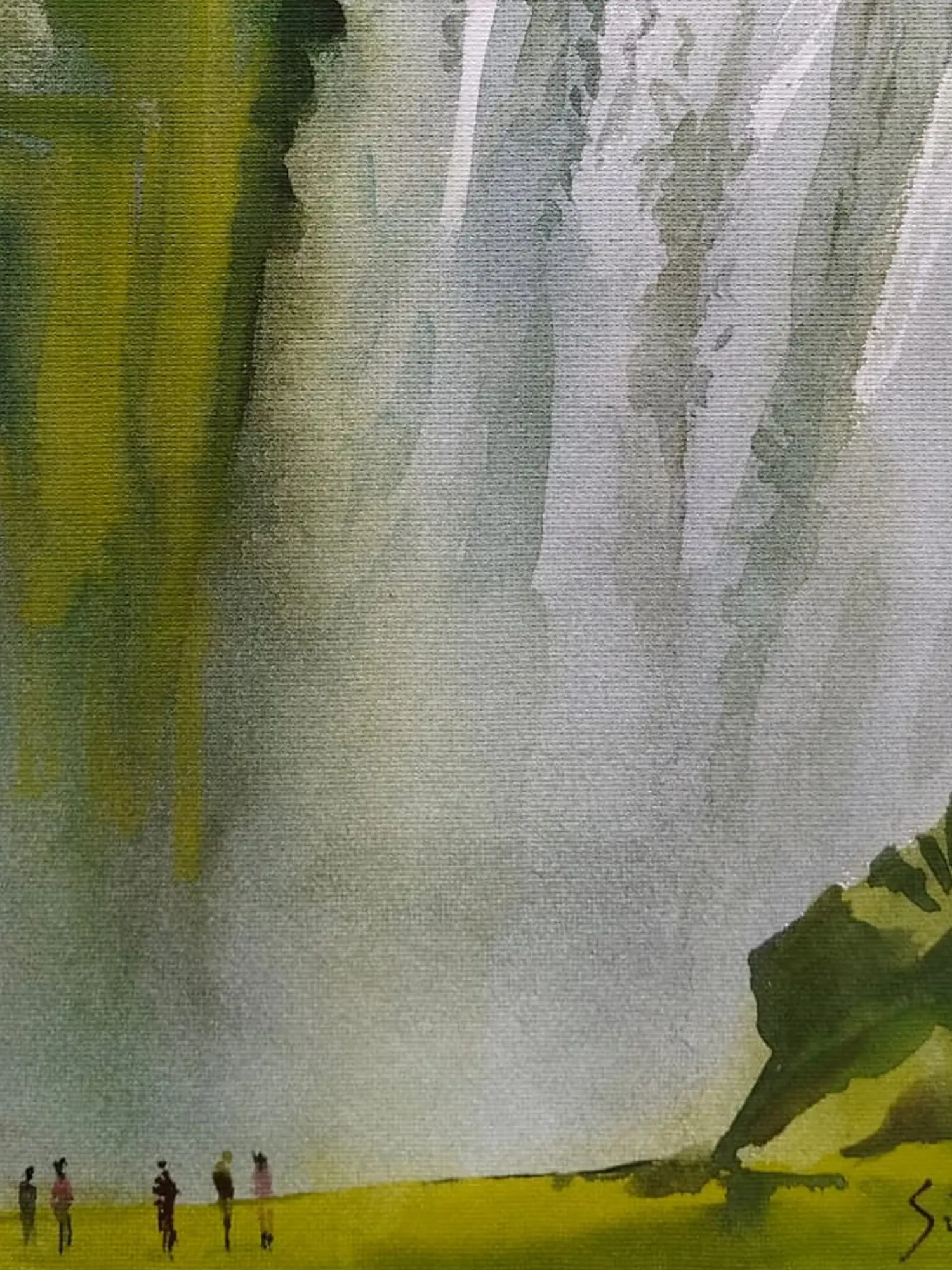 The contrast between the vibrant greens and the striking white of the waterfall enhances its grandeur, while delicate black shading adds depth and detail. Through meticulous layering, the painting transports viewers to a serene oasis, celebrating the awe-inspiring beauty of the natural landscape.