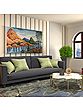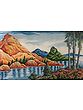 The accompanying background also captures trees that now fill up the mustard, brown and orange tinged barren rugged mountain complimented by a finely carved sapphire colored hill along with a basil and emerald blended mountain that matches in stone type to the distant bluish grey volcanic mountain. Lovely light brown dune like hills surround the biggest mountain that the artist finely captures with his brush strokes.