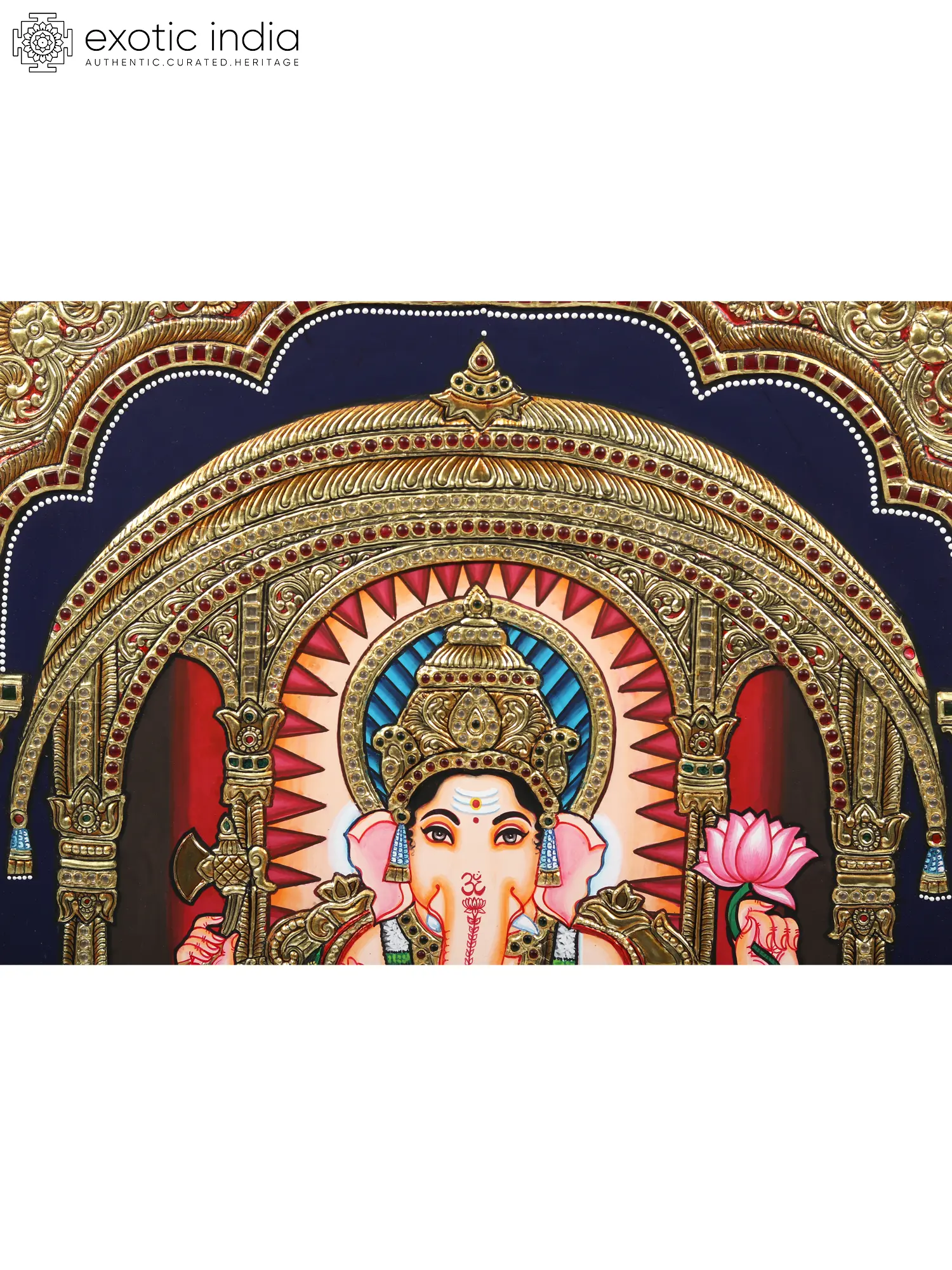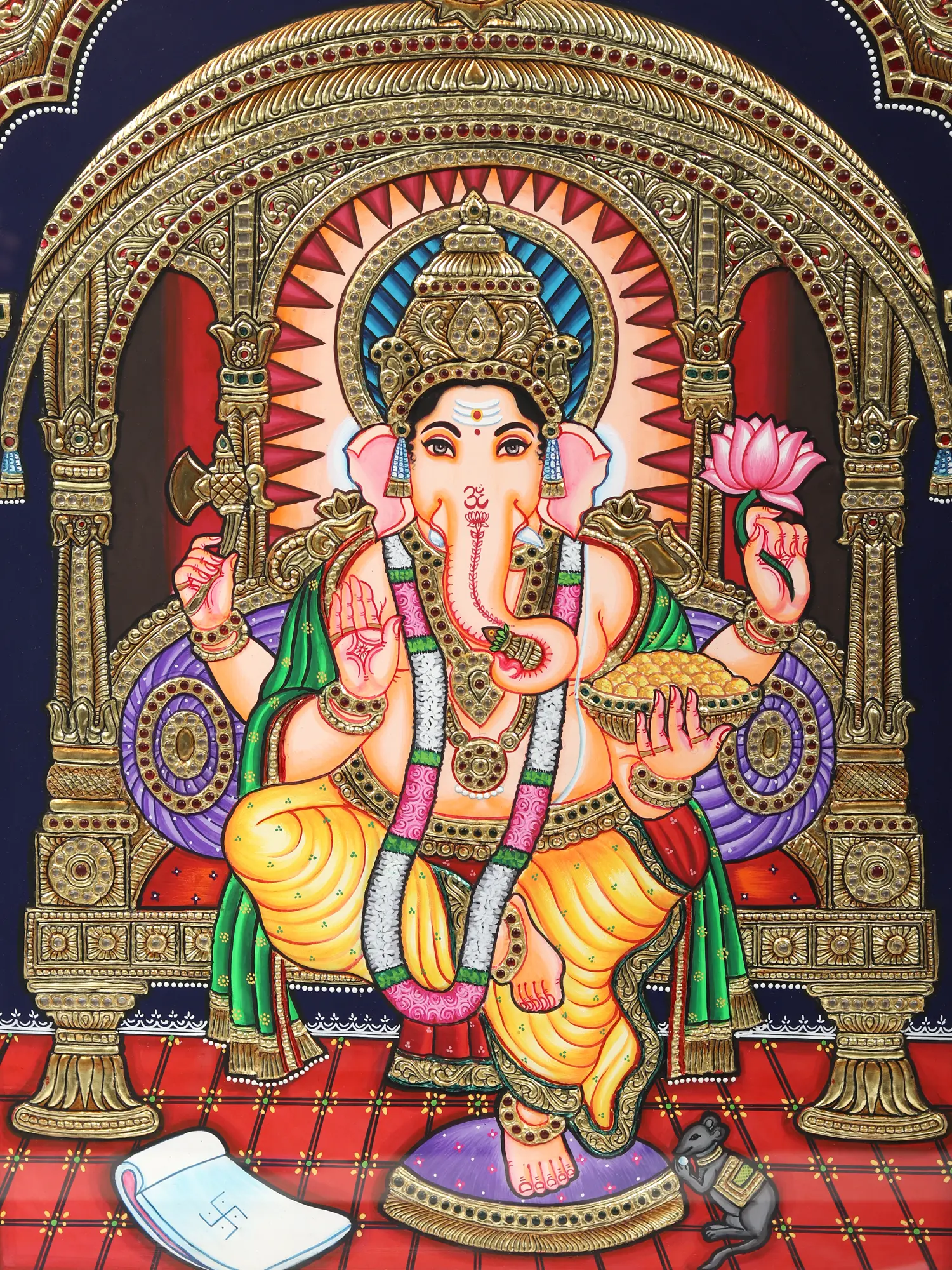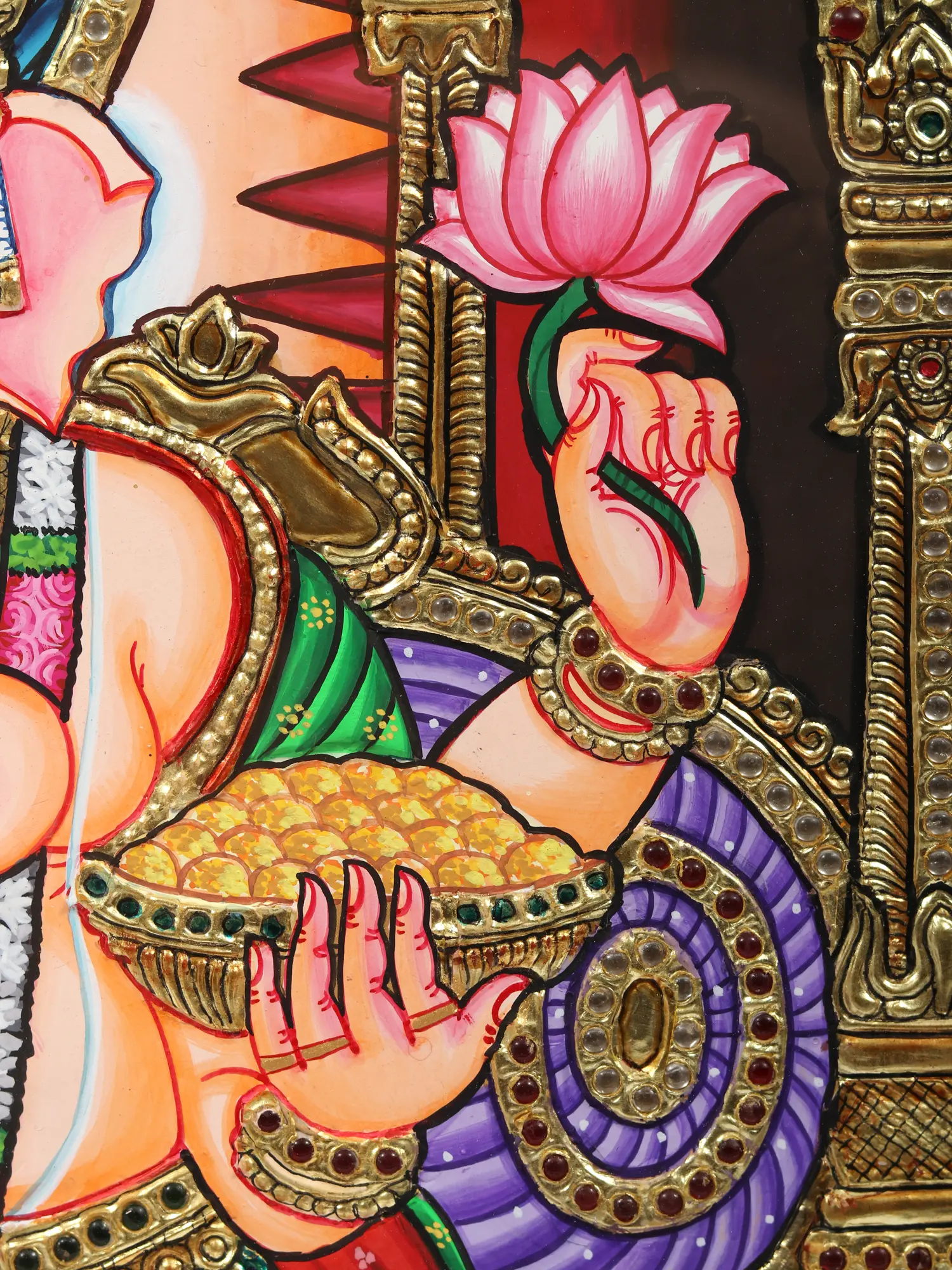 Chaturbhuj Ganesha Glass Painting with Wooden Frame