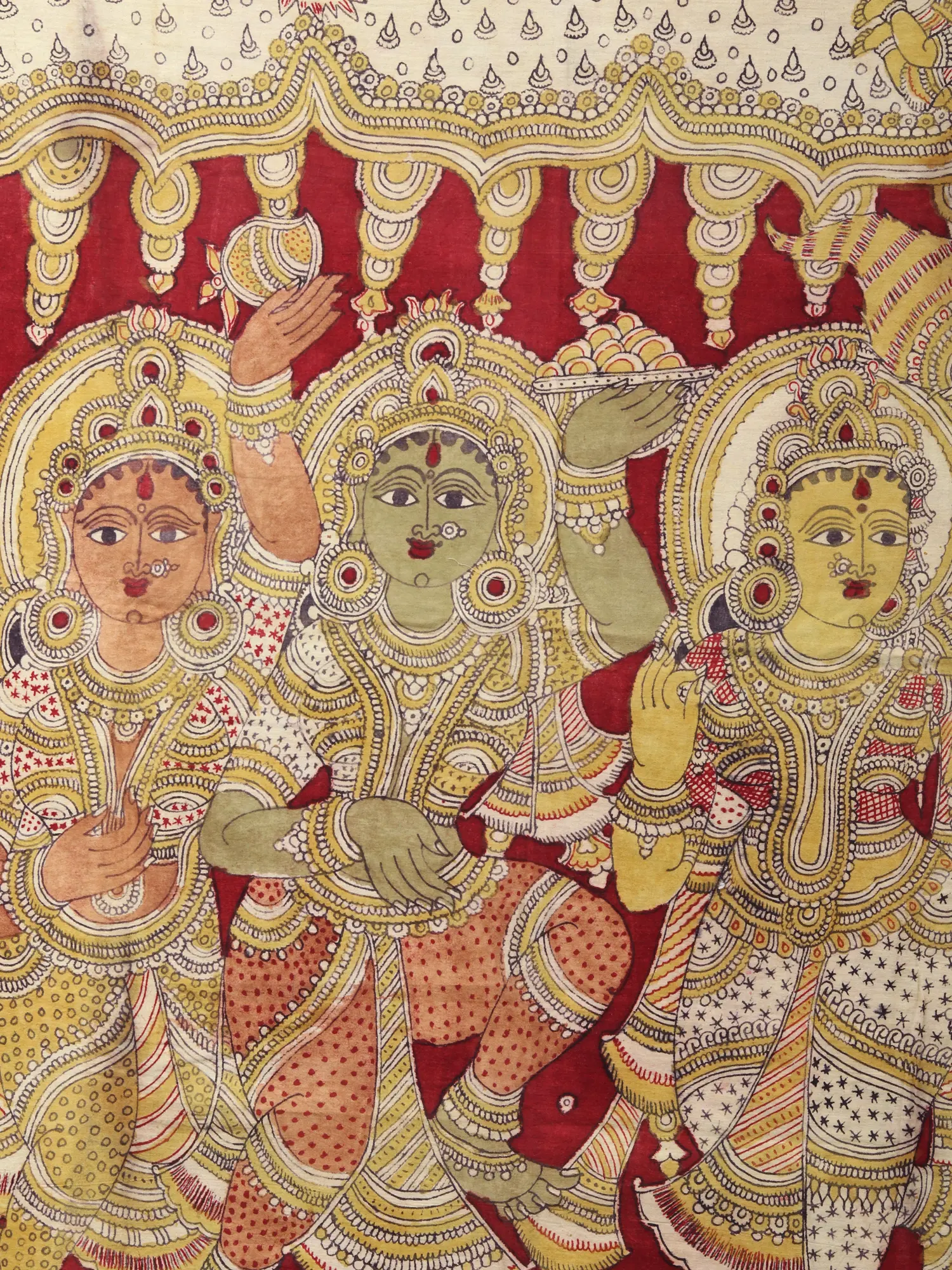 The composition is a symphony of color and form, with a commanding presence that measures 43.5 inches in height and an expansive 70.5 inches in width. Bold yet harmonious borders frame the central scene, drawing your gaze towards the divine figures. The rich crimson background provides a striking contrast to the detailed figures and their adorned garments, creating a visually captivating experience. You'll appreciate the delicate ornamentation and the dynamic poses that convey a sense of movement and spiritual exuberance.