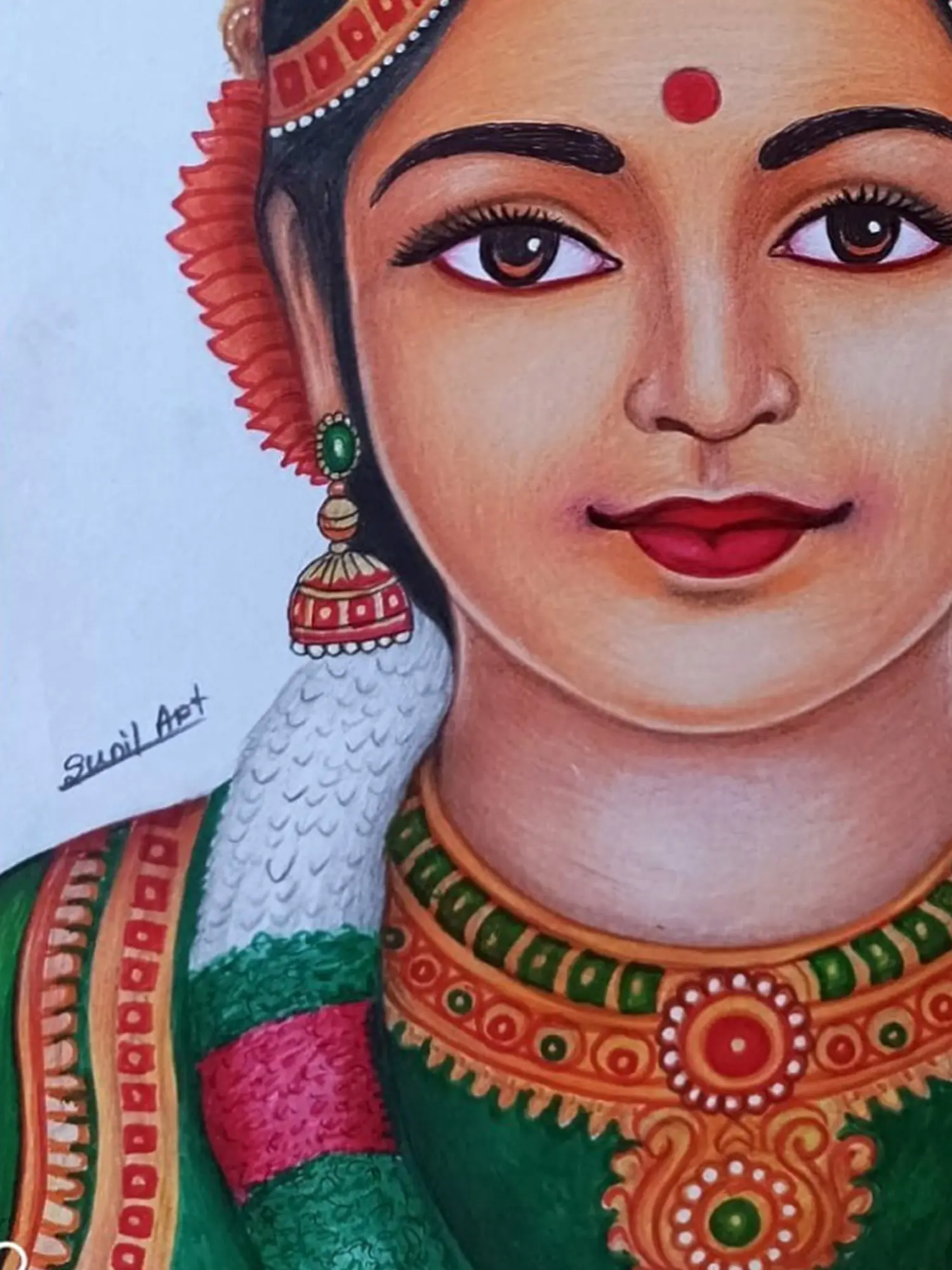 The 11.70-inch height by 8.30-inch width canvas provides an intimate yet impactful viewing experience. You'll be drawn to the expressive eyes, the graceful curve of the lips, and the vibrant colors of the traditional attire and ornate jewelry. The artist’s keen eye for detail is evident in the delicate rendering of the elaborate headdress, the shimmering jhumka earrings, and the rich textures of the garland, all contributing to a compelling visual narrative that commands admiration.