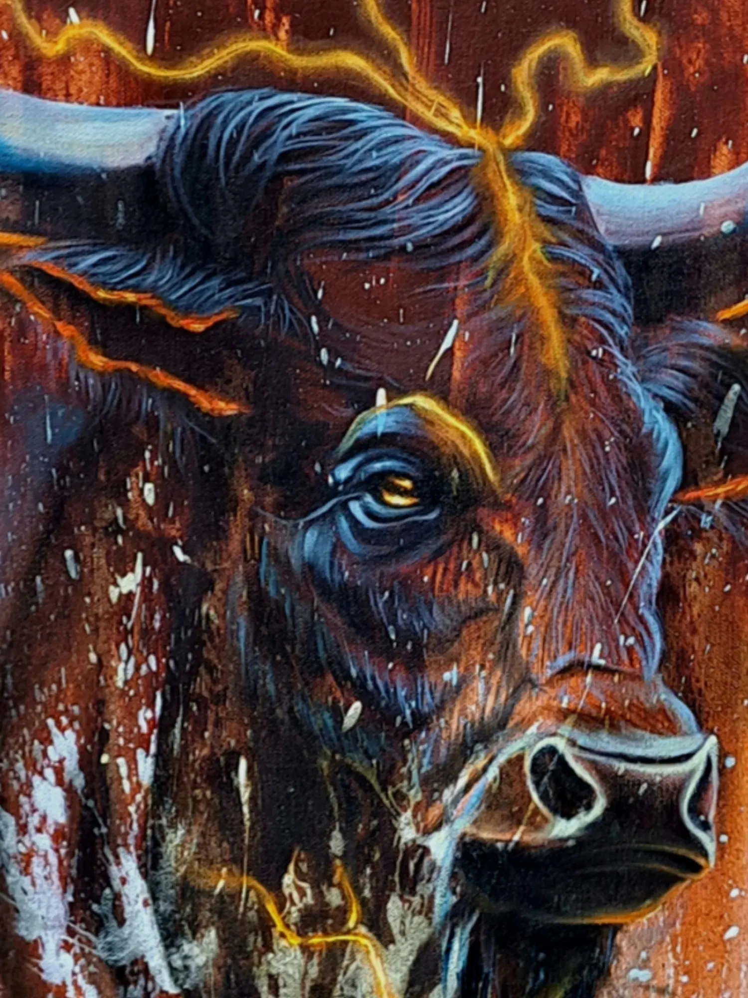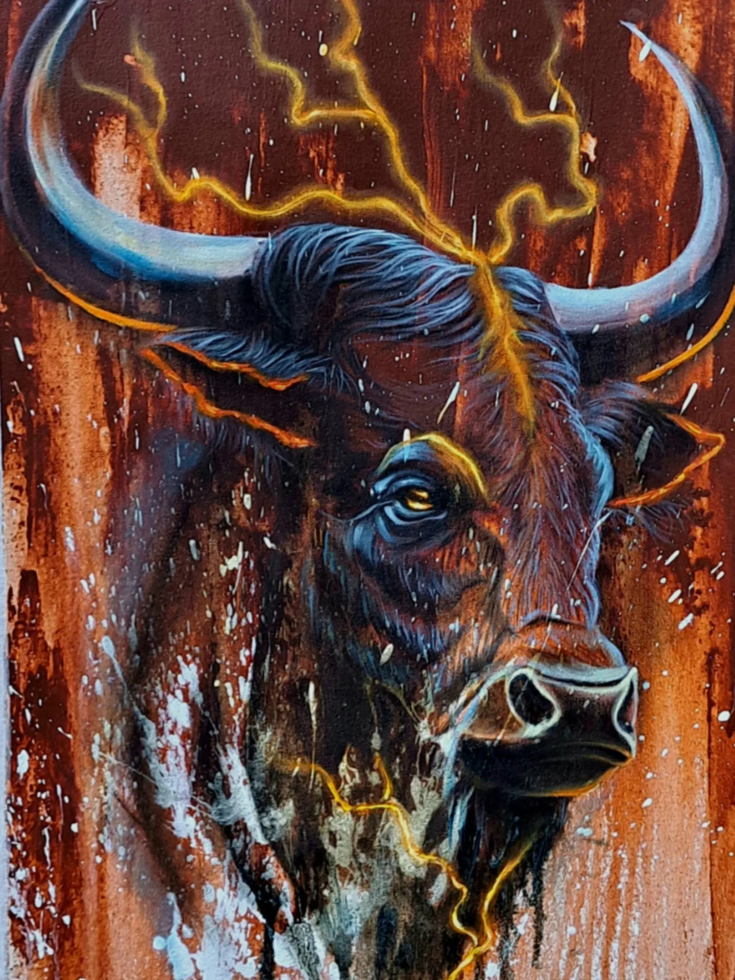 The bull, throughout history and across many cultures, has been a powerful symbol. In Greek mythology, Zeus, the king of the gods, often transformed himself into a magnificent bull to seduce women. The Minotaur, a monstrous creature with the head of a bull and the body of a man, resided in the labyrinth of Crete, a symbol of primal fear and the unknown. In Hinduism, Nandi, the sacred bull, is the mount of Shiva, a representation of strength, devotion, and spiritual guidance. Across many cultures, bulls have represented power, virility, and fertility. This artwork captures the essence of these enduring symbolic meanings, weaving them into a contemporary visual narrative. The artist's creative use of bold colors and energetic lines elevates the bull beyond a mere depiction, imbuing it with an almost mythical quality that speaks to the enduring power and mystery of this magnificent creature.