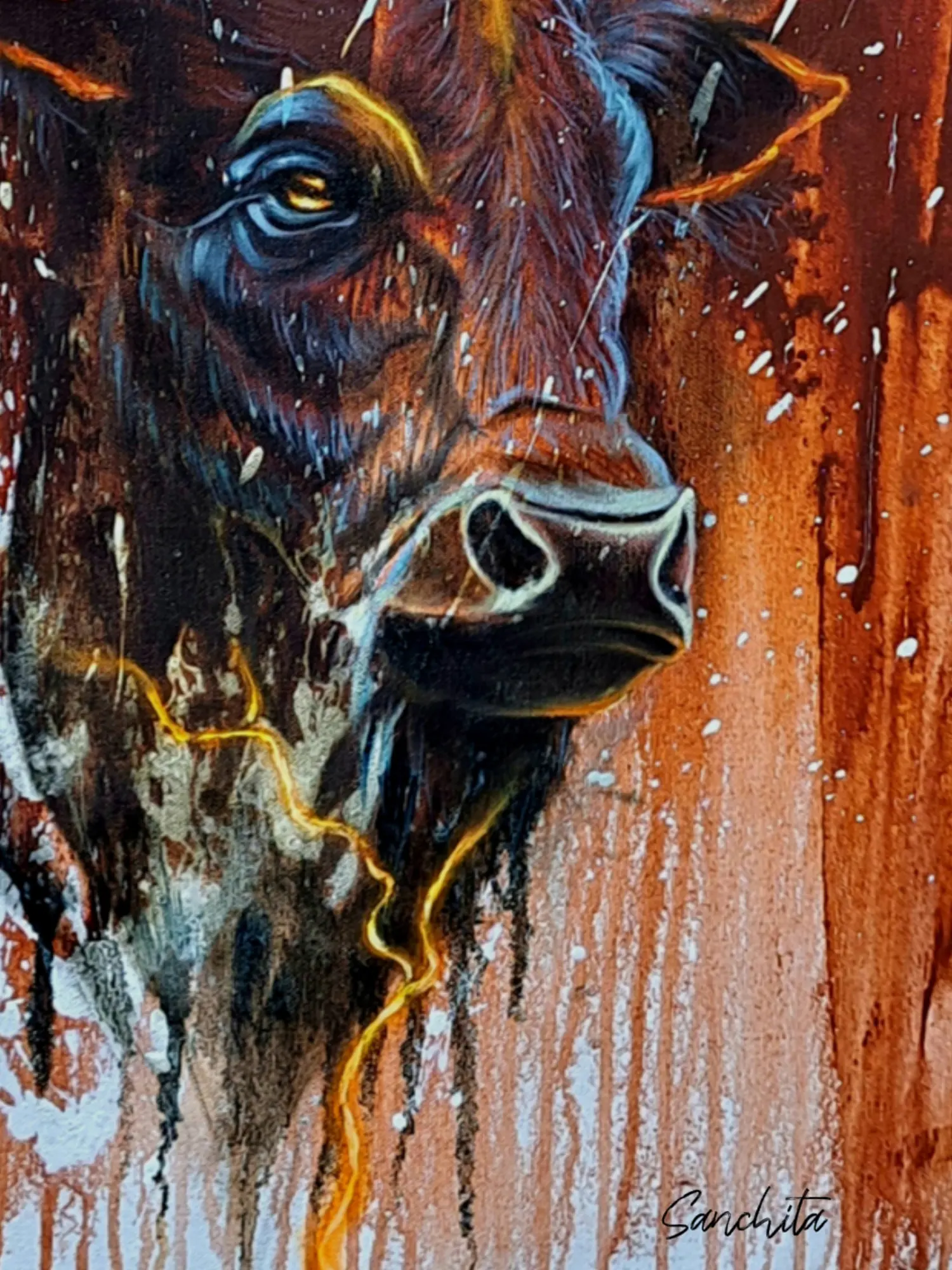 Behold the raw power and untamed beauty captured in this striking acrylic painting of a magnificent bull. Sanchita Agrahari's masterful brushstrokes bring this creature to life, imbuing it with a sense of primal energy and captivating presence. The rich, deep browns and oranges of the bull's coat contrast beautifully with the vibrant, electric yellow streaks that seem to crackle with energy, suggesting a force both powerful and divine. The textured background, a blend of earthy tones and splatter effects, enhances the overall dramatic feel. This piece is more than just a painting; it’s a visceral experience that evokes a potent sense of awe and respect.