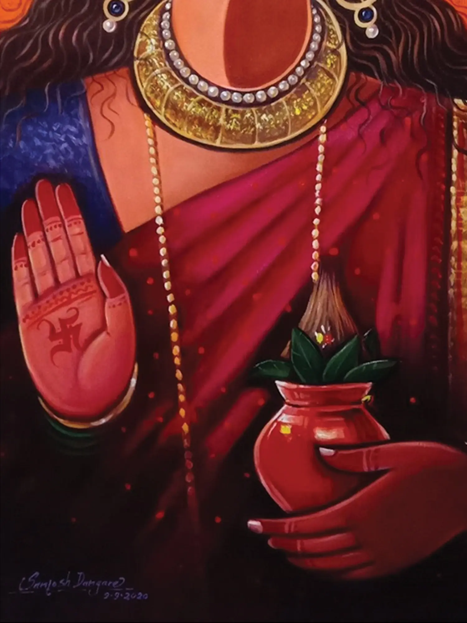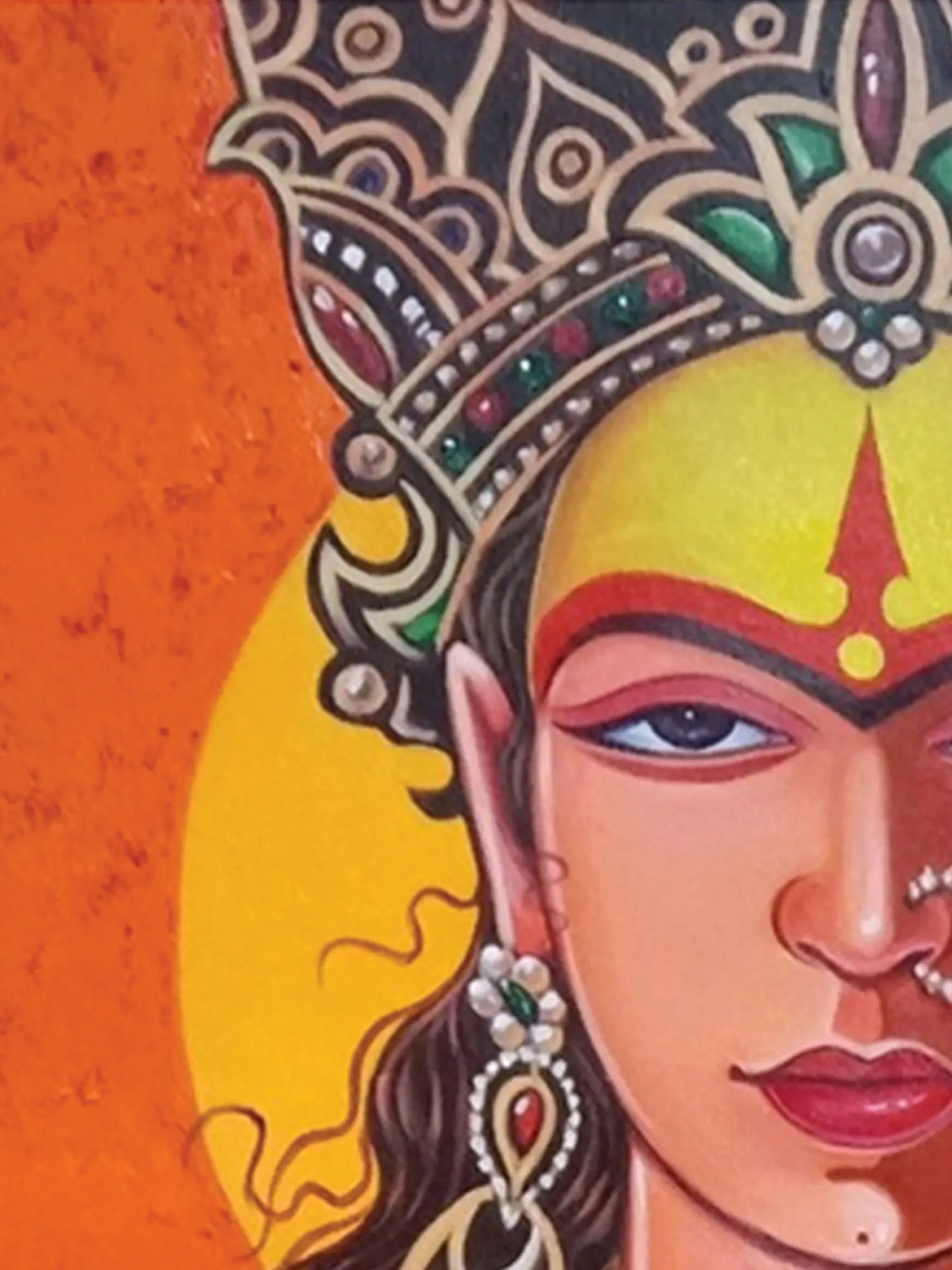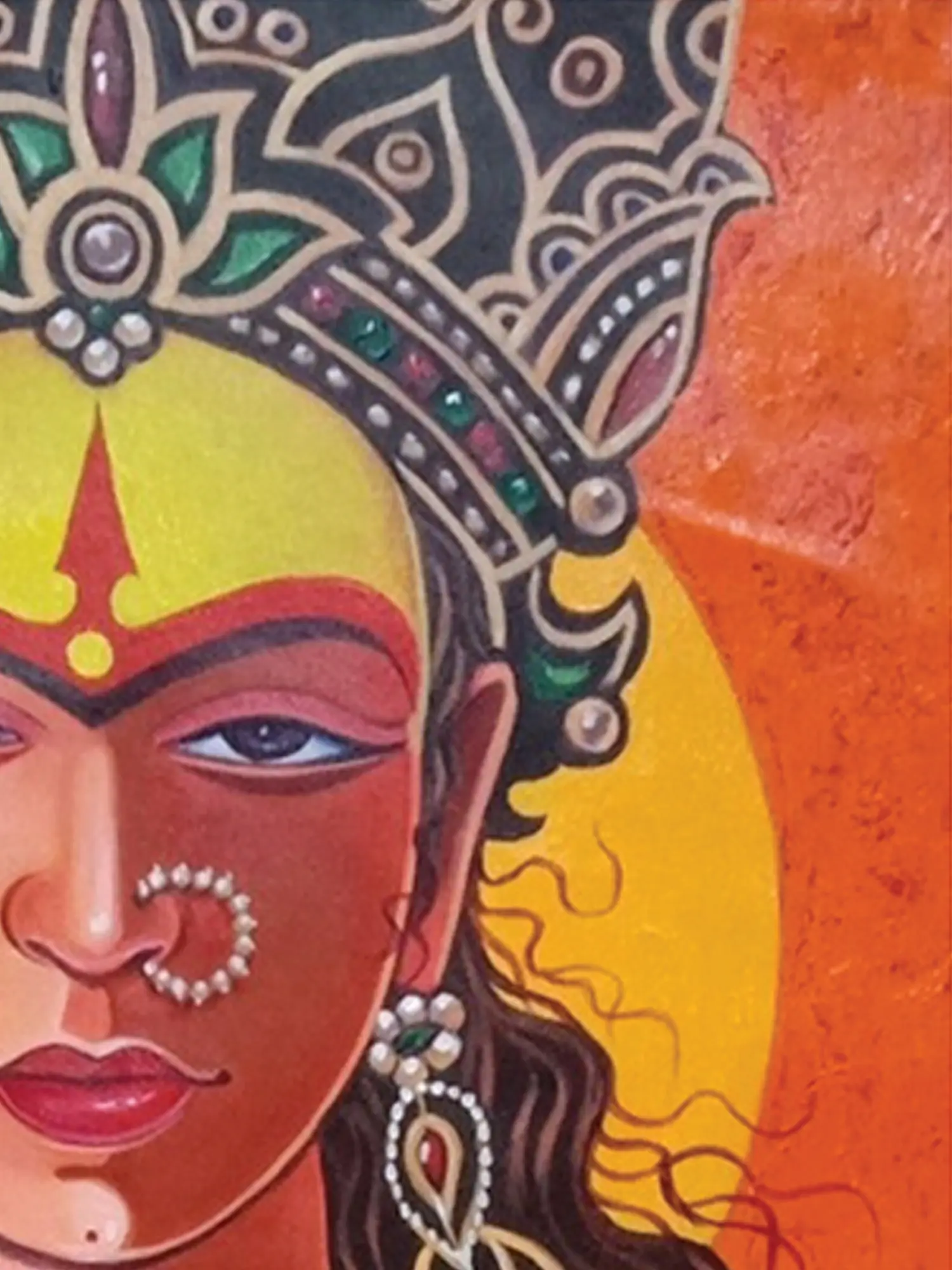 Crafted with passion and precision, this piece showcases the masterful skill of Santosh Narayan Dangare, utilizing vibrant acrylics on a quality canvas. Each brushstroke contributes to the rich texture and depth, from the intricate headdress to the delicate folds of the garment. You’ll appreciate the careful layering and bold color choices that bring the divine subject to life with remarkable dimensionality.