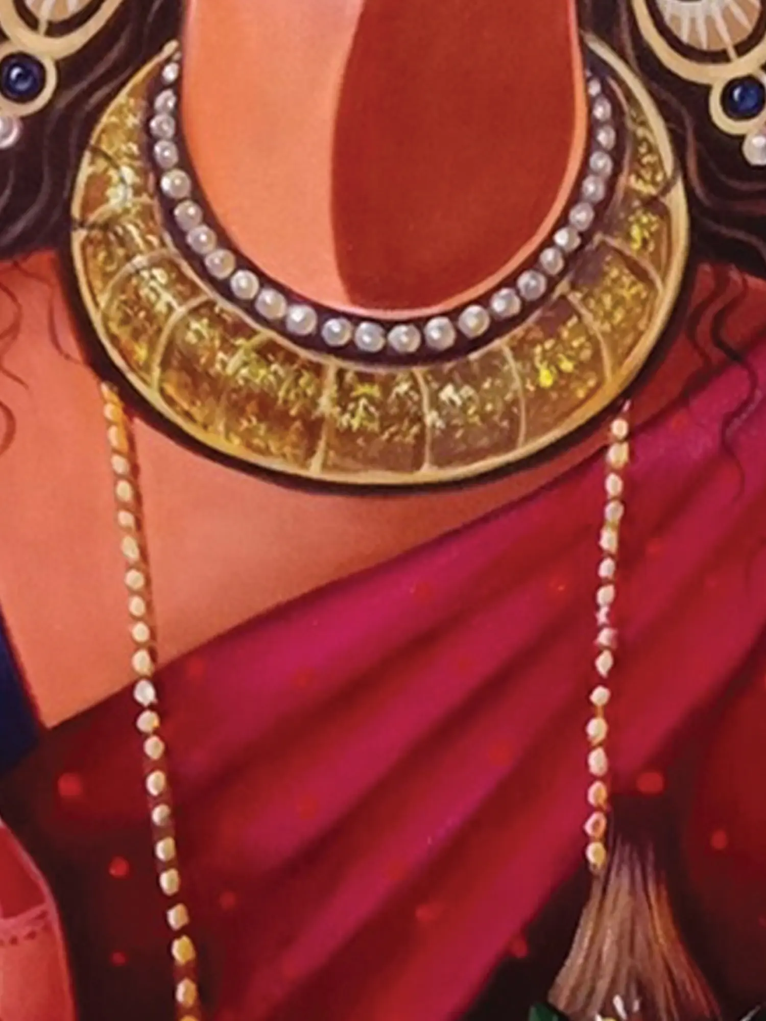The composition unfolds beautifully across a generous 33 inches in height and 16 inches in width, offering a substantial yet elegant statement. Notice the captivating gaze, the elaborate jewelry, and the symbolic kalash held with reverence; these elements are rendered with a discerning eye for detail, creating a visually engaging narrative that draws you closer. The warm, radiant halo behind the central figure further enhances its powerful and benevolent aura.