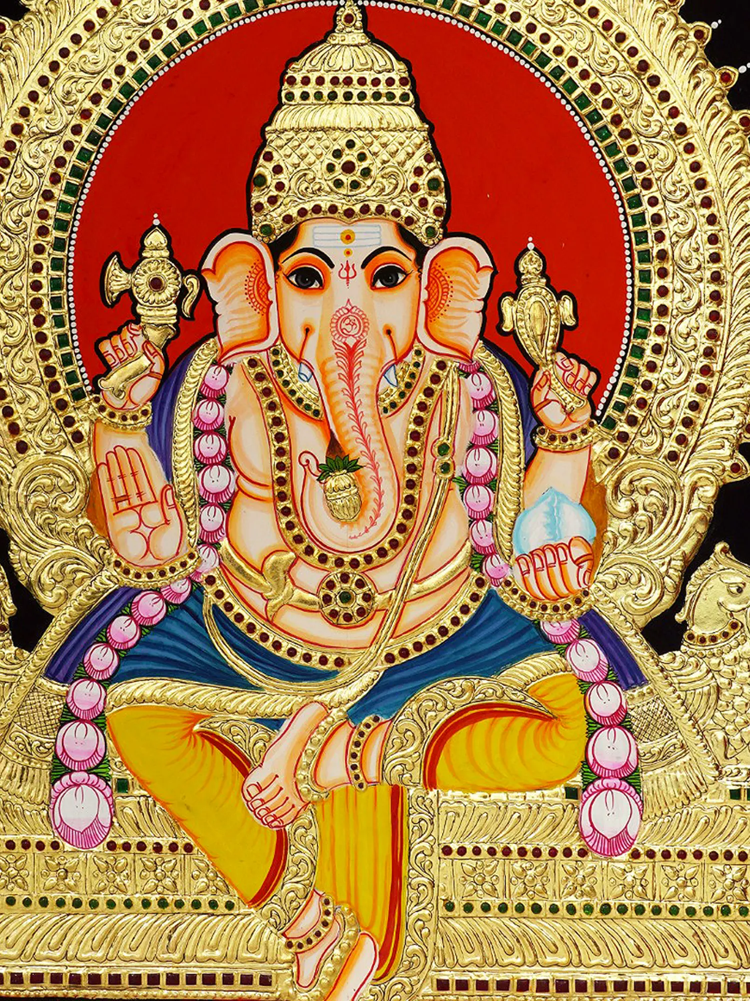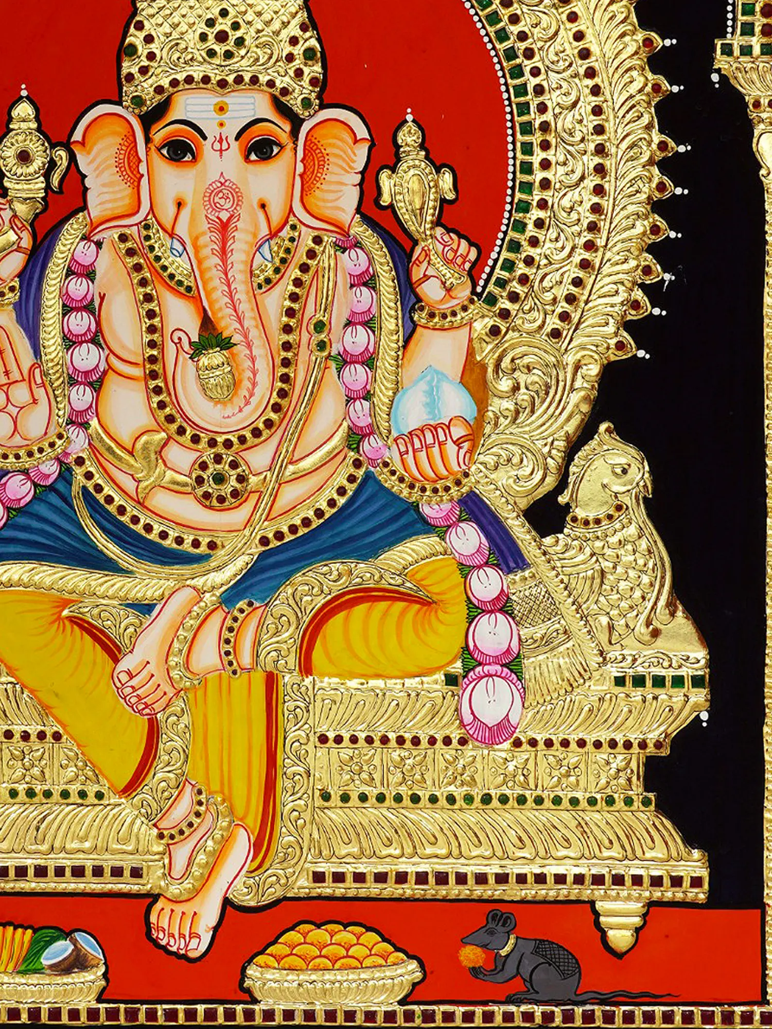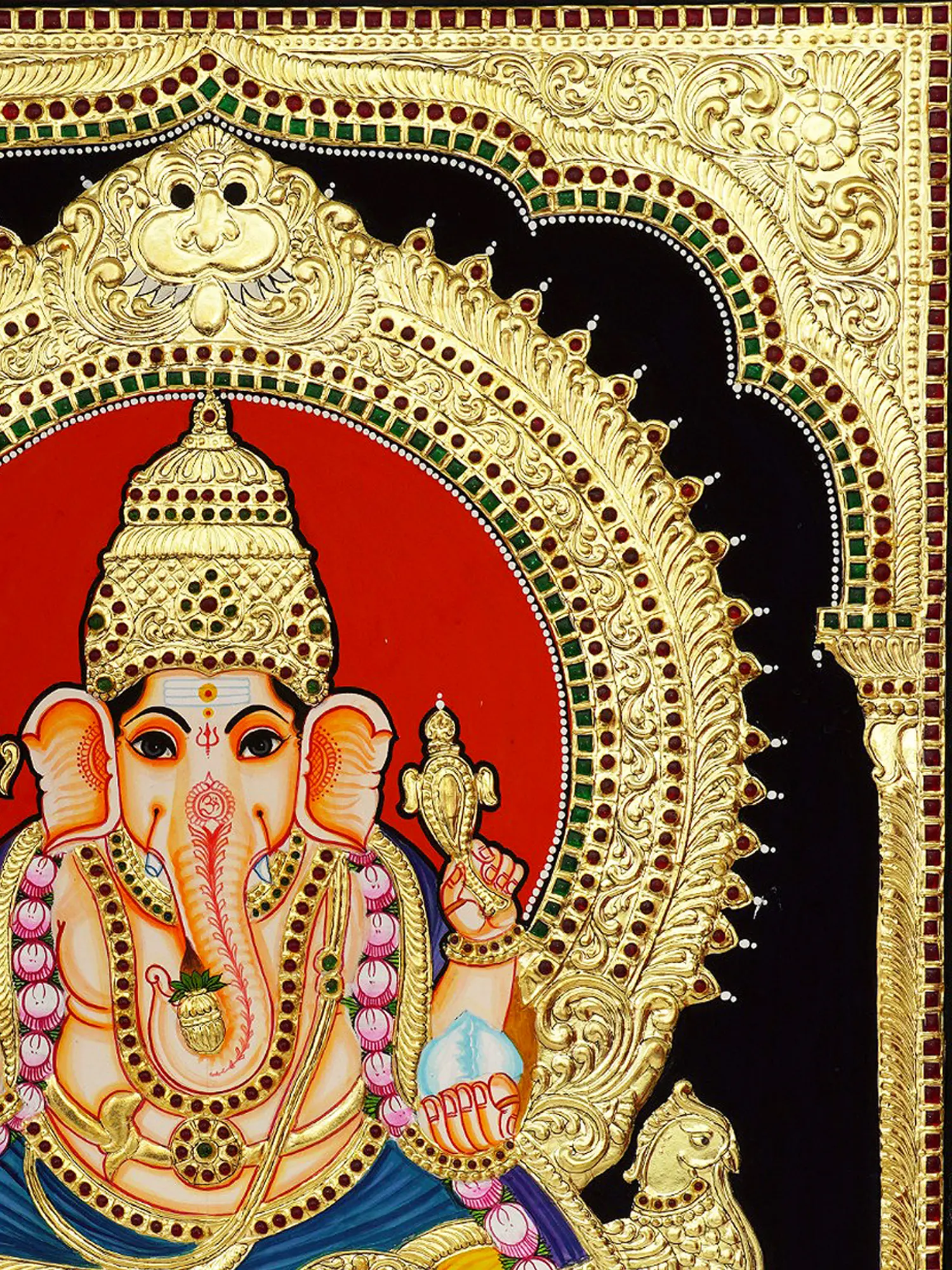 Tanjore paintings are deeply rooted in Hindu mythology, and this depiction of Ganesha draws upon his powerful symbolism as the deity of wisdom, intellect, and good fortune. He is revered as the patron of arts and sciences and is invoked at the beginning of rituals and ceremonies to ensure success. The artistic tradition itself dates back to the 16th century, flourishing under the patronage of the Chola kings, and continues to be a cherished expression of Indian cultural heritage.